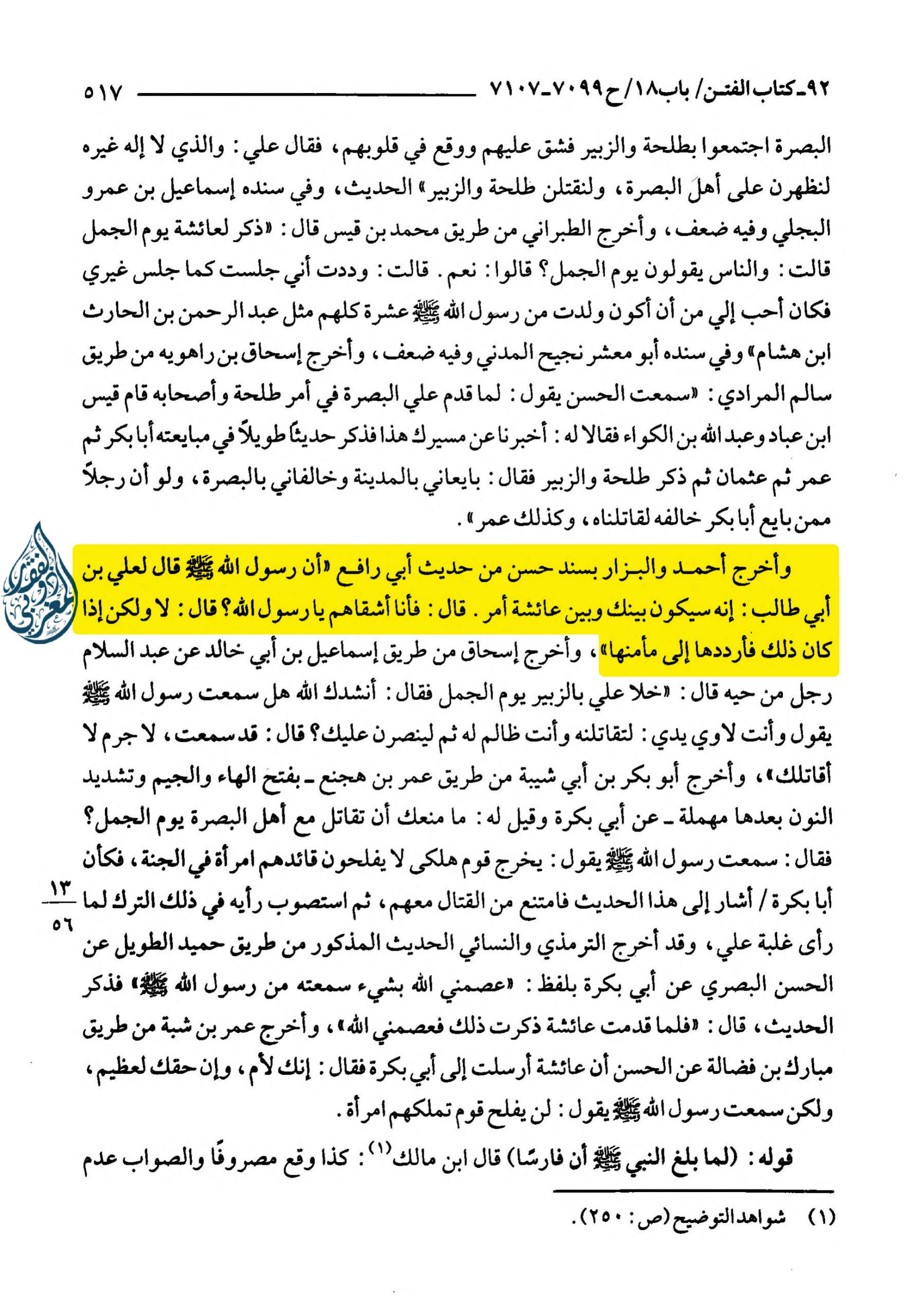 «وأخرج أحمد، والبزار بسند حسن من حديث أبي رافع أن رسول الله صلى الله عليه وسلم قال لعلي بن أبي طالب: إنه ‌سيكون ‌بينك ‌وبين عائشة أمر، قال: فأنا أشقاهم يا رسول الله؟ قال: لا، ولكن إذا كان ذلك فارددها إلى مأمنها.»