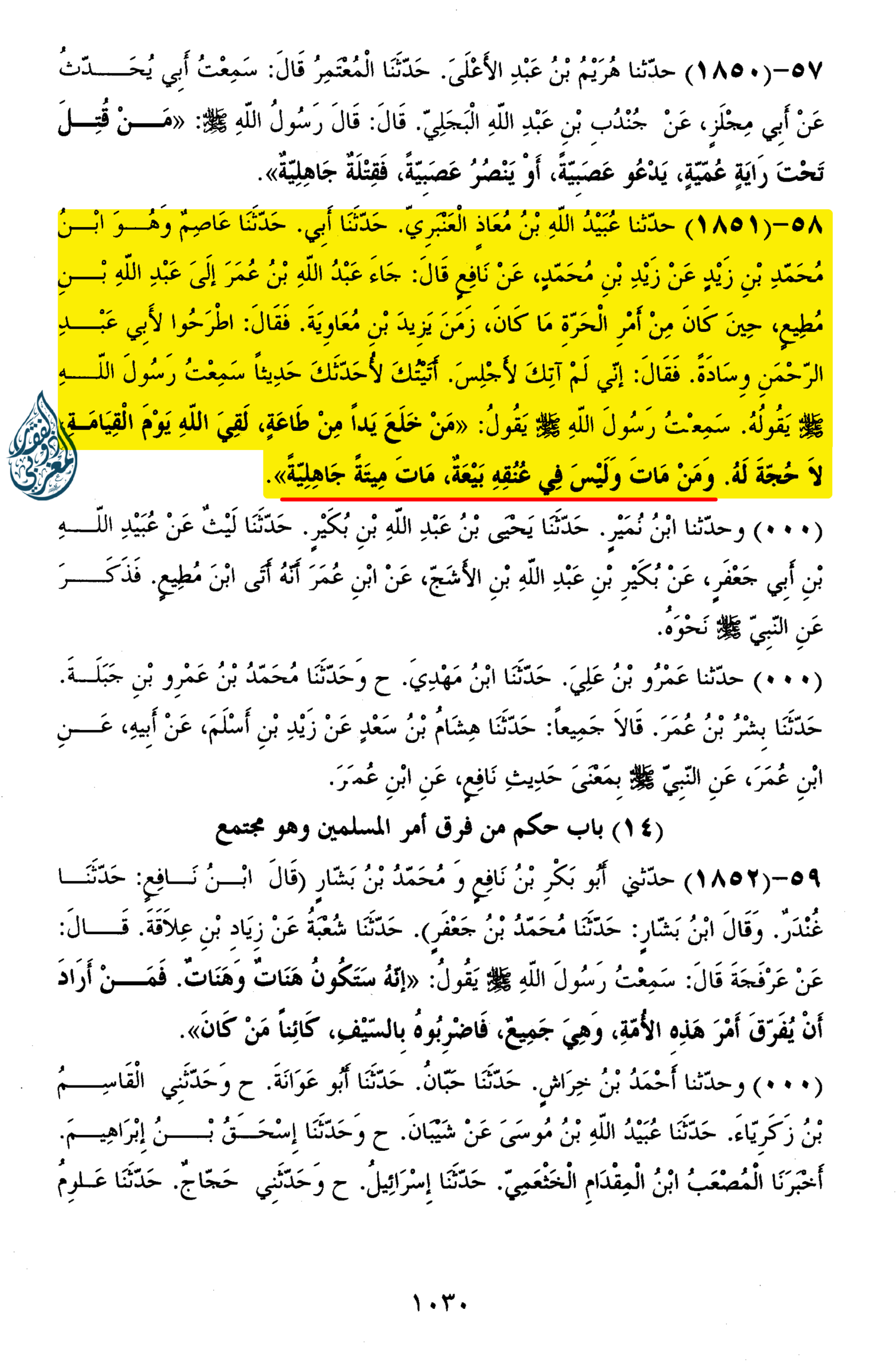 58 – (1851) حَدَّثَنَا عُبَيْدُ اللهِ بْنُ مُعَاذٍ الْعَنْبَرِيُّ ، حَدَّثَنَا أَبِي ، حَدَّثَنَا عَاصِمٌ، (وَهُوَ ابْنُ مُحَمَّدِ بْنِ زَيْدٍ )، عَنْ زَيْدِ بْنِ مُحَمَّدٍ ، عَنْ نَافِعٍ قَالَ: « جَاءَ عَبْدُ اللهِ بْنُ عُمَرَ إِلَى عَبْدِ اللهِ بْنِ مُطِيعٍ حِينَ كَانَ مِنْ أَمْرِ الْحَرَّةِ مَا كَانَ زَمَنَ يَزِيدَ بْنِ مُعَاوِيَةَ، فَقَالَ: اطْرَحُوا لِأَبِي عَبْدِ الرَّحْمَنِ وِسَادَةً، فَقَالَ: إِنِّي لَمْ آتِكَ لِأَجْلِسَ، أَتَيْتُكَ لِأُحَدِّثَكَ حَدِيثًا سَمِعْتُ رَسُولَ اللهِ صلى الله عليه وسلم يَقُولُهُ، سَمِعْتُ رَسُولَ اللهِ صلى الله عليه وسلم يَقُولُ: مَنْ خَلَعَ يَدًا مِنْ طَاعَةٍ لَقِيَ اللهَ يَوْمَ الْقِيَامَةِ لَا حُجَّةَ لَهُ، وَمَنْ مَاتَ وَلَيْسَ فِي عُنُقِهِ بَيْعَةٌ مَاتَ مِيتَةً جَاهِلِيَّةً .»