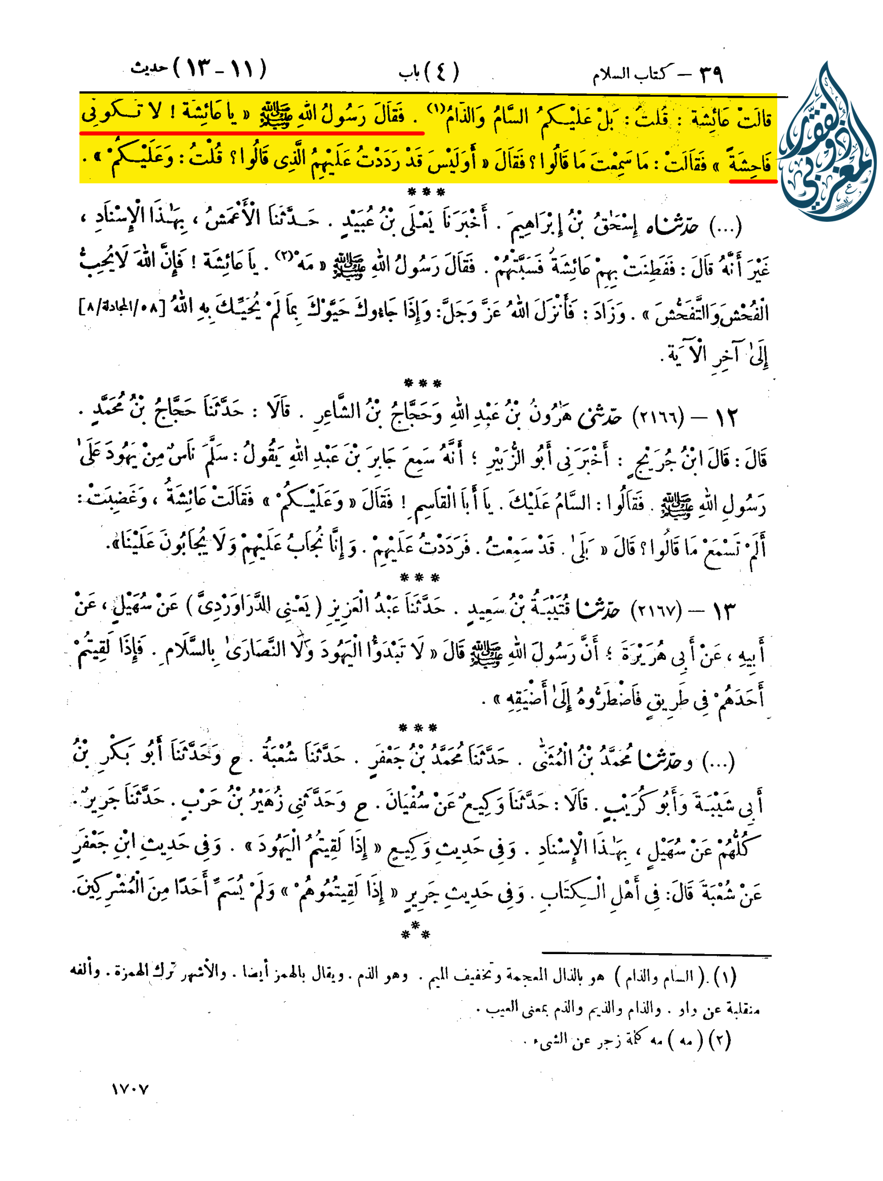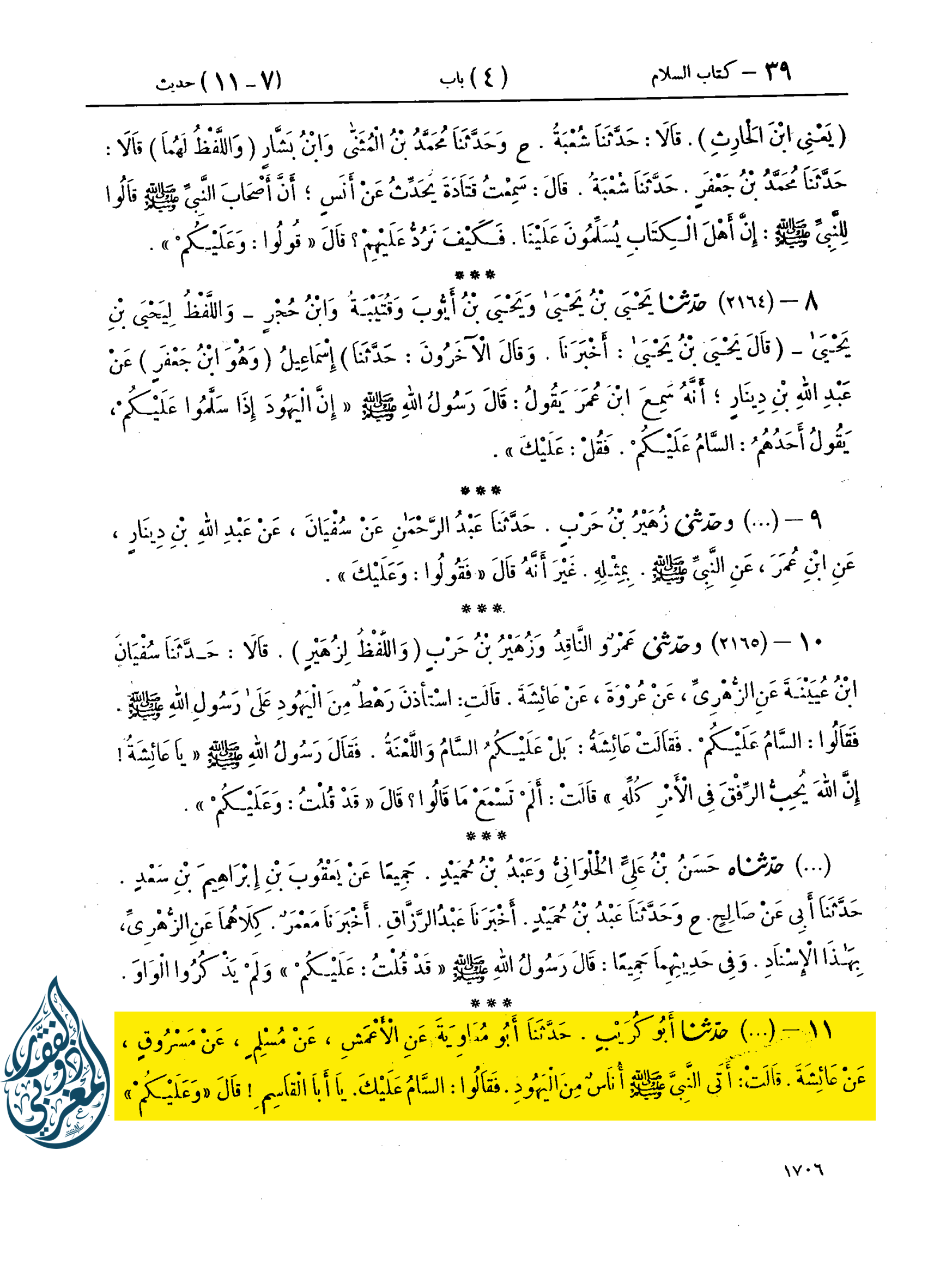 «11 – (2165) حَدَّثَنَا أَبُو كُرَيْبٍ. حَدَّثَنَا أَبُو مُعَاوِيَةَ عنِ الْأَعْمَشِ، عَنْ مُسْلِمٍ، عَنْ مَسْرُوقٍ، عَنْ عَائِشَةَ. قالت: أَتَى النَّبِيَّ صلى الله عليه وسلم أُنَاسٌ مِنْ الْيَهُودِ. فَقَالُوا: السَّامُ عَلَيْكَ. يَا أَبَا الْقَاسِمِ! قَالَ “وَعَلَيْكُمْ”