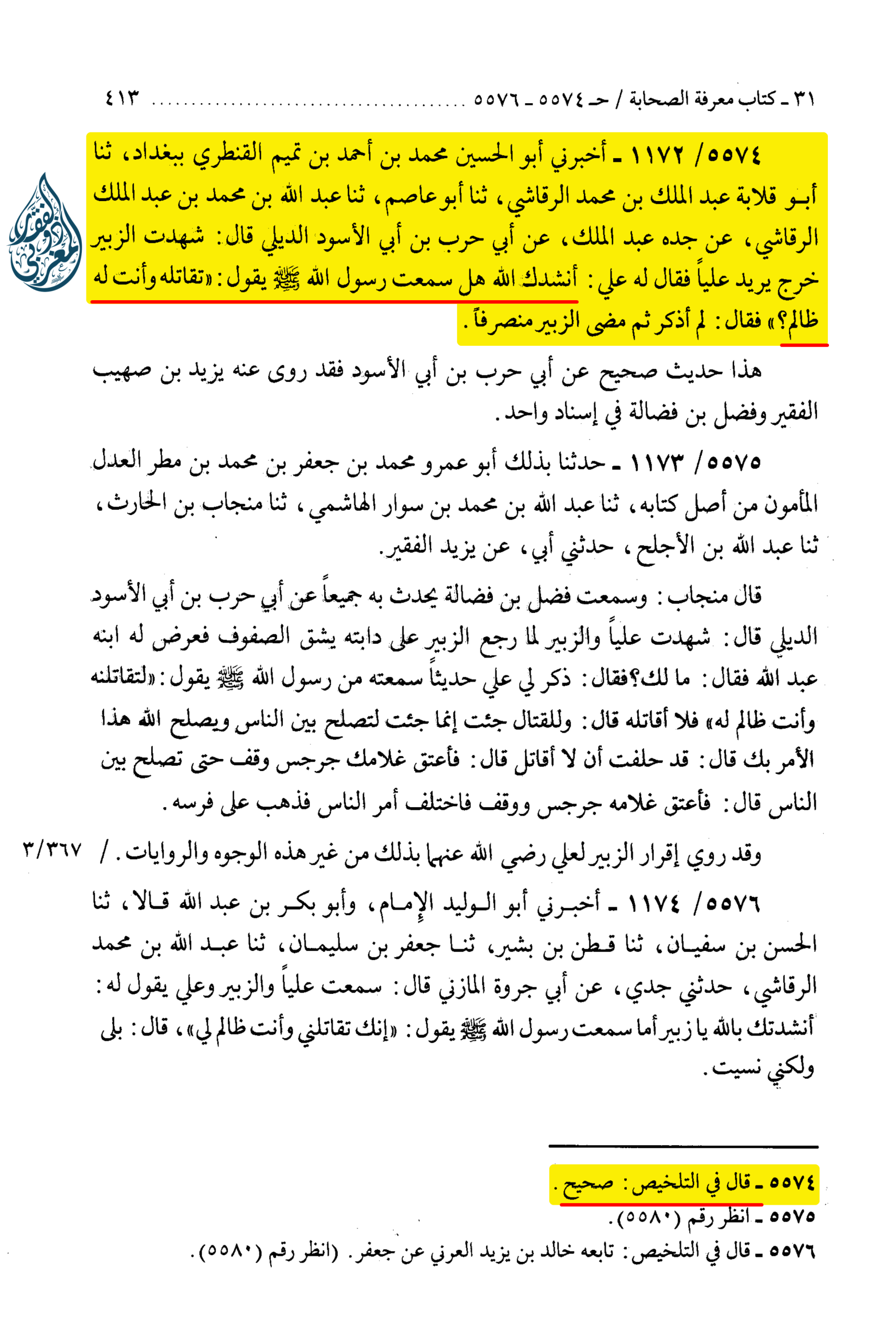 5574 – أَخْبَرَنِي أَبُو الْحُسَيْنِ مُحَمَّدُ بْنُ أَحْمَدَ بْنِ تَمِيمٍ الْقَنْطَرِيُّ، بِبَغْدَادَ، ثَنَا أَبُو قِلَابَةَ عَبْدُ الْمَلِكِ بْنُ مُحَمَّدِ الرَّقَاشِيُّ، ثَنَا أَبُو عَاصِمٍ، ثَنَا عَبْدُ اللَّهِ بْنُ مُحَمَّدِ بْنِ عَبْدِ الْمَلِكِ الرَّقَاشِيُّ، عَنْ جَدِّهِ عَبْدِ الْمَلِكِ، عَنْ أَبِي حَرْبِ بْنِ أَبِي الْأَسْوَدِ الدِّيلِيِّ، قَالَ: شَهِدْتُ الزُّبَيْرَ خَرَجَ يُرِيدُ عَلِيًّا، فَقَالَ لَهُ عَلِيٌّ أَنْشُدُكَ اللَّهَ: هَلْ سَمِعْتَ رَسُولَ اللَّهِ صلى الله عليه وسلم يَقُولُ: «تُقَاتِلُهُ وَأَنْتَ لَهُ ظَالِمٌ» فَقَالَ: لَمْ أَذْكُرْ، ثُمَّ مَضَى الزُّبَيْرُ مُنْصَرِفًا «هَذَا حَدِيثٌ صَحِيحٌ» ، عَنْ أَبِي حَرْبِ بْنِ أَبِي الْأَسْوَدِ فَقَدْ رَوَى عَنْهُ يَزِيدُ بْنُ صُهَيْبٍ الْفَقِيرُ وَفَضَلُ بْنُ فَضَالَةَ فِي إِسْنَادٍ وَاحِدٍ