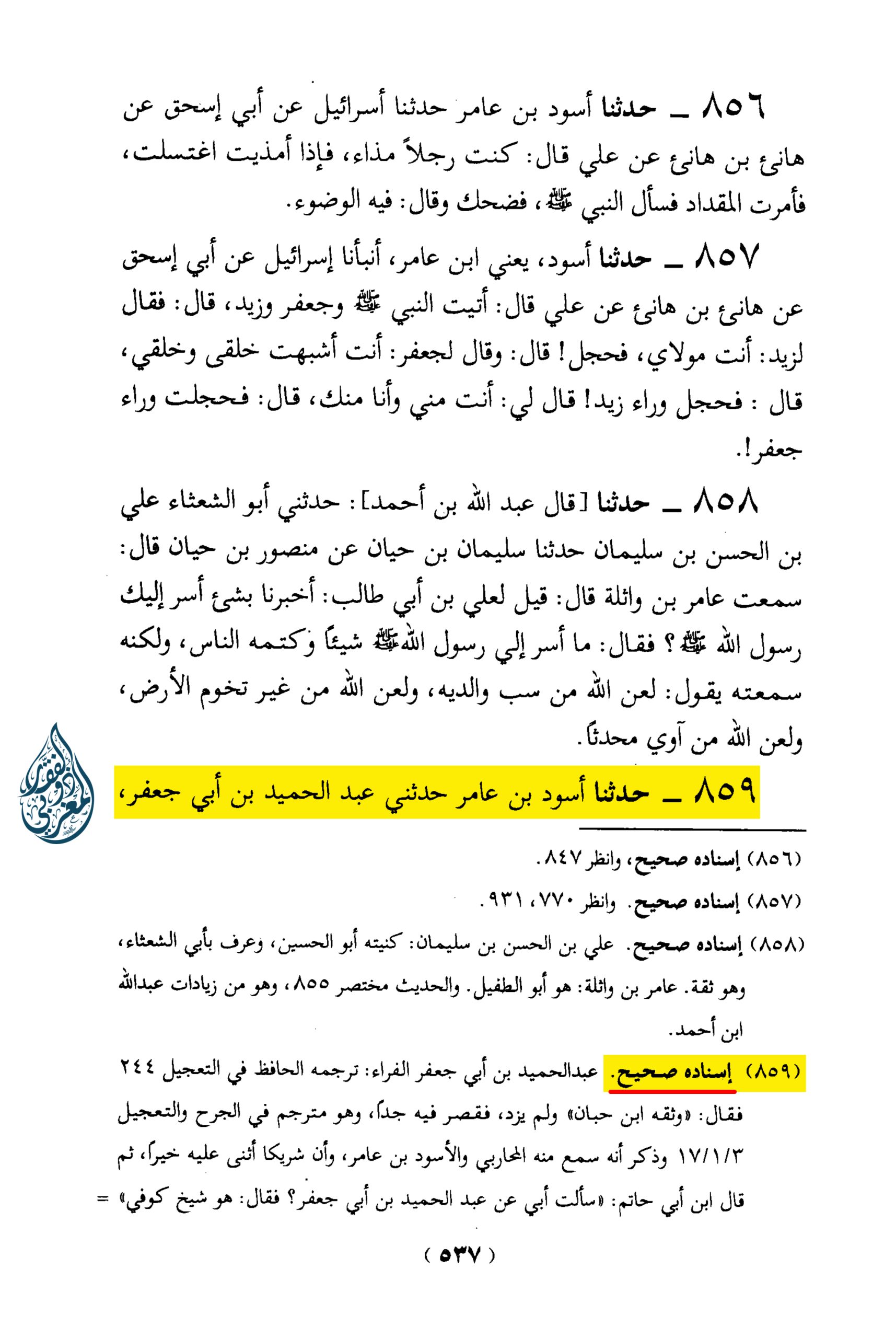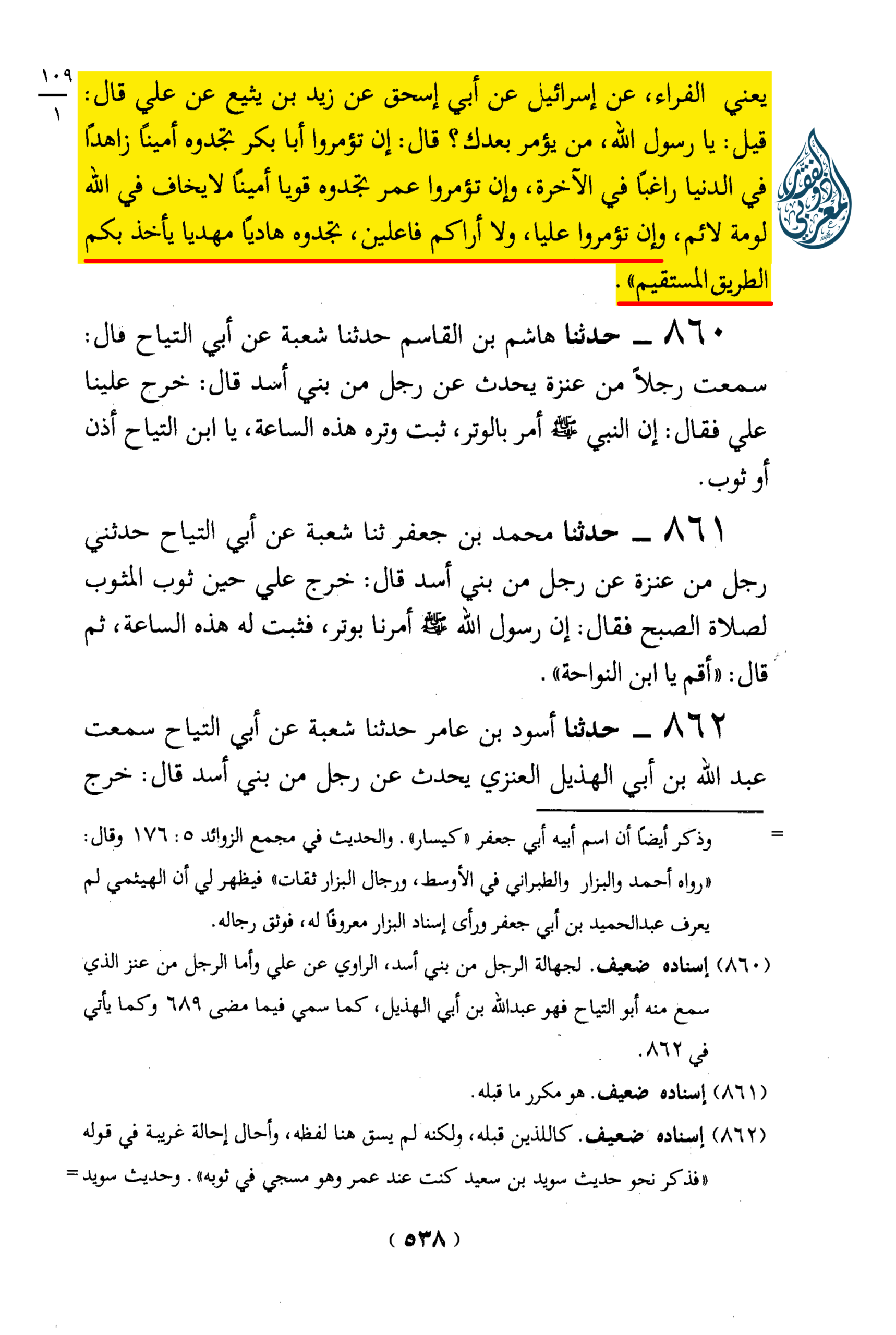 «859 – حدثنا أسود بن عامر حدثنا عبد الحميد بن أبي جعفر، يعني الفراء، عن إسرائيل عن أبي إسحق عن زيد بن يثيع عن علي قال: قيل: يا رسول الله، من يؤمر بعدك؟ قال: إن تؤمروا أبا بكر تجدوه أميناً زاهداً في الدنيا راغباً في الآخرة، وإن تؤمروا عمر تجدوه قويا أميناً لا يخاف في الله لومة لائم، وإن تؤمروا عليا، ولا أراكم فاعلين، تجدوه هادياً مهديا يأخذ بكم الطريق المستقيم”.