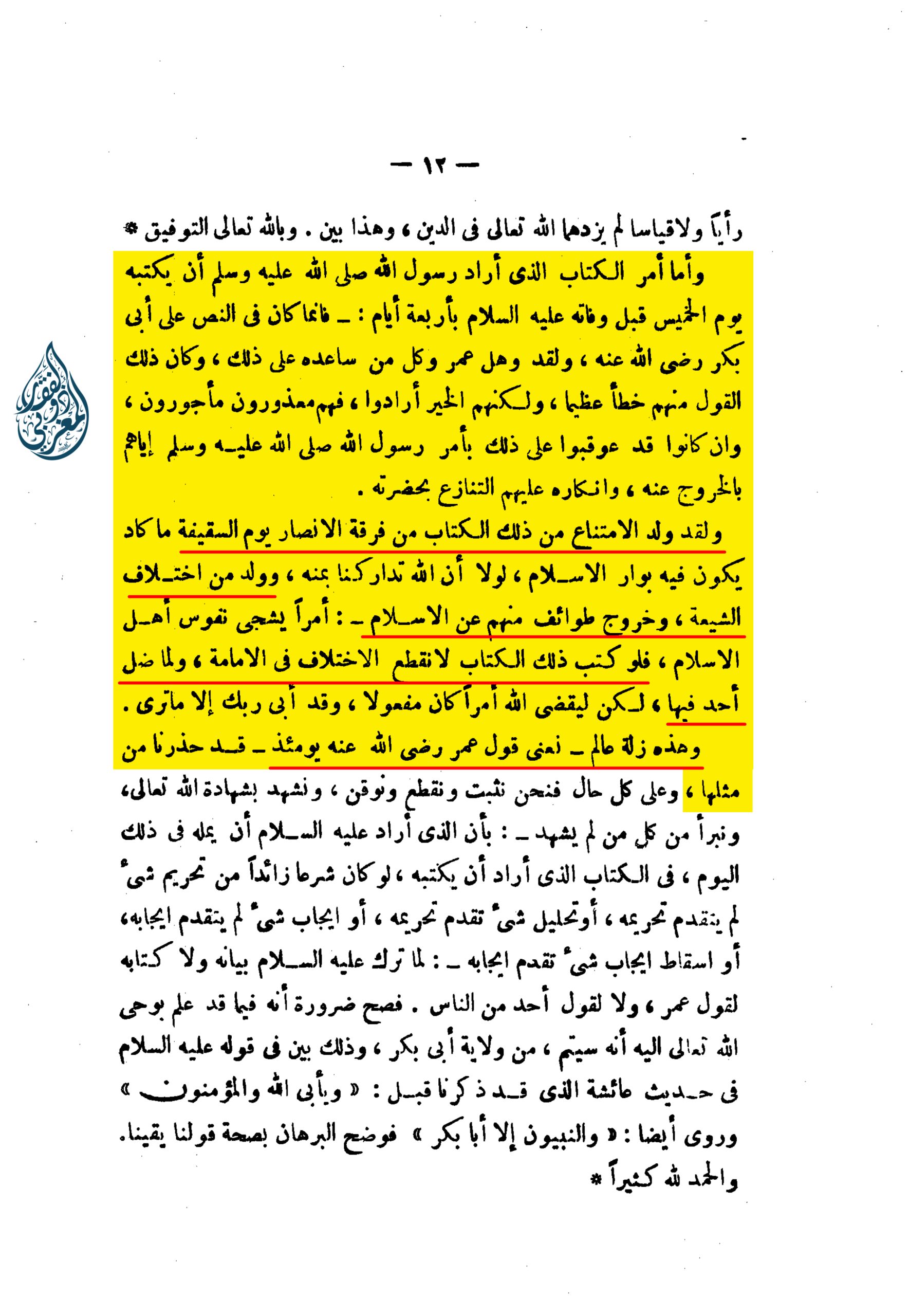 «وأما أمر الكتاب الذي أراد رسول الله صلى الله عليه وسلم أن يكتبه يوم الخميس قبل وفاته صلى الله عليه وسلم بأربعة أيام فإنما كان في النص على أبي بكر رضي الله عنه ولقد وهل عمر وكل من ساعده على ذلك وكان ذلك القول منهم خطأ عظيما ولكنهم الخير أرادوا فهم معذورون مأجورون وإن كانوا قد عوقبوا على ذلك بأمر رسول الله صلى الله عليه وسلم إياهم بالخروج عنه وإنكاره عليهم التنازع بحضرته ولقد ولد الامتناع من ذلك الكتاب من فرقة الأنصار يوم السقيفة ما كاد يكون فيه بوار الإسلام لولا أن الله تداركنا بمنه وولد من اختلاف الشيعة وخروج طوائف منهم عن الإسلام أمرا يشجي نفوس أهل الإسلام فلو كتب ذلك الكتاب لانقطع الاختلاف في الإمامة ولما ضل أحد فيها لكن يقضي الله أمرا كان مفعولا وقد أبى ربك إلا ما ترى وهذه زلة عالم نعني قول عمر