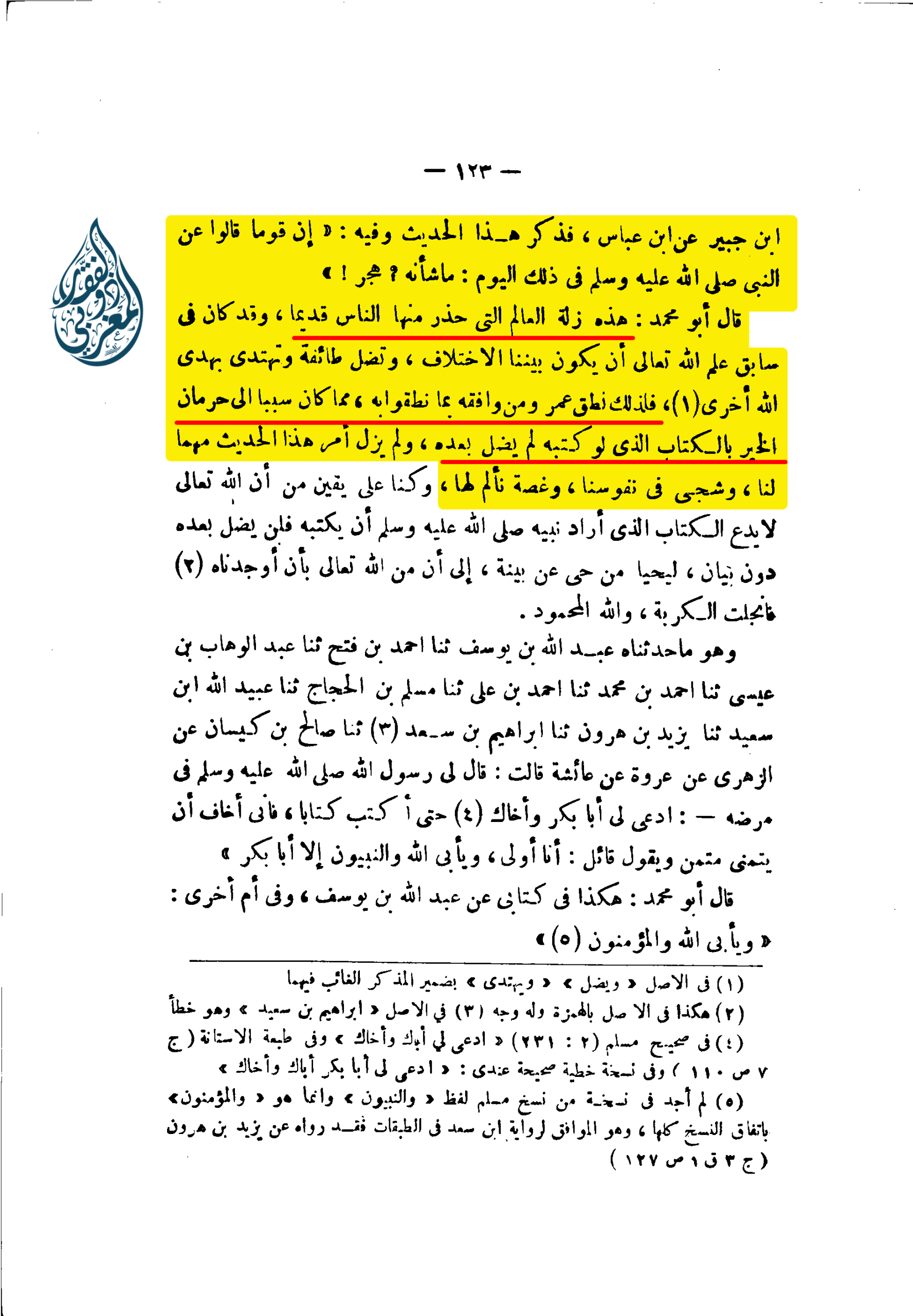 «بن جبير عن ابن عباس فذكر الحديث وفيه إن قوما قالوا عن النبي صلى الله عليه وسلم في ذلك اليوم ما شأنه هجر قال أبو محمد هذه زلة العالم التي حذر منها الناس قديما وقد كان في سابق علم الله تعالى أن يكون بيننا الاختلاف وتضل طائفة وتهتدي بهدى الله أخرى فلذلك نطق عمر ومن وافقه بما نطقوا به مما كان سببا إلى حرمان الخير بالكتاب الذي لو