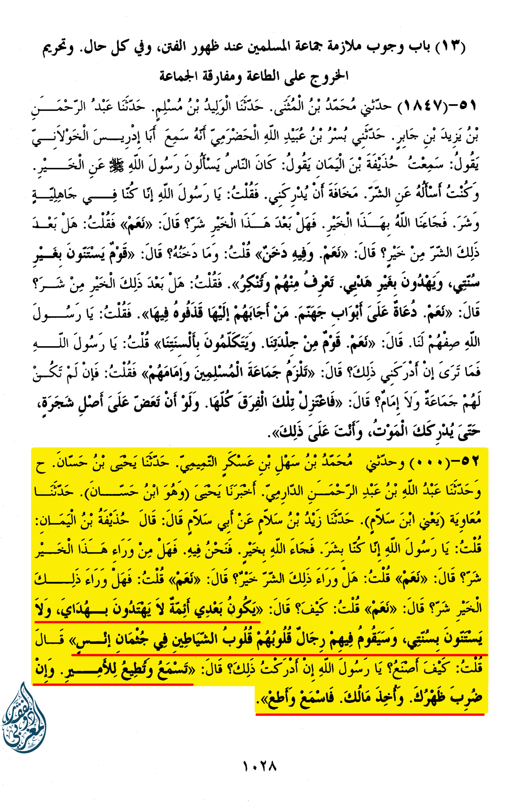 52 – (1847) وَحَدَّثَنِي مُحَمَّدُ بْنُ سَهْلِ بْنِ عَسْكَرٍ التَّمِيمِيُّ ، حَدَّثَنَا يَحْيَى بْنُ حَسَّانَ . (ح) وَحَدَّثَنَا عَبْدُ اللهِ بْنُ عَبْدِ الرَّحْمَنِ الدَّارِمِيُّ ، أَخْبَرَنَا يَحْيَى، (وَهُوَ ابْنُ حَسَّانَ )، حَدَّثَنَا مُعَاوِيَةُ، (يَعْنِي ابْنَ سَلَّامٍ )، حَدَّثَنَا زَيْدُ بْنُ سَلَّامٍ ، عَنْ أَبِي سَلَّامٍ قَالَ: قَالَ حُذَيْفَةُ بْنُ الْيَمَانِ: « قُلْتُ: يَا رَسُولَ اللهِ، إِنَّا كُنَّا بِشَرٍّ فَجَاءَ اللهُ بِخَيْرٍ فَنَحْنُ فِيهِ، فَهَلْ مِنْ وَرَاءِ هَذَا الْخَيْرِ شَرٌّ؟ قَالَ: نَعَمْ. قُلْتُ: هَلْ وَرَاءَ ذَلِكَ الشَّرِّ خَيْرٌ؟ قَالَ: نَعَمْ. قُلْتُ: فَهَلْ وَرَاءَ ذَلِكَ الْخَيْرِ شَرٌّ؟ قَالَ: نَعَمْ. قُلْتُ: كَيْفَ؟ قَالَ: يَكُونُ بَعْدِي أَئِمَّةٌ لَا يَهْتَدُونَ بِهُدَايَ، وَلَا يَسْتَنُّونَ بِسُنَّتِي، وَسَيَقُومُ فِيهِمْ رِجَالٌ قُلُوبُهُمْ قُلُوبُ الشَّيَاطِينِ فِي جُثْمَانِ إِنْسٍ. قَالَ: قُلْتُ: كَيْفَ أَصْنَعُ يَا رَسُولَ اللهِ إِنْ أَدْرَكْتُ ذَلِكَ؟ قَالَ: تَسْمَعُ وَتُطِيعُ لِلْأَمِيرِ، وَإِنْ ضُرِبَ ظَهْرُكَ، وَأُخِذَ مَالُكَ، فَاسْمَعْ وَأَطِعْ .»