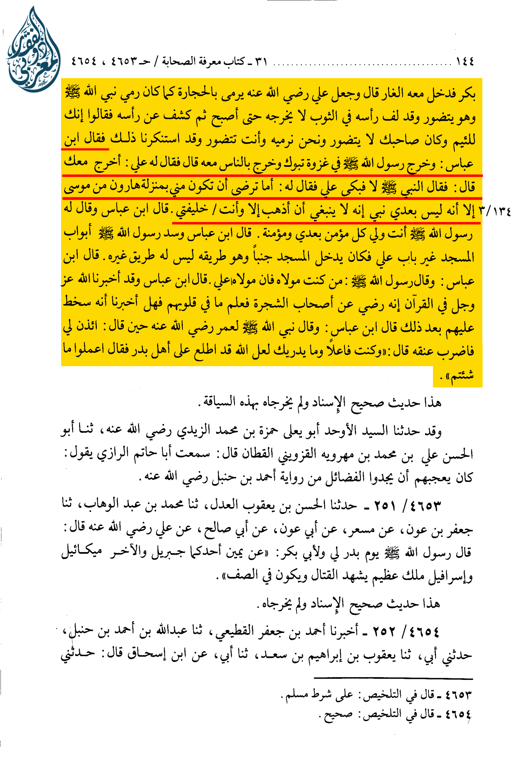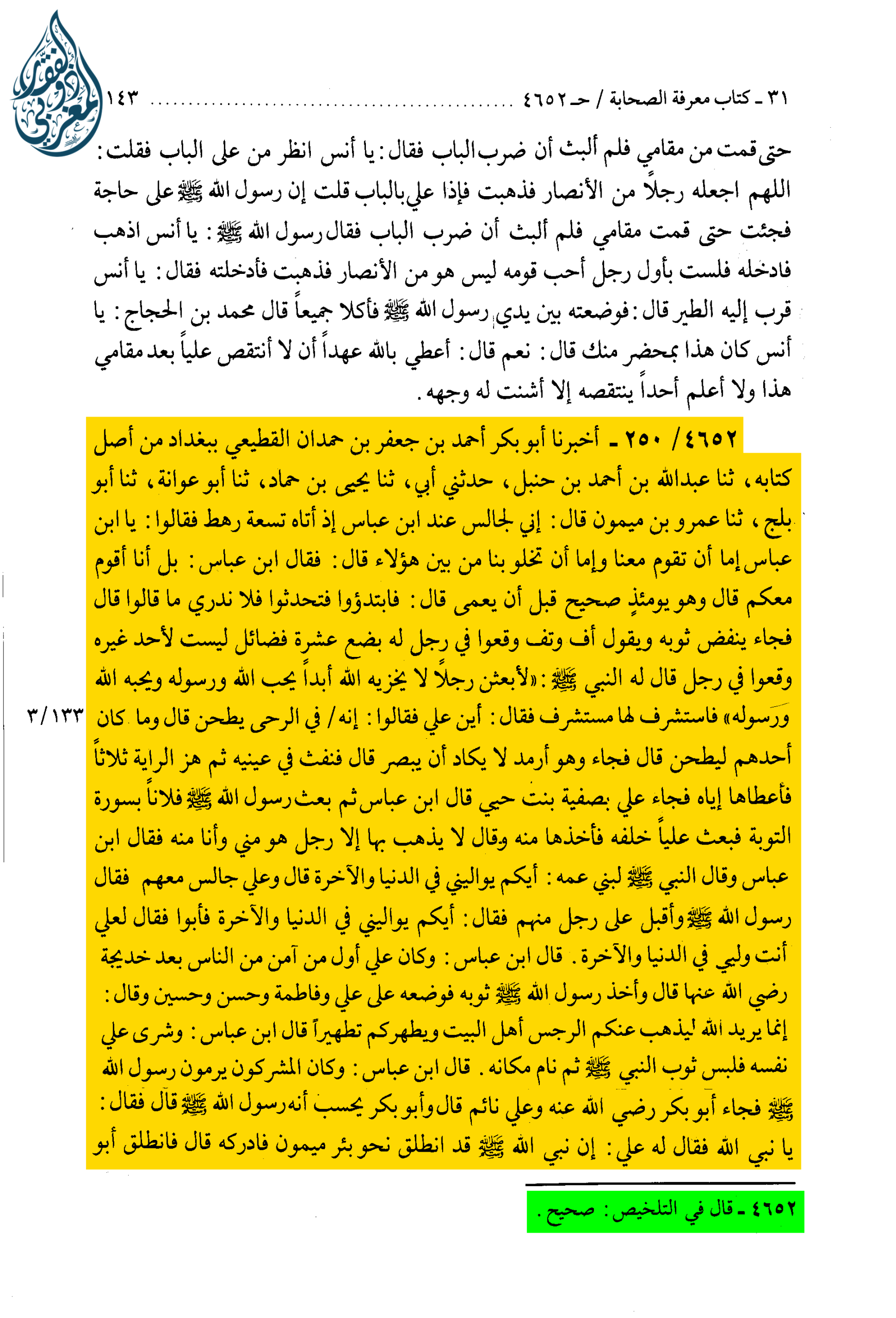 4652 – أَخْبَرَنَا أَبُو بَكْرٍ أَحْمَدُ بْنُ جَعْفَرِ بْنِ حَمْدَانَ الْقَطِيعِيُّ، بِبَغْدَادَ مِنْ أَصْلِ كِتَابِهِ، ثنا عَبْدُ اللَّهِ بْنُ أَحْمَدَ بْنِ حَنْبَلٍ، حَدَّثَنِي أَبِي، ثنا يَحْيَى بْنُ حَمَّادٍ، ثنا أَبُو عَوَانَةَ، ثنا أَبُو بَلْجٍ، ثنا عَمْرُو بْنُ مَيْمُونٍ، قَالَ: إِنِّي لَجَالِسٌ عِنْدَ ابْنِ عَبَّاسٍ، إِذْ أَتَاهُ تِسْعَةُ رَهْطٍ، فَقَالُوا: يَا ابْنَ عَبَّاسٍ، إِمَّا أَنْ تَقُومَ مَعَنَا، وَإِمَّا أَنْ تَخْلُوَ بِنَا مِنْ بَيْنِ هَؤُلَاءِ، قَالَ: فَقَالَ ابْنُ عَبَّاسٍ: بَلْ أَنَا أَقُومُ مَعَكُمْ، قَالَ: وَهُوَ يَوْمَئِذٍ صَحِيحٌ قَبْلَ أَنْ يَعْمَى، قَالَ: فَابْتَدَءُوا فَتَحَدَّثُوا فَلَا نَدْرِي مَا قَالُوا: قَالَ: فَجَاءَ يَنْفُضُ ثَوْبَهُ وَيَقُولُ: أُفٍّ وَتُفٍّ وَقَعُوا فِي رَجُلٍ لَهُ بِضْعَ عَشْرَةَ فَضَائِلَ لَيْسَتْ لِأَحَدٍ غَيْرَهُ، وَقَعُوا فِي رَجُلٍ قَالَ لَهُ النَّبِيُّ صلى الله عليه وسلم: «لَأَبْعَثَنَّ رَجُلًا لَا يُخْزِيهِ اللَّهُ أَبَدًا، يُحِبُّ اللَّهَ وَرَسُولَهُ، وَيُحِبُّهُ اللَّهُ وَرَسُولُهُ» فَاسْتَشْرَفَ لَهَا مُسْتَشْرِفٌ فَقَالَ: «أَيْنَ عَلِيٌّ؟» فَقَالُوا: إِنَّهُ فِي الرَّحَى يَطْحَنُ، قَالَ: «وَمَا كَانَ أَحَدُهُمْ لِيَطْحَنَ» ، قَالَ: فَجَاءَ وَهُوَ أَرْمَدُ لَا يَكَادُ أَنْ يُبْصِرُ، قَالَ: فَنَفَثَ فِي عَيْنَيْهِ، ثُمَّ هَزَّ الرَّايَةَ ثَلَاثًا فَأَعْطَاهَا إِيَّاهُ، فَجَاءَ عَلِيٌّ بِصَفِيَّةَ بِنْتِ حُيَيٍّ، قَالَ ابْنُ عَبَّاسٍ: ثُمَّ بَعَثَ رَسُولُ اللَّهِ صلى الله عليه وسلم فُلَانًا بِسُورَةِ التَّوْبَةِ، فَبَعَثَ عَلِيًّا خَلْفَهُ فَأَخَذَهَا مِنْهُ، وَقَالَ: «لَا يَذْهَبُ بِهَا إِلَّا رَجُلٌ هُوَ مِنِّي وَأَنَا مِنْهُ» ، فَقَالَ ابْنُ عَبَّاسٍ: وَقَالَ النَّبِيُّ صلى الله عليه وسلم لِبَنِي عَمِّهِ: «أَيُّكُمْ يُوَالِينِي فِي الدُّنْيَا وَالْآخِرَةِ؟» قَالَ: وَعَلِيٌّ جَالِسٌ مَعَهُمْ، فَقَالَ رَسُولُ اللَّهِ صلى الله عليه وسلم وَأَقْبَلَ عَلَى رَجُلٍ مِنْهُمْ، فَقَالَ: «أَيُّكُمْ يُوَالِينِي فِي الدُّنْيَا وَالْآخِرَةِ؟» فَأَبَوْا، فَقَالَ لِعَلِيٍّ: «أَنْتَ وَلِيِّي فِي الدُّنْيَا وَالْآخِرَةِ» ، قَالَ ابْنُ عَبَّاسٍ: وَكَانَ عَلِيٌّ أَوَّلَ مَنْ آمَنَ مِنَ النَّاسِ بَعْدَ خَدِيجَةَ رضي الله عنها، قَالَ: وَأَخَذَ رَسُولُ اللَّهِ صلى الله عليه وسلم ثَوْبَهُ فَوَضَعَهُ عَلَى عَلِيٍّ وَفَاطِمَةَ وَحَسَنٍ وَحُسَيْنٍ وَقَالَ: ” {إِنَّمَا يُرِيدُ اللَّهُ لِيُذْهِبَ عَنْكُمُ الرِّجْسَ أَهْلَ الْبَيْتِ وَيُطَهِّرَكُمْ تَطْهِيرًا} [الأحزاب: 33] ، قَالَ ابْنُ عَبَّاسٍ: «وَشَرَى عَلِيٌّ نَفْسَهُ، فَلَبِسَ ثَوْبَ النَّبِيِّ صلى الله عليه وسلم، ثُمَّ نَامَ فِي مَكَانِهِ» ، قَالَ: ابْنُ عَبَّاسٍ، ” وَكَانَ الْمُشْرِكُونَ يَرْمُونَ رَسُولَ اللَّهِ صلى الله عليه وسلم، فَجَاءَ أَبُو بَكْرٍ رضي الله عنه وَعَلِيٌّ نَائِمٌ، قَالَ: وَأَبُو بَكْرٍ يَحْسَبُ أَنَّهُ رَسُولُ اللَّهِ صلى الله عليه وسلم، قَالَ: فَقَالَ: يَا نَبِيَّ اللَّهِ، فَقَالَ لَهُ عَلِيٌّ: إِنَّ نَبِيَّ اللَّهِ صلى الله عليه وسلم قَدِ انْطَلَقَ نَحْوَ بِئْرِ مَيْمُونٍ فَأَدْرَكَهُ، قَالَ: فَانْطَلَقَ أَبُو بَكْرٍ فَدَخَلَ مَعَهُ الْغَارَ، قَالَ: وَجَعَلَ عَلِيٌّ رضي الله عنه يَرْمِي بِالْحِجَارَةِ كَمَا كَانَ رَمْيُ نَبِيِّ اللَّهِ صلى الله عليه وسلم وَهُوَ يَتَضَوَّرُ، وَقَدْ لَفَّ رَأْسَهُ فِي الثَّوْبِ لَا يُخْرِجُهُ حَتَّى أَصْبَحَ، ثُمَّ كَشَفَ عَنْ رَأْسِهِ فَقَالُوا: إِنَّكَ لَلَئِيمٌ وَكَانَ صَاحِبُكَ لَا يَتَضَوَّرُ وَنَحْنُ نَرْمِيهِ، وَأَنْتَ تَتَضَوَّرُ وَقَدِ اسْتَنْكَرْنَا ذَلِكَ “، فَقَالَ ابْنُ عَبَّاسٍ: وَخَرَجَ رَسُولُ اللَّهِ صلى الل