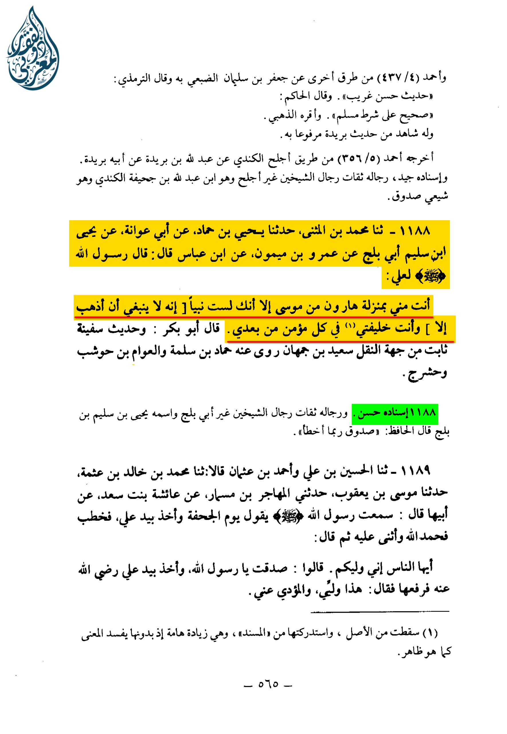 ١١٨٨ – ثنا مُحَمَّدُ بْنُ الْمُثَنَّى، حَدَّثَنَا يَحْيَى بْنُ حَمَّادٍ، عَنْ أَبِي عَوَانَةَ، عَنْ يَحْيَى بْنِ سُلَيْمٍ أَبِي بَلْجٍ، عَنْ عَمْرِو بْنِ مَيْمُونٍ، عَنِ ابْنِ عَبَّاسٍ، قَالَ: قَالَ رَسُولُ اللَّهِ صَلَّى اللهُ عَلَيْهِ وَسَلَّمَ لِعَلِيٍّ: «أَنْتَ مِنِّي بِمَنْزِلَةِ هَارُونَ مِنْ مُوسَى، إِلَّا أَنَّكَ لَسْتَ نَبِيًّا، إِنَّهُ لَا يَنْبَغِي أَنْ أَذْهَبَ إِلَّا وَأَنْتَ خَلِيفَتِي فِي كُلِّ مُؤْمِنٍ مِنْ بَعْدِي»