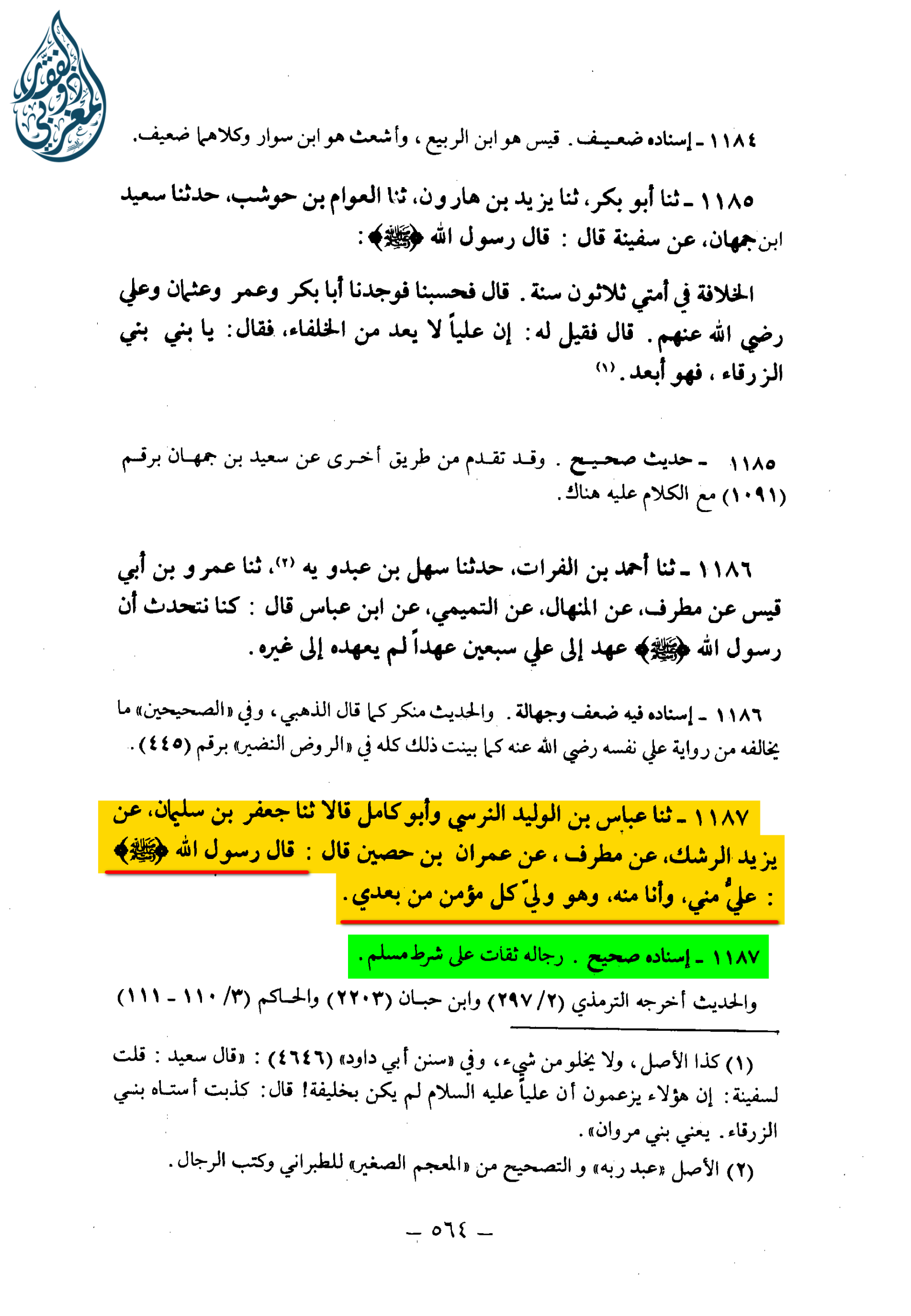 ١١٨٧ – ثنا عَبَّاسُ بْنُ الْوَلِيدِ النَّرْسِيُّ، وَأَبُو كَامِلٍ، قَالَا: ثنا جَعْفَرُ بْنُ سُلَيْمَانَ، عَنْ يَزِيدَ الرِّشْكِ، عَنْ مُطَرِّفٍ، عَنْ عِمْرَانَ بْنِ حُصَيْنٍ، قَالَ: قَالَ رَسُولُ اللَّهِ صَلَّى اللهُ عَلَيْهِ وَسَلَّمَ: «عَلِيٌّ مِنِّي، وَأَنَا مِنْهُ، وَهُوَ وَلِيُّ كُلِّ مُؤْمِنٍ مِنْ بَعْدِي»