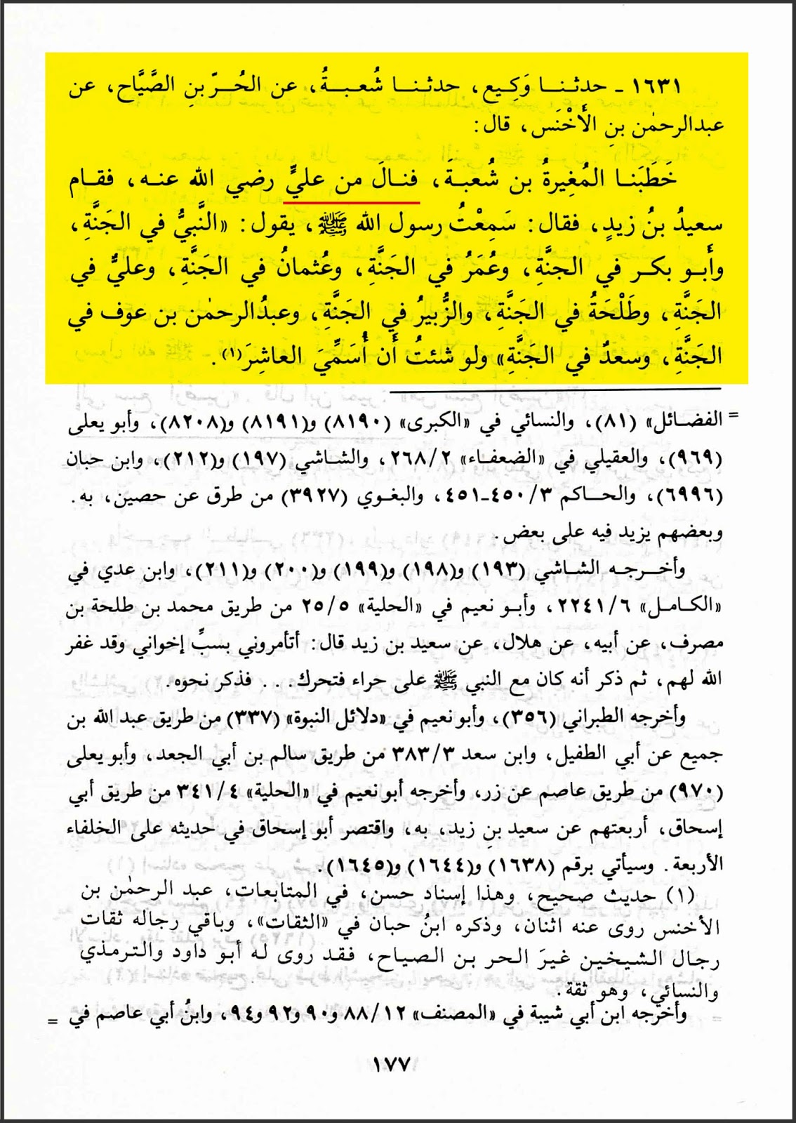 وروى أيضاً في مسنده (ج٣، ص١٨٠-١٨١، رقم الحديث ١٦٣٧): (حدثنا محمد بن جعفر، حدثنا شعبة. وحجاج، حدثني شعبة، عن الحر بن صياح، عن عبد الرحمن بن الأخنس أن المغيرة بن شعبة خطب فنال من علي رضي اللهُ عنه..إلخ).