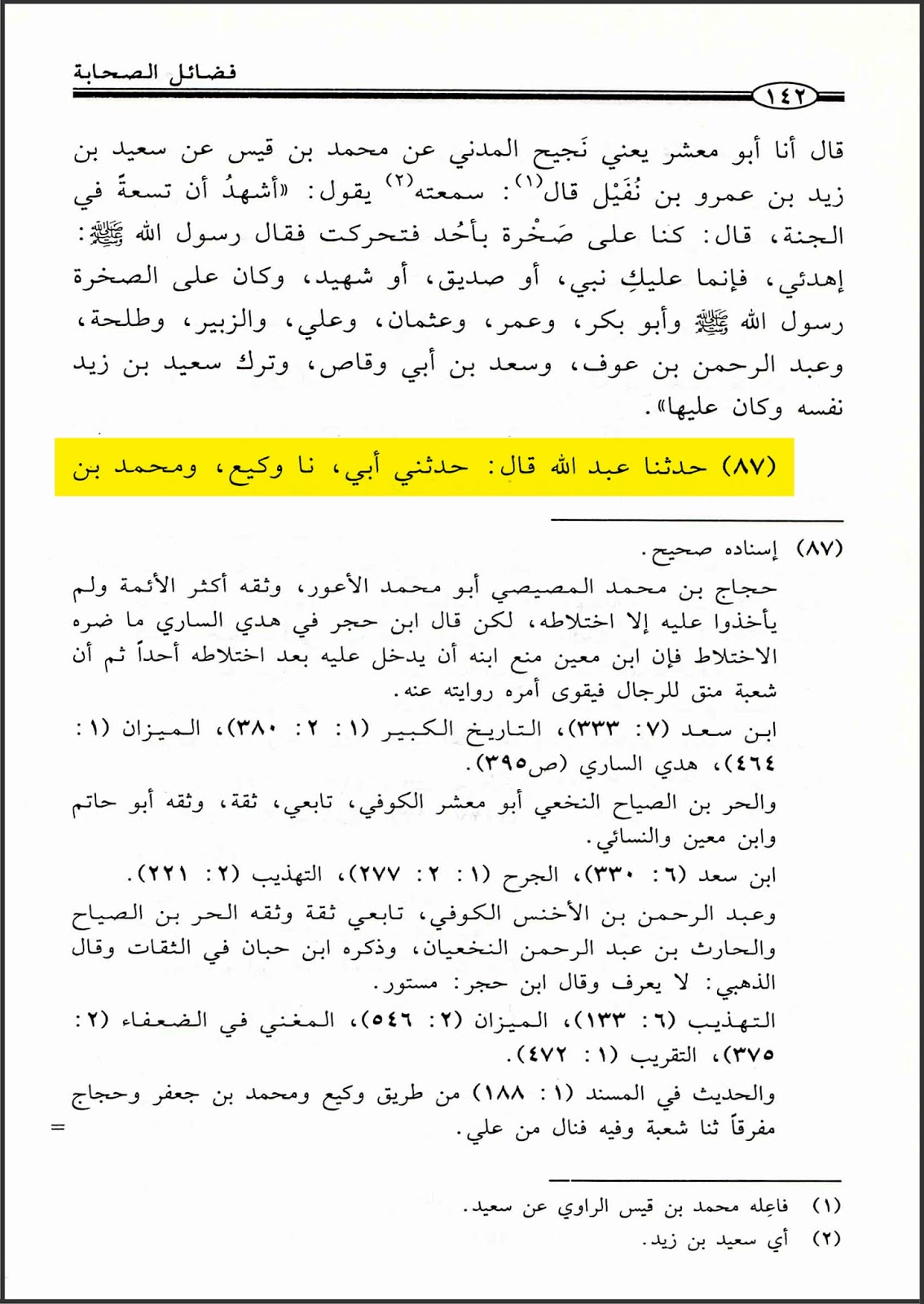 جاء في كتابه (فضائل الصحابة، ج١، ص١٤٢-١٤٣، رقم الحديث ٨٧): (حدثنا عبد الله قال: حدثني أبي، نا وكيع، ومحمد بن جعفر، قالا: نا شعبة. وحجاج، قال: حدثني شعبة، عن الحر بن الصياح، عن عبد الرحمن بن الأخنس قال: خطبنا المغيرة بن شعبة فنال من فلان ..إلخ).