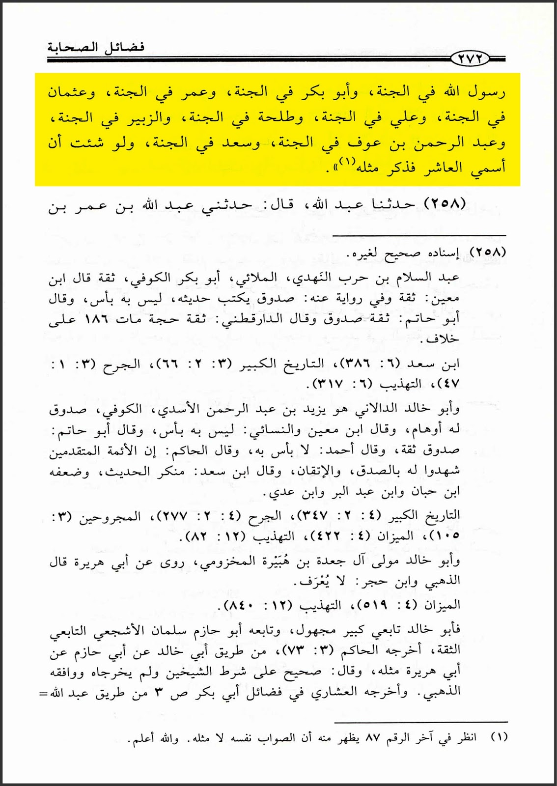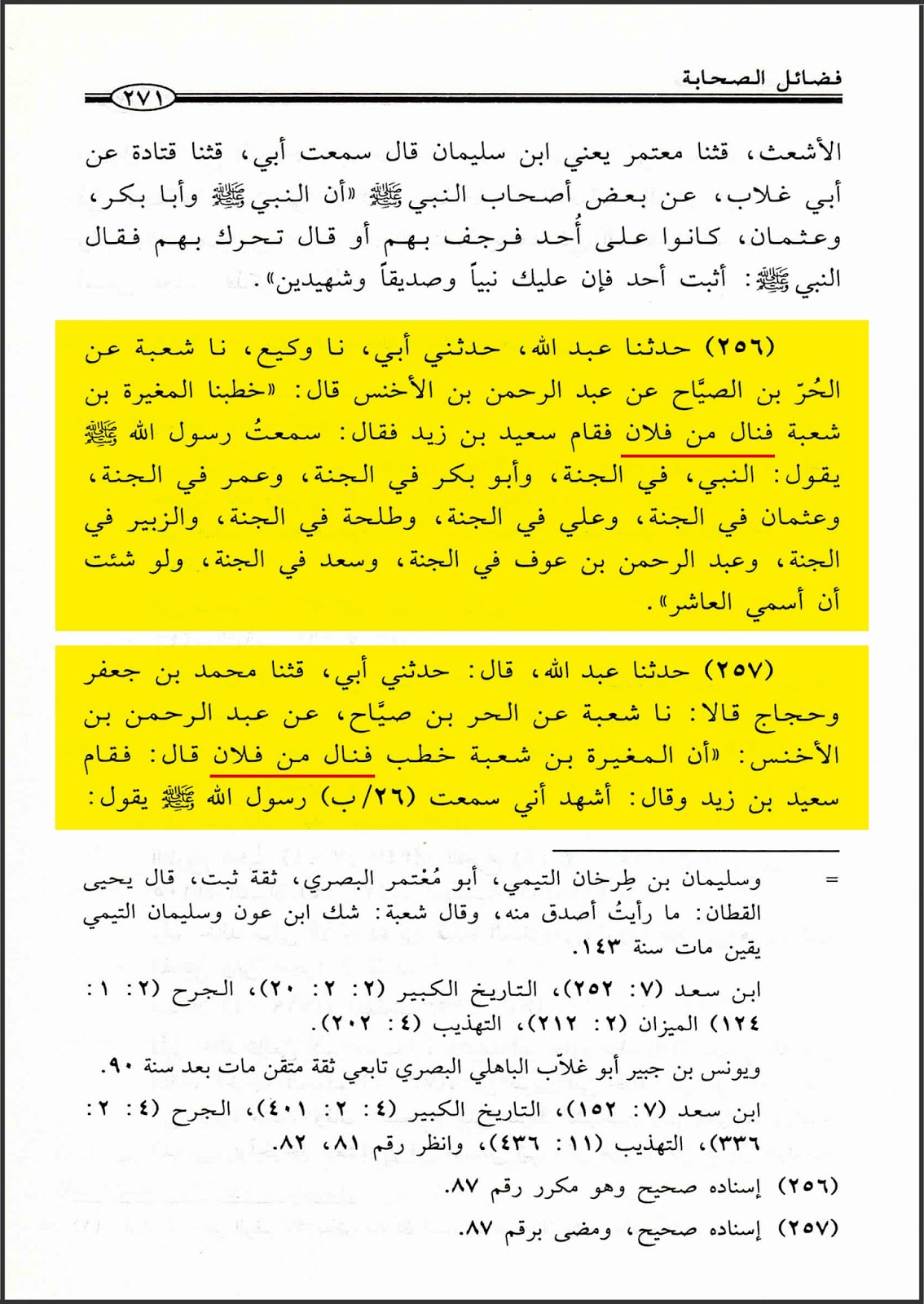 وجاءَ أيضاً (فضائل الصحابة، ج١، ص٢٧١، رقم الحديث ٢٥٧): (حدثنا عبد الله قال: حدثني أبي، قثنا محمد بن جعفر وحجاج، قالا: نا شعبة، عن الحر بن صيَّاح، عن عبد الرحمن بن الأخنس أن المغيرة بن شعبة خطب فنال من فلان ..إلخ).