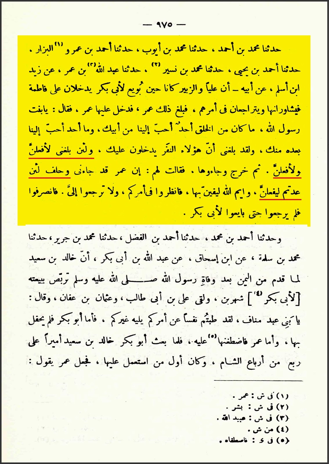 روى أبو بكر بن أبي شيبة في مصنفه: (حدثنا محمد بن بشر، حدثنا عبيد الله بن عمر، حدثنا زيد بن أسلم، عن أبيه أسلم: أنه حين بويع لأبي بكر بعد رسول الله كان علي والزبير يدخلان على فاطمة بنت رسول الله ﷺ فيشاورونها ويرتجعون في أمرهم، فلما بلغ ذلك عمر بن الخطاب خرج حتى دخل على فاطمة فقال: «يا بنت رسول الله، والله ما من الخلق أحد أحب إلينا من أبيك، وما من أحد أحب إلينا بعد أبيك منك، وايم الله ما ذاك بمانعي إن اجتمع هؤلاء النفر عندك أن آمر بهم أن يحرق عليهم البيت» قال: فلما خرج عمر جاؤوها فقالت: تعلمون أن عمر قد جاءني وقد حلف بالله لئن عدتم ليحرقن عليكم البيت، وايم الله ليمضين لما حلف عليه فانصرفوا راشدين، فروا رأيكم ولا ترجعوا إلي، فانصرفوا عنها فلم يرجعوا إليها حتى بايعوا لأبي بكر)، انظر: مصنف ابن أبي شيبة، ج٢٠، ص٥٧٩، رقم الحديث ٣٨٢٠٠.