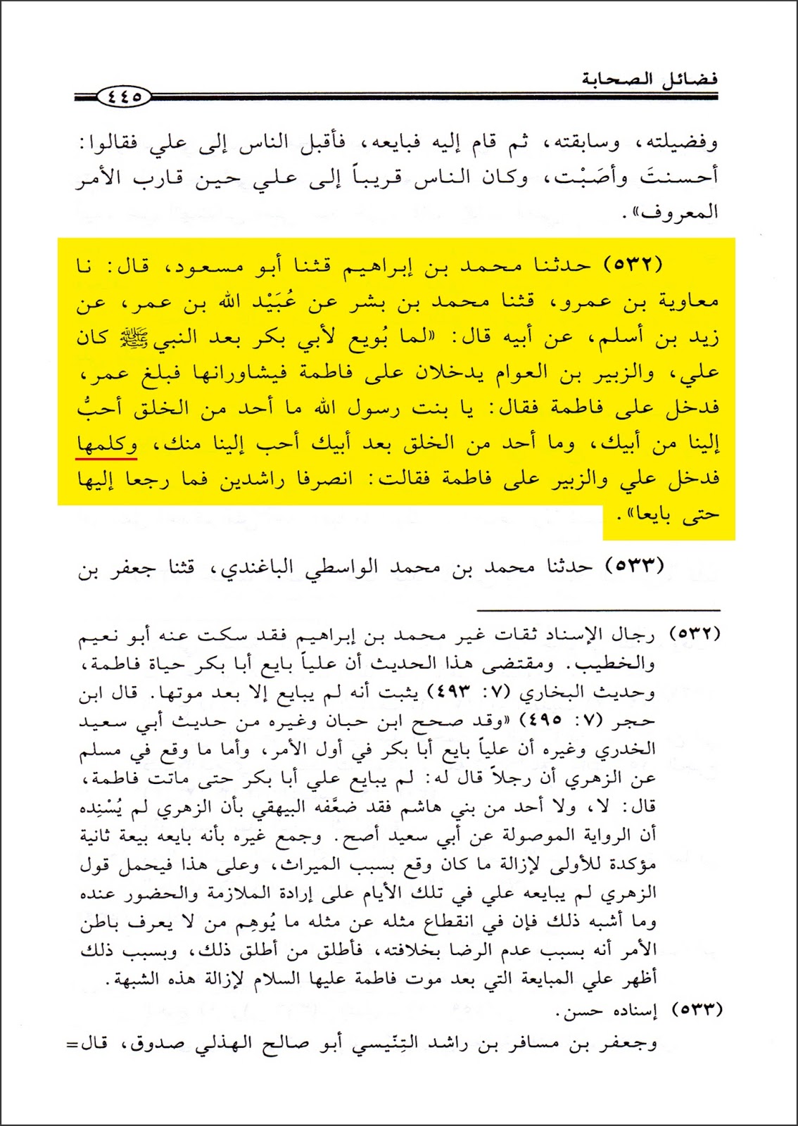 جاء في كتاب (فضائل الصحابة): (حدثنا محمد بن إبراهيم، قثنا أبو مسعود، قال: نا معاوية بن عمرو، قثنا محمد بن بشر، عن عبيد الله بن عمر، عن زيد بن أسلم، عن أبيه قال: لما بويع لأبي بكر بعد النبي صلى الله عليه وسلم، كان علي والزبير بن العوام يدخلان على فاطمة فيشاورانها، فبلغ عمر فدخل على فاطمة، فقال: يا بنت رسول الله، ما أحد من الخلق أحب إلينا من أبيك، وما أحد من الخلق بعد أبيك أحب إلينا منك، وكلّمها، فدخل علي والزبير على فاطمة فقالت: انصرفا راشدين، فما رجعا إليها حتى بايعا)، انظر: فضائل الصحابة، ج١، ص٤٤٥، رقم الحديث ٥٣٢.
