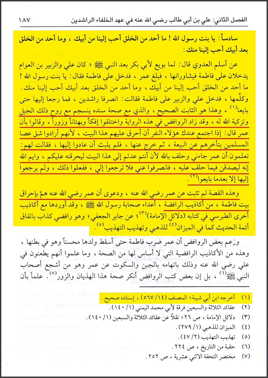 روى ابن أبي شيبة في مصنّفه: (حدثنا محمد بن بشر، حدثنا عبيد الله بن عمر، حدثنا زيد بن أسلم، عن أبيه أسلم أنه حين بويع لأبي بكر بعد رسول الله صلى الله عليه وسلم كان علي والزبير يدخلان على فاطمة بنت رسول الله صلى الله عليه وسلم فيشاورونها ويرتجعون في أمرهم، فلما بلغ ذلك عمر بن الخطاب خرج حتى دخل على فاطمة فقال: «يا بنت رسول الله والله ما من أحد أحب إلينا من أبيك، وما من الخلق أحد أحب إلينا بعد أبيك منك، وايم الله ما ذاك بمانعي إن اجتمع هؤلاء النفر عندك أن آمر بهم أن يُحَرَّقَ عليهم البيت» قال: فلما خرج عمر جاؤوها فقالت: تعلمون أن عمر قد جاءني وقد حلف بالله لئن عدتم ليحرقن عليكم البيت وايم الله ليمضين لما حلف عليه، فانصرفوا راشدين، فروا رأيكم ولا ترجعوا إلي. فانصرفوا عنها فلم يرجعوا إليها حتى بايعوا لأبي بكر)، انظر: مصنف ابن أبي شيبة، ج٢٠، ص٥٧٩، رقم الحديث ٣٨٢٠٠.