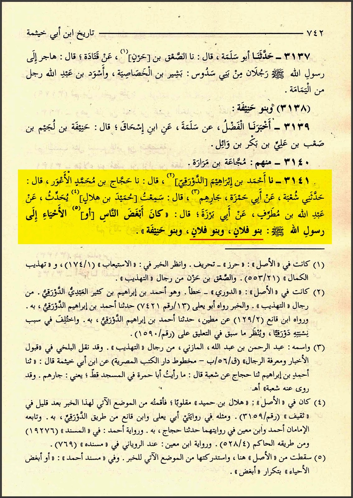 قال في كتابه (التاريخ الكبير، ج٢، ص٧٤٢، تحقيق: صلاح بن فتحي هلل، الناشر: دار الفاروق الحديثة للطباعة والنشر – القاهرة): (حدثنا أحمد بن إبراهيم [الدورقي]، قال: حدثنا حجاج بن محمد الأعور، قال: حدثني شعبة، عن أبي حمزة، جارهم، قال: سمعت حميد بن هلال يحدث، عن عبد الله بن مطرف، عن أبي برزة، قال: كان أبغض الناس أو الأحياء إلى رسول الله: بنو فلان وبنو فلان وبنو حنيفة).