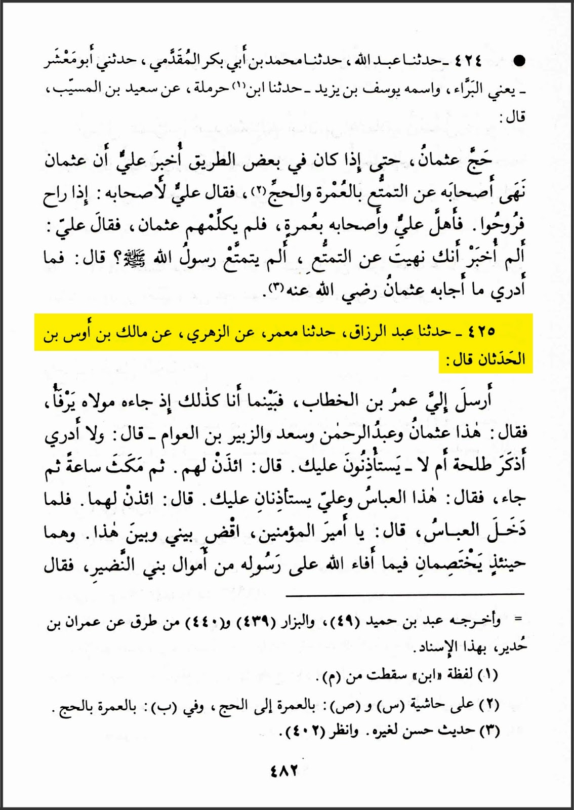 وروى أحمدُ بن حنبل هذه الرواية عن عبد الرزَّاق في مسنده (ج١، ص٤٨٢-٤٨٣، رقم الحديث ٤٢٥، تحقيق: شعيب الأرناؤوط، الناشر: مؤسسة الرسالة): (حدثنا عبد الرزاق، حدثنا معمر عن الزهري عن مالك بن أوس بن الحدثان، قال: أرسل إلي عمر بن الخطاب، فبينما أنا كذلك، إذ جاءه مولاه يرفأ، فقال: هذا عثمان وعبد الرحمن وسعد والزبير بن العوام – قال: ولا أدري أذكر طلحة أم لا – يستأذنون عليك. قال: ائذن لهم. ثم مكث ساعة ثم جاء، فقال: هذا العباس وعلي يستأذنان عليك. قال: ائذن لهما. فلما دخل العباس، قال: يا أمير المؤمنين، اقض بيني وبين هذا. وهما حينئذ يختصمان فيما أفاء الله على رسوله من أموال بني النضير، فقال القوم: اقض بينهما يا أمير المؤمنين، وأرح كل واحد من صاحبه، فقد طالت خصومتهما. فقال عمر: أنشدكم الله الذي بإذنه تقوم السماوات والأرض، أتعلمون أن رسول الله صلى الله عليه وسلم قال:لا نورث، ما تركنا صدقة؟ قالوا: قد قال ذلك. وقال لهما مثل ذلك، فقالا: نعم.