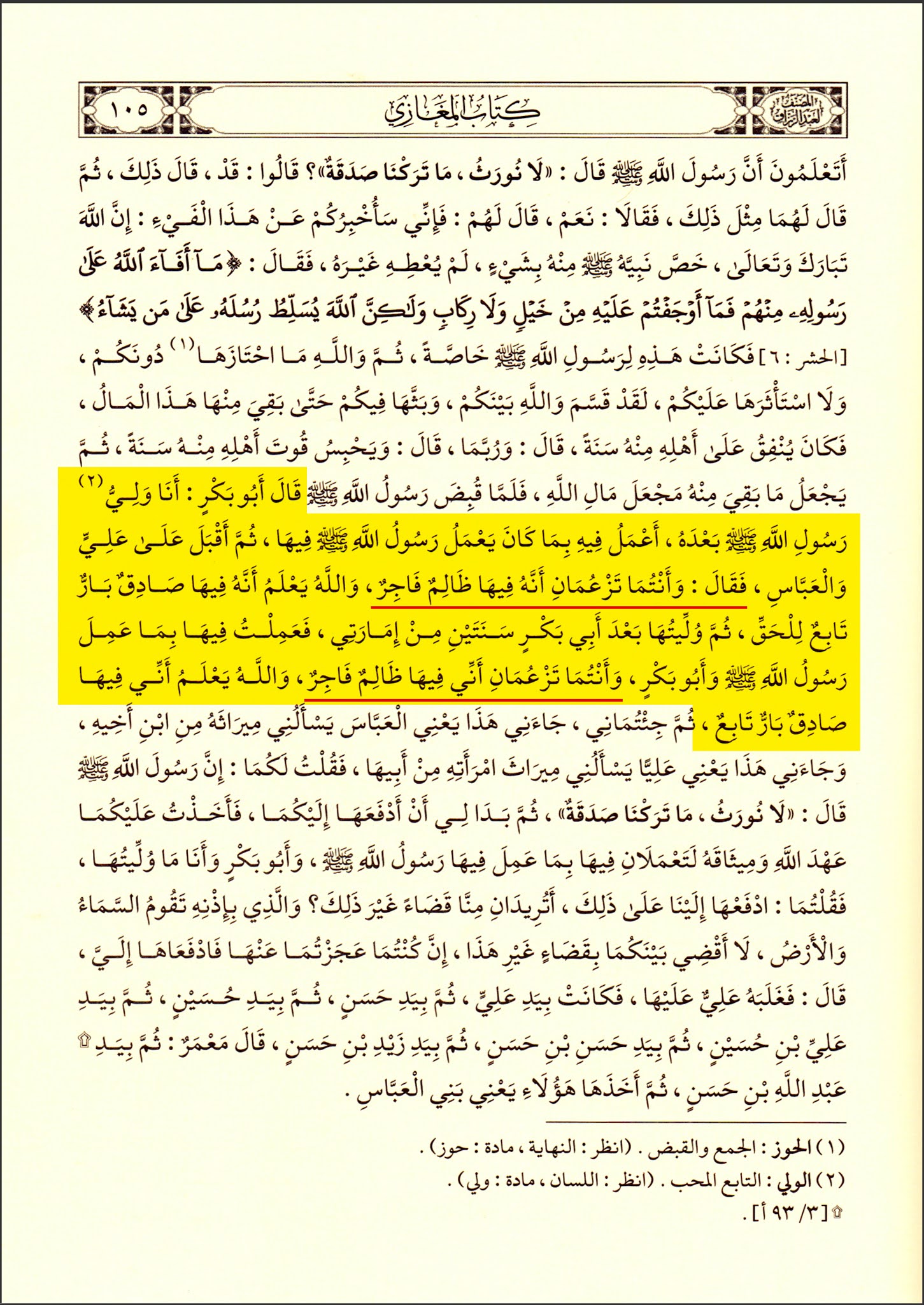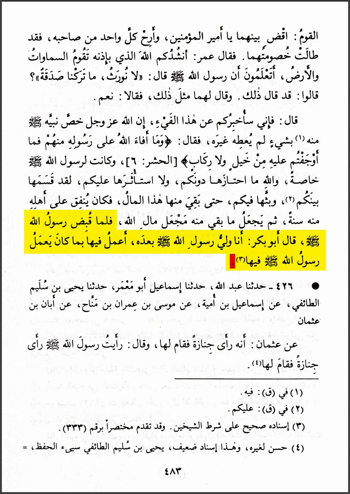 روى عبد الرزاق الصنعاني في مصنفه رواية تشير إلى موقف أمير المؤمنين (عليه السلام) من أبي بكر وعمر، قال في مصنفه (ج٥، ص١٠٤-١٠٥، رقم الحديث ١٠٥٣٢، الناشر: دار التأصيل): (عن معمر عن الزهري، عن مالك بن أوس بن الحدثان النصري قال: أرسل إليَّ عمر بن الخطاب أنه قد حضر المدينة أهل أبيات من قومك، وإنا قد أمرنا لهم برضح فاقسمه بينهم قلت: يا أمير المؤمنين مر بذلك غيري قال: اقبضه أيها المرء. قال: فبينا أنا كذلك جاءه مولاه فقال: هذا عثمان وعبد الرحمن بن عوف وسعد بن أبي وقاص والزبير بن العوام. قال: ولا أدري أذكر طلحة أم لا؟ – يستأذنون عليك قال: ائذن لهم قال: ثم مكث ساعة، ثم جاء فقال: هذا العباس وعلي يستأذنان عليك قال: ائذن لهما قال: ثم مكث ساعة قال: فلما دخل العباس قال: يا أمير المؤمنين اقض بيني وبين هذا – وهما يومئذ يختصمان فيما أفاء الله على رسول الله صلى الله عليه وسلم من أموال بني النضير – فقال القوم: اقض بينهما يا أمير المؤمنين، وأرح كل واحد منهما من صاحبه، فقد طالت خصومتهما، فقال عمر: أنشدكم الله الذي بإذنه تقوم السموات والأرض، أتعلمون أن رسول الله صلى الله عليه وسلم قال: «لا نورث، ما تركنا صدقة؟» قال: قالوا: قد قال ذلك، ثم قال لهما مثل ذلك فقالا: نعم قال لهم: فإني سأخبركم عن هذا الفيء: إن الله تبارك وتعالى، خص نبيه صلى الله عليه وسلم منه بشيء، لم يعطه غيره فقال: {وَمَا أَفَاءَ اللَّهُ عَلَى رَسُولِهِ مِنْهُمْ فَمَا أَوْجَفْتُمْ عَلَيْهِ مِنْ خَيْلٍ وَلَا رِكَابٍ وَلَكِنَّ اللَّهَ يُسَلِّطُ رُسُلَهُ عَلَى مَنْ يَشَاءُ} فكانت هذه لرسول الله صلى الله عليه وسلم خاصة، ثم والله ما احتازها دونكم ولا استأثر بها عليكم، لقد قسم والله بينكم وبثها فيكم حتى بقي منها هذا المال، فكان ينفق على أهله منه سنة – قال: وربما قال: ويحبس قوت أهله منه سنة – ثم يجعل ما بقي منه مجعل مال الله، فلما قبض رسول الله صلى الله عليه وسلم قال أبو بكر: أنا ولي رسول الله صلى الله عليه وسلم بعده، أعمل فيه بما كان يعمل رسول الله صلى الله عليه وسلم فيها. ثم أقبل على علي والعباس فقال: وأنتما تزعمان أنه فيها ظالم فاجر والله يعلم أنه فيها صادق بار تابع للحق، ثم وليتها بعد أبي بكر سنتين من إمارتي، فعملت فيها بما عمل رسول الله صلى الله عليه وسلم وأبو بكر وأنتما تزعمان أني فيها ظالم فاجر، والله يعلم أني فيها صادق بار تابع للحق، ثم جئتماني، جاءني هذا – يعني العباس – يسألني ميراثه من ابن أخيه، وجاءني هذا – يعني علياً – يسألني ميراث امرأته من أبيها فقلت لكما: إن رسول الله صلى الله عليه وسلم قال: «لا نورث، ما تركنا صدقة» ثم بدا لي أن أدفعها إليكما، فأخذت عليكما عهد الله وميثاقه لتعملان فيها بما عمل فيها رسول الله صلى الله عليه وسلم، وأبو بكر وأنا ما وليتها، فقلتما: ادفعها إلينا على ذلك، أتريدان منا قضاء غير هذا؟ والذي بإذنه تقوم السماء والأرض، لا أقضي بينكما بقضاء غير هذا، إن كنتما عجزتما عنها فادفعاها إلي. قال: فغلبه علي عليها، فكانت بيد علي، ثم بيد حسن، ثم بيد حسين، ثم بيد علي بن حسين، ثم بيد حسن بن حسن، ثم بيد زيد بن حسن قال معمر: ثم بيد عبد الله بن حسن، ثم أخذها هؤلاء – يعني بني العباس -).
