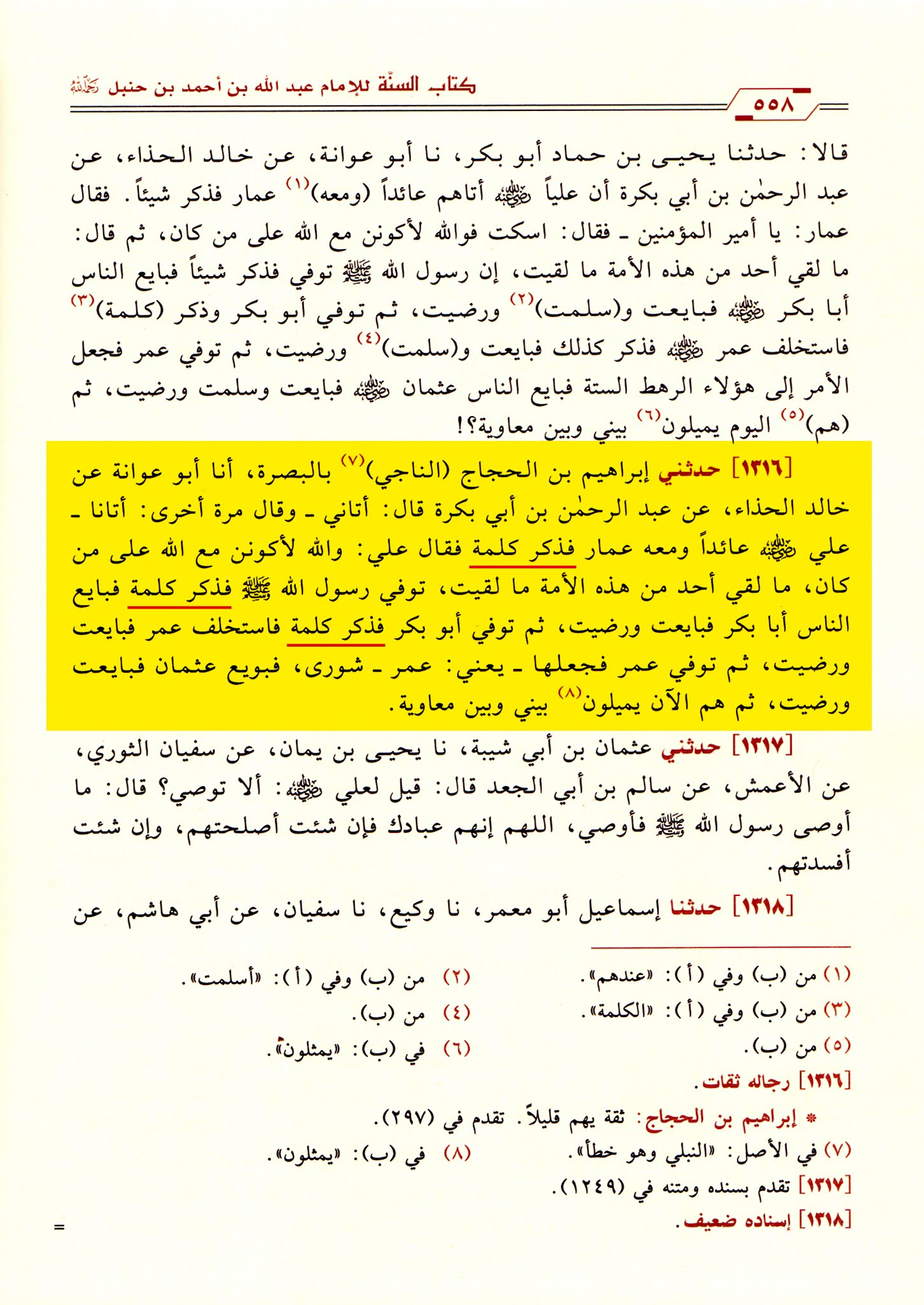 وقد نقل عبد الله بن أحمد بن حنبل هذه الرواية في كتابه (السنة، ج٢، ص٥٥٨، رقم الحديث ١٣١٦) إلا أنّه قد أُبهِمَ هذا المطلب بكلامٍ لا يُفهم منه شيءٌ، قال: (حدثني إبراهيم بن الحجاج الناجي بالبصرة، أنا أبو عوانة، عن خالد الحذاء، عن عبد الرحمن بن أبي بكرة، قال: أتاني – وقال مرة أخرى -: أتانا علي رضي الله عنه عائداً ومعه عمار فذكر كلمة، فقال علي: «والله لأكونن مع الله على من كان، ما لقي أحد من هذه الأمة ما لقيت، توفي رسول الله صلى الله عليه وسلم فذكر كلمة فبايع الناس أبا بكر فبايعت ورضيت، ثم توفي أبو بكر فذكر كلمة فاستخلف عمر فبايعت ورضيت، ثم توفي عمر فجعلها – يعني عمر – شورى فبويع عثمان فبايعت ورضيت، ثم هم الآن يميلون بيني وبين معاوية»).