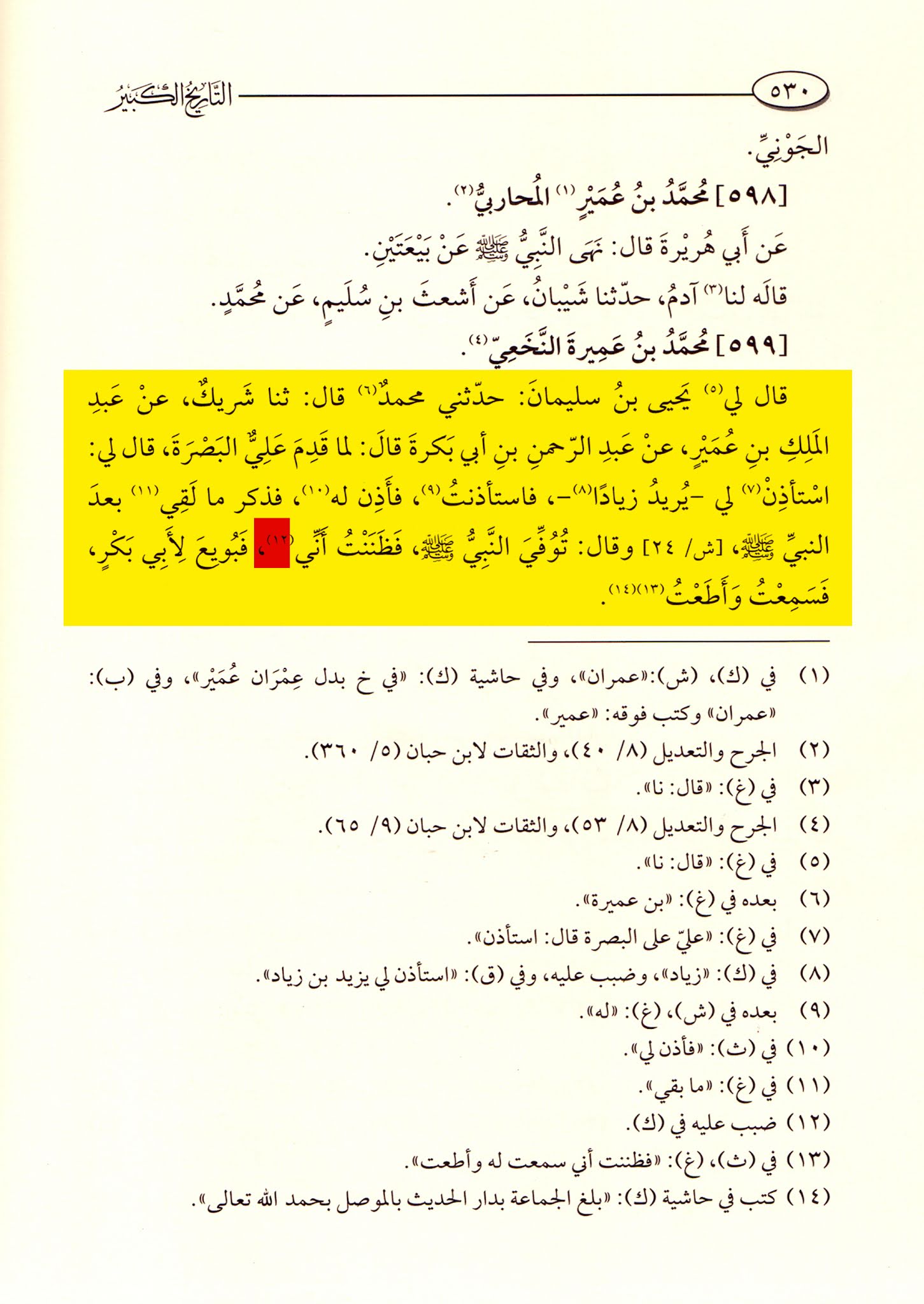 وذكر البخاريّ هذه الرواية في كتابه (التاريخ الكبير، ج١، ص٥٣٠، رقم الترجمة ٥٥٩) أيضاً، وقد حُذِفَ منها متعلّق الظنّ في كلام أمير المؤمنين (عليه السلام) مع أنّ الفعل (ظنّ) من الأفعال المتعديّة، وبذلك بقيت العبارة ناقصةً، وهذا ما سبّبَ إبهاماً في دلالتها والمراد منها.