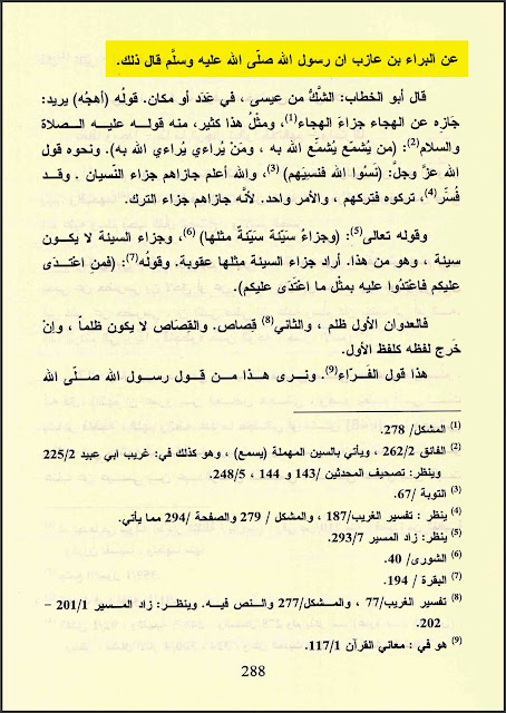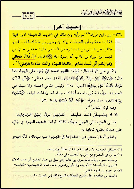 قال القاضي أبو يعلى ابن الفرَّاء الحنبلي في كتابه (إبطال التأويلات لأخبار الصفات): (ثم رأيته بعد ذلك في غريب الحديث لابن قتيبة، فقال: حدثنيه أبو الخطاب زياد بن يحيى بن حسان، قال: نا أبو عتاب، عن عيسى بن عبد الرحمن السلمي، قال: حدثني عدي بن ثابت، عن البراء بن عازب، أن رسول الله صلى الله عليه وسلَّم قال: «إن فلاناً هجاني وهو يعلم أني لست بشاعر، فاهجه اللهم والعنه عدد ما هجاني»).
