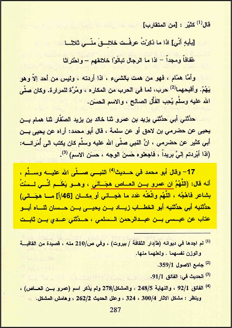 ولكننا إذا رجعنا إلى كتاب (غريب الحديث) لابن قتيبة الدينوري، فسنجد أنّ القاضي ابن الفراء قد حرَّف الحديث ليستر اسم عمرو بن العاص، قال ابن قتيبة الدينوريّ: (وقال أبو محمد في حديث النبي صلى الله عليه وسلَّم أنه قال: «اللهم إن عمرو بن العاص هجاني وهو يعلم أني لست بشاعر، فاهجه اللهم والعنه عدد ما هجاني أو مكان ما هجاني»، حدثنيه أبي، حدثنيه أبو الخطاب زياد بن يحيى بن حسان، ثناه أبو عتاب، عن عيسى بن عبد الرحمن السلمي، حدثني عدي بن ثابت، عن البراء بن عازب أن رسول الله صلى الله عليه وسلّم قال ذلك).