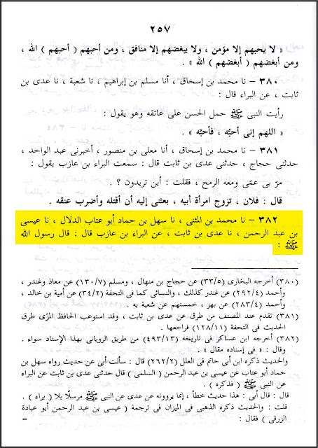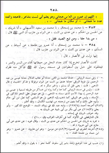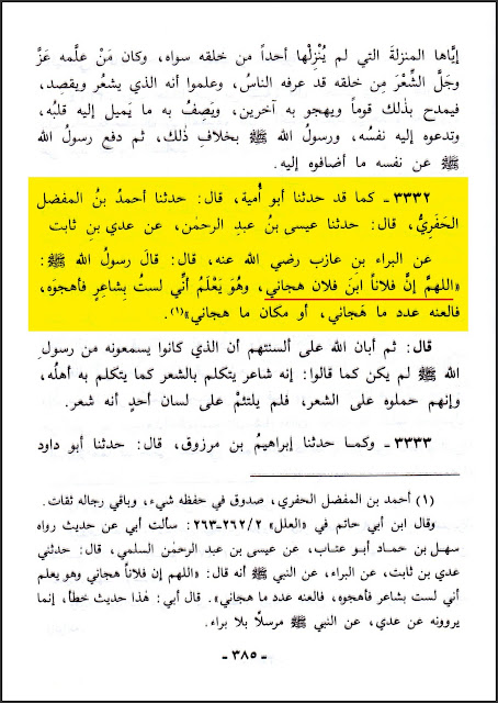وهذه الرواية من طريق عيسى بن عبد الرحمن هي التي مرَّت آنفاً عن ابن قتيبة [انظر: كشف التحريفات (٣٣)]، ولكن الحافظ الطحاوي نقلها بإسناده عن عيسى محرفةً، وقد أُبهم اسم عمرو بن العاص، قال: (حدثنا أبو أمية قال: حدثنا أحمد بن المفضل الحفري، قال: حدثنا عيسى بن عبد الرحمن، عن عدي بن ثابت، عن البراء بن عازب ݤ قال: قال رسول الله صلّى الله عليه وسلّم: «اللهم إن فلاناً ابن فلان هجاني، وهو يعلم أني لست بشاعر فأهجوه، فالعنه عدد ما هجاني، أو مكان ما هجاني»).