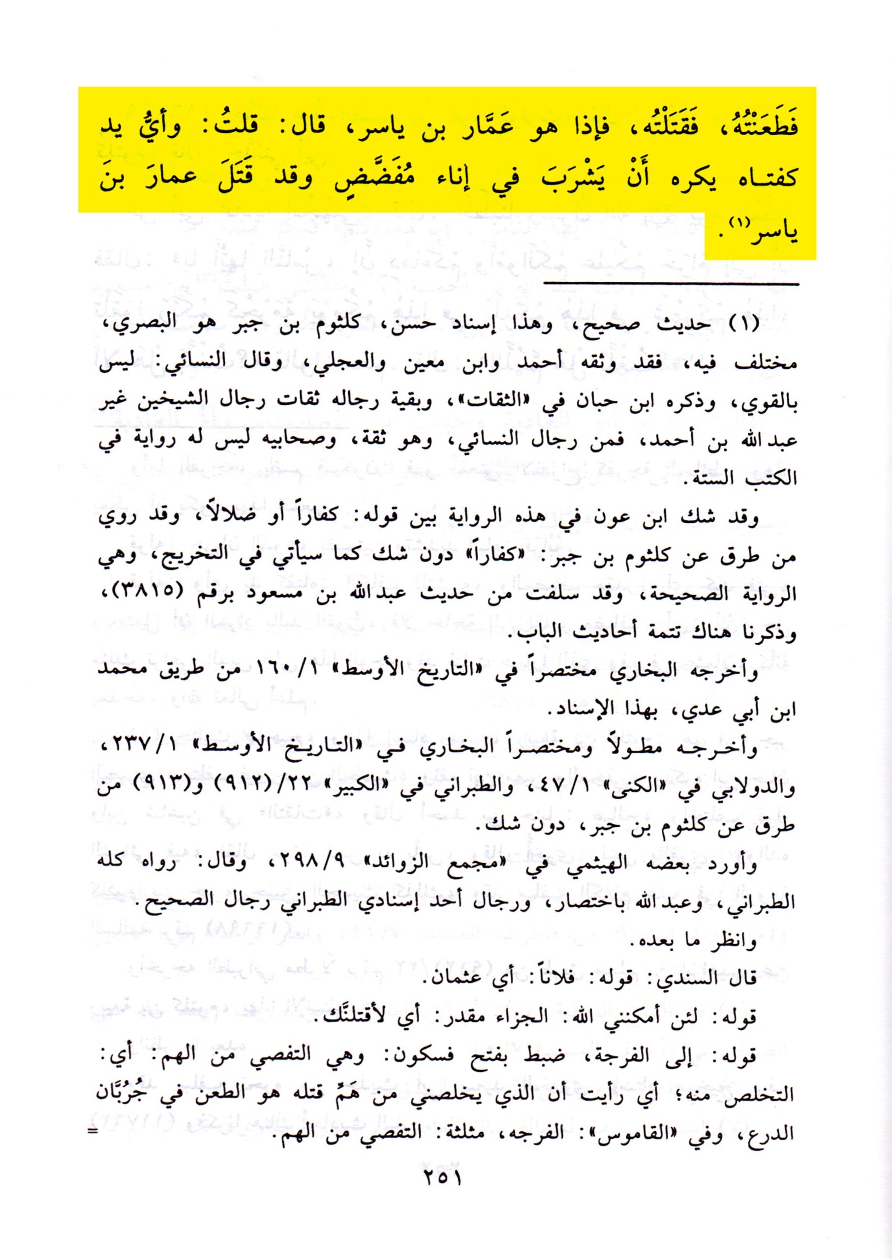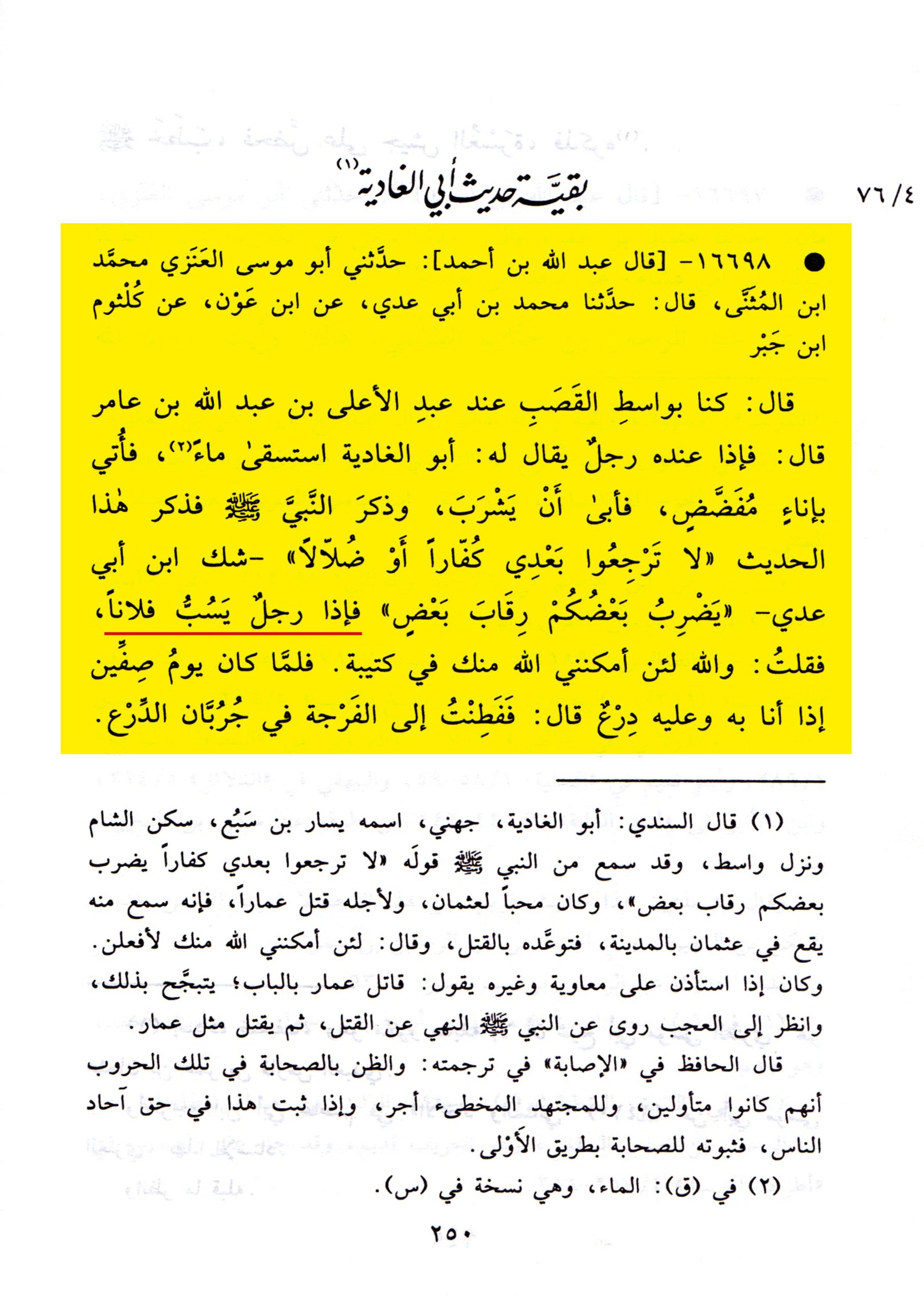 وهذه الرواية تشيرُ إلى طعن الصحابي الجليل عمار بن ياسر رضي الله عنه في الخليفة الثالث عثمان بن عفّان وأنَّه كان يشتمُه، إلّا أنّ بعض الرواة لما نقلوا هذه الحادثة أبهموا اسم الشخص الذي يطعن فيه عمارُ بن ياسر، فقد روى عبد الله بن أحمد بن حنبل في زوائده على المسند [2]: (حدثني أبو موسى العنزي محمد بن المثنى، قال: حدثنا محمد بن أبي عدي، عن ابن عون، عن كلثوم بن جبر، قال: كنا بواسط القصب عند عبد الأعلى بن عبد الله بن عامر قال: فإذا عنده رجل يقال له: أبو الغادية، استسقى ماء، فأتي بإناء مفضض، فأبى أن يشرب، وذكر النبيَّ صلّى اللهُ عليه وسلّم فذكر هذا الحديث «لا ترجعوا بعدي كفاراً أو ضلالاً – شك ابن أبي عدي – يضرب بعضكم رقاب بعض» فإذا رجل يسب فلاناً، فقلت: والله لئن أمكنني الله منك في كتيبة. فلما كان يوم صفين إذا أنا به وعليه درع قال: ففطنت إلى الفرجة في جربان الدرع، فطعنته، فقتلته، فإذا هو عمار بن ياسر.