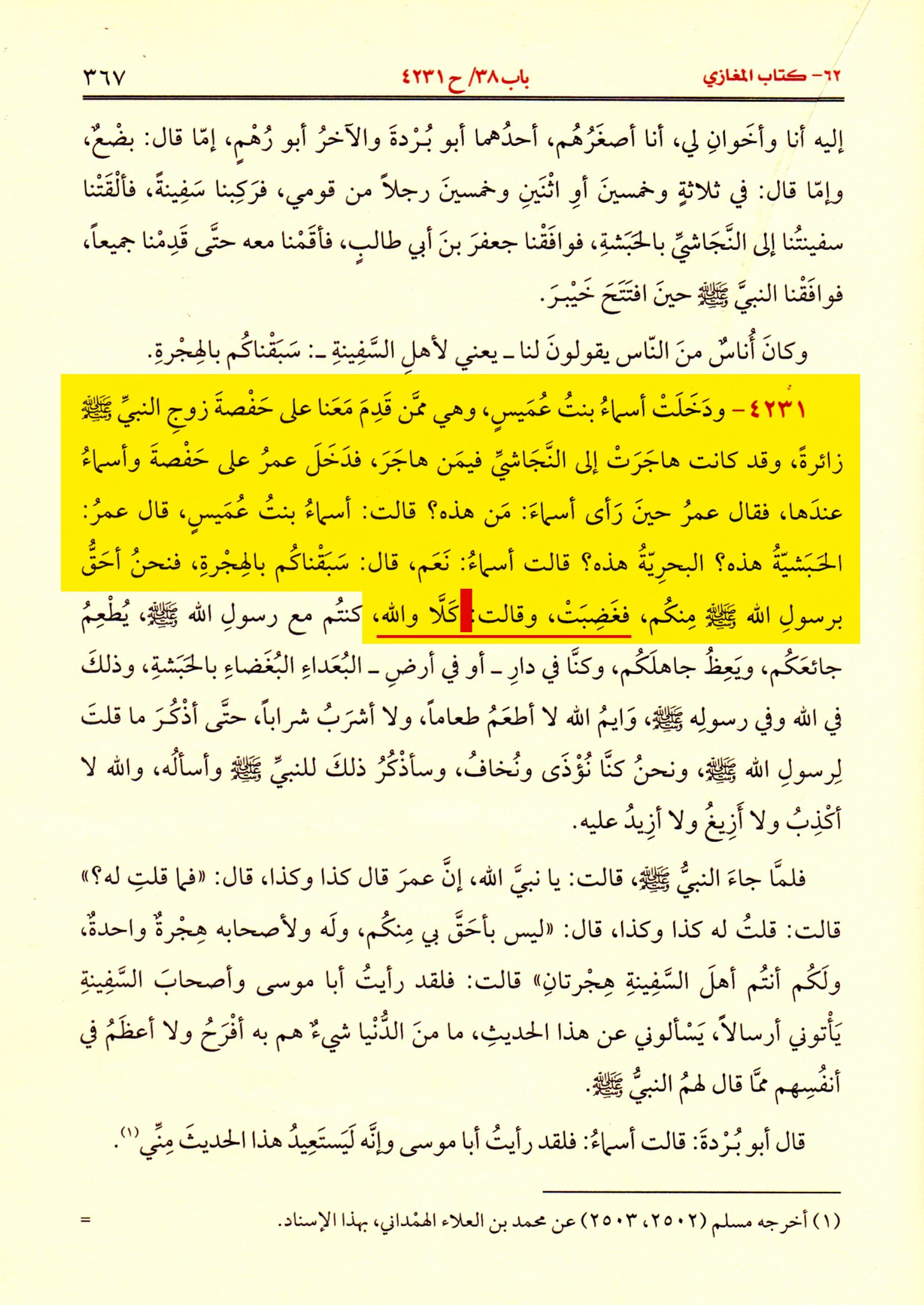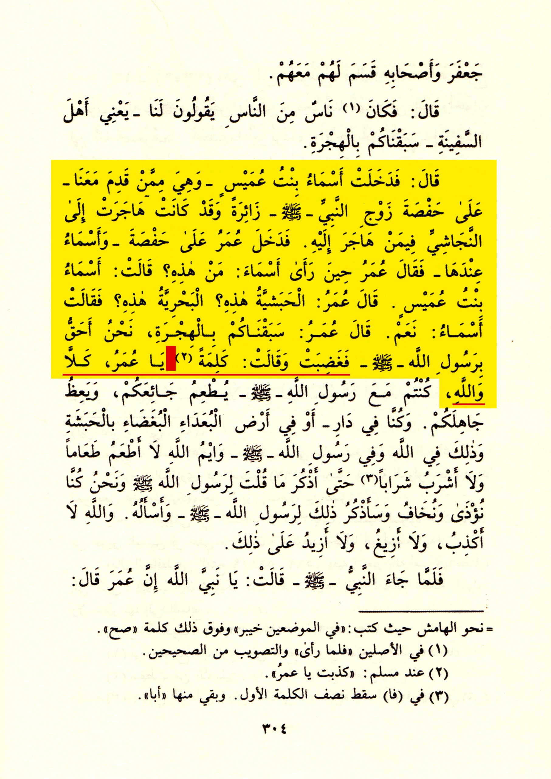 روى مسلم في صحيحه[1]، والبخاري في صحيحه[2]، وأبو يعلى الموصلي في مسنده[3] رواية طويلة وفيها: أنَّ عمر بن الخطاب استخفَّ بأسماء بنت عُميس خلال محاورةٍ جرت بينهما، ثم تفاخر عليها بقوله إنه والمهاجرين قد سبقوها بالهجرة إلى رسول الله صلّى الله عليه وآله، فغضبت أسماء منه وردَّت عليه بكلامٍ فيه حدَّةٍ، وقد روى مسلم في صحيحه ردَّ أسماء بهذا اللفظ: (وقالت كلمةً: كذبتَ يا عمر، كلا والله….إلخ)، وقد حُذِفت هذه الكلمة عند البخاري في صحيحه، والحافظ أبي يعلى الموصليّ في مسنده.