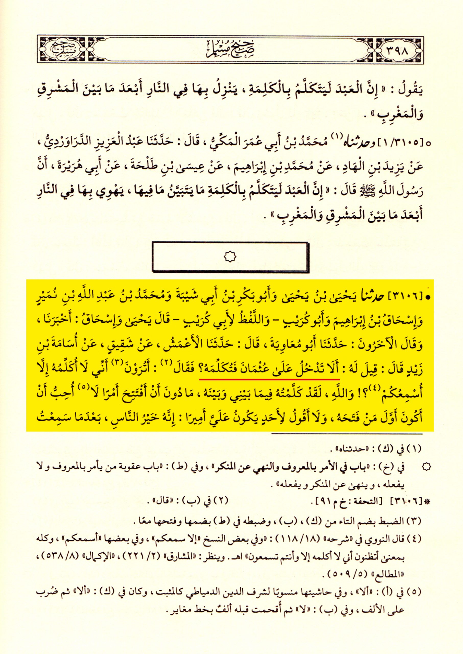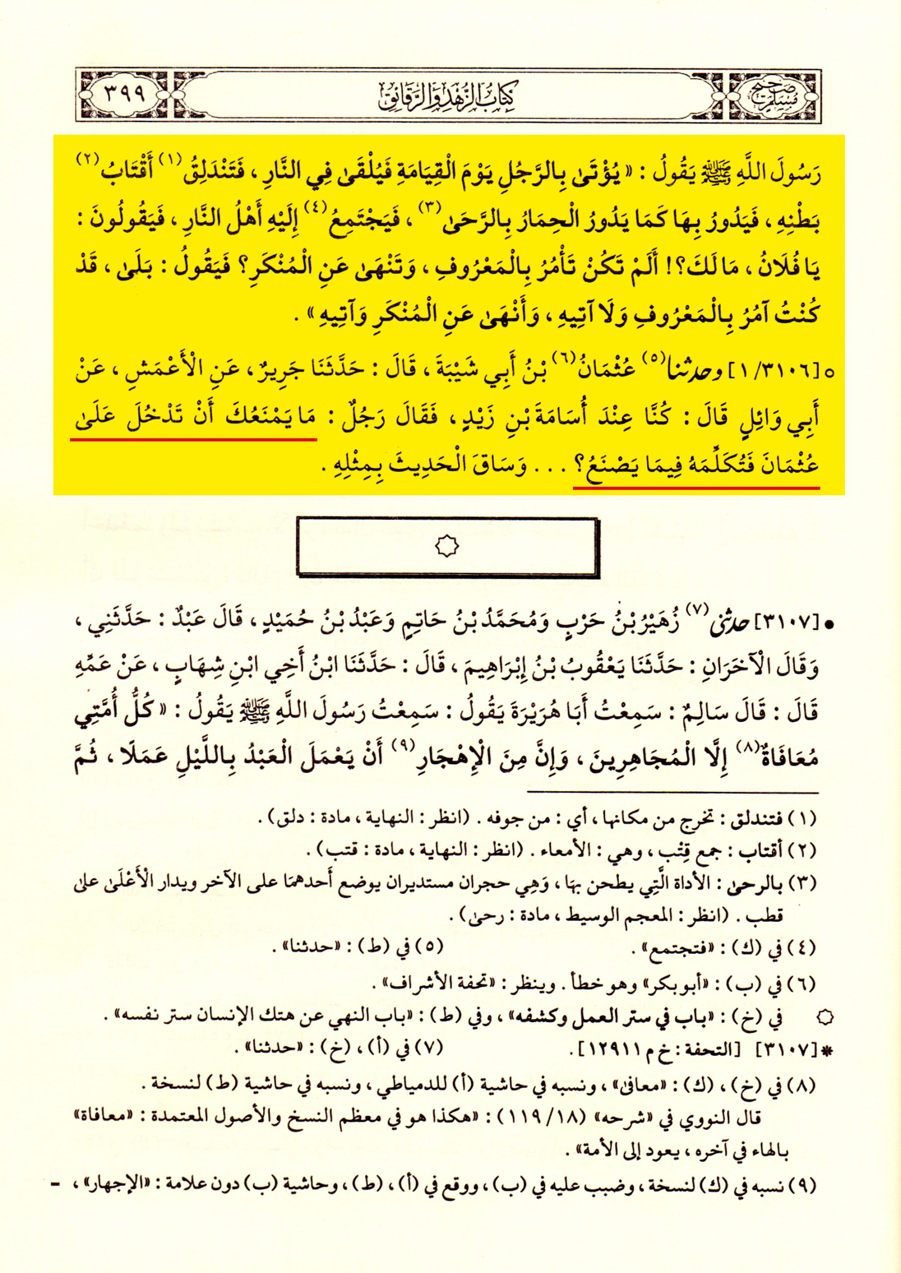 روى مسلم في صحيحه: (حدثنا يحيى بن يحيى، وأبو بكر بن أبي شيبة ومحمد بن عبد الله بن نمير وإسحاق بن إبراهيم وأبو كريب – واللفظ لأبي كريب – قال يحيى وإسحاق: أخبرنا، وقال الآخرون: حدثنا أبو معاوية، قال: حدثنا الأعمش، عن شقيق، عن أسامة بن زيد، قال: قيل له: ألا تدخل على عثمان فتكلمه؟ فقال: أترون أني لا أكلمه إلا أُسْمِعُكُمْ؟ والله لقد كلمته فيما بيني وبينه، ما دون أن أفتتح أمراً لا أحب أن أكون أول من فتحه، ولا أقول لأحدٍ يكون عليَّ أميراً «إنه خير الناس» بعد ما سمعت رسول الله ﷺ يقول: يؤتى بالرجل يوم القيامة، فيلقى في النار، فتندلق أقتاب بطنه، فيدور بها كما يدور الحمار بالرحى فيجتمع إليه أهل النار، فيقولون: يا فلان ما لك؟ ألم تكن تأمر بالمعروف، وتنهى عن المنكر؟ فيقول: بلى، قد كنت آمر بالمعروف ولا آتيه، وأنهى عن المنكر وآتيه.