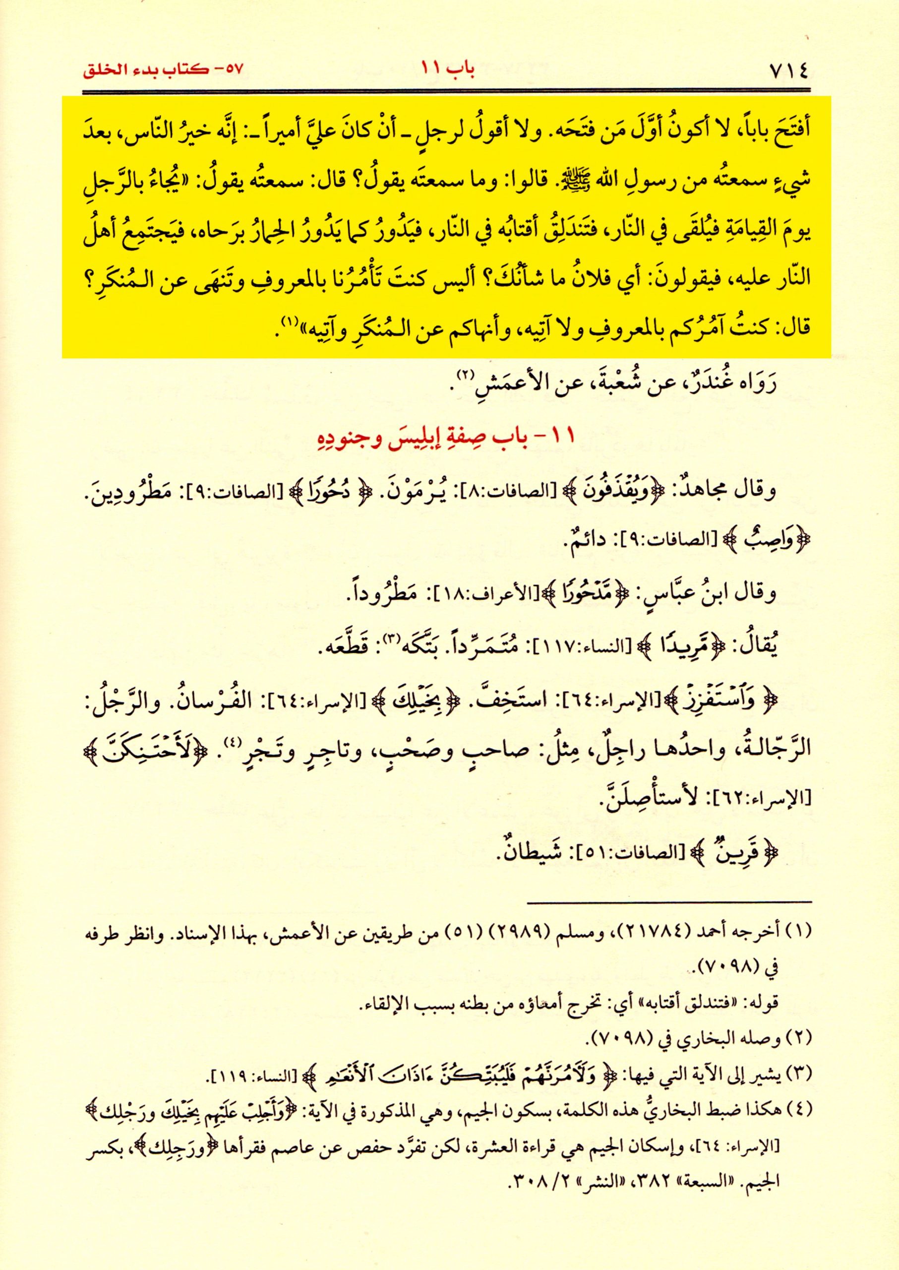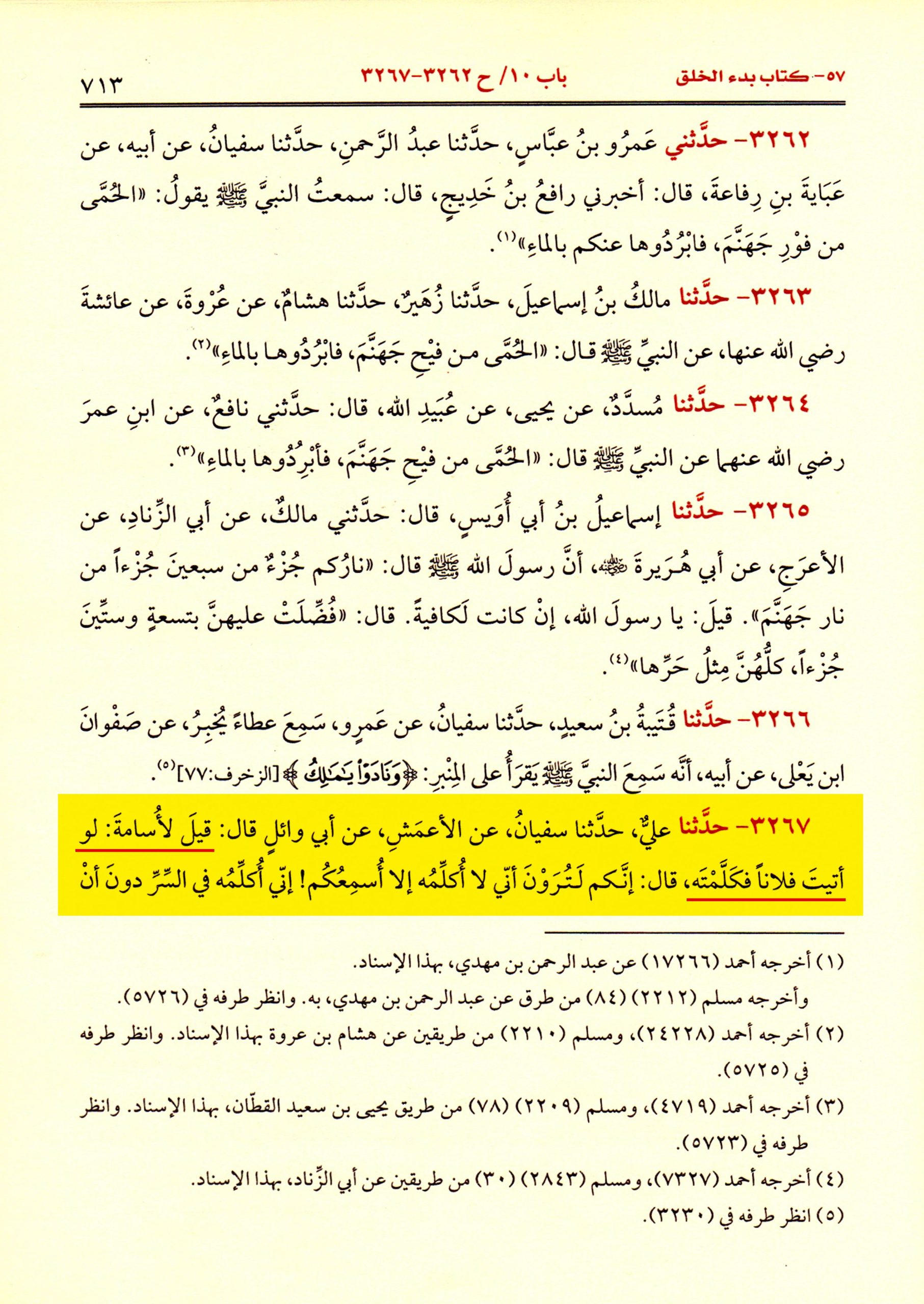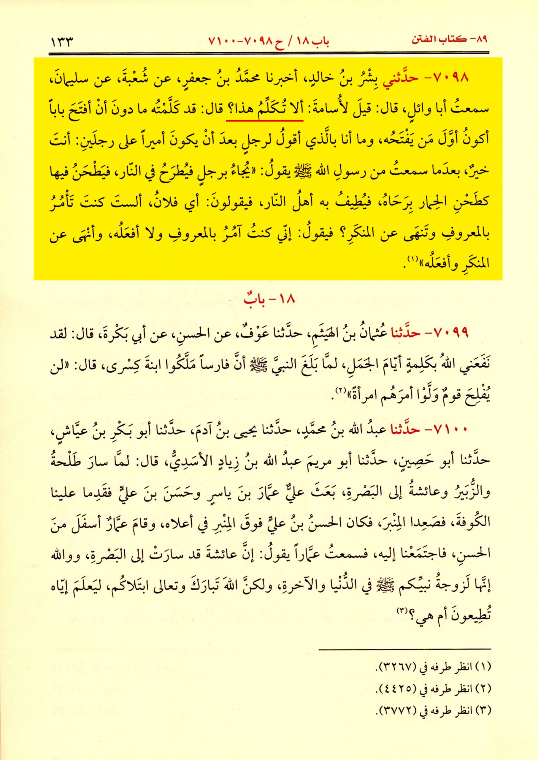 وروى البخاري أيضاً: (حدثني بشر بن خالد، أخبرنا محمد بن جعفر، عن شعبة، عن سليمان، سمعت أبا وائل، قال: قيل لأسامة: ألا تكلم هذا؟ قال: قد كلمته ما دون أن أفتح باباً أكون أول من يفتحه، وما أنا بالذي أقول لرجل بعد أن يكون أميراً على رجلين: أنت خير، بعد ما سمعت من رسول الله ﷺ يقول: يجاء برجل فيطرح في النار، فيطحن فيها كطحن الحمار برحاه، فيطيف به أهل النار فيقولون: أي فلان، ألست كنت تأمر بالمعروف وتنهى عن المنكر؟ فيقول: إني كنت آمر بالمعروف ولا أفعله، وأنهى عن المنكر وأفعله).