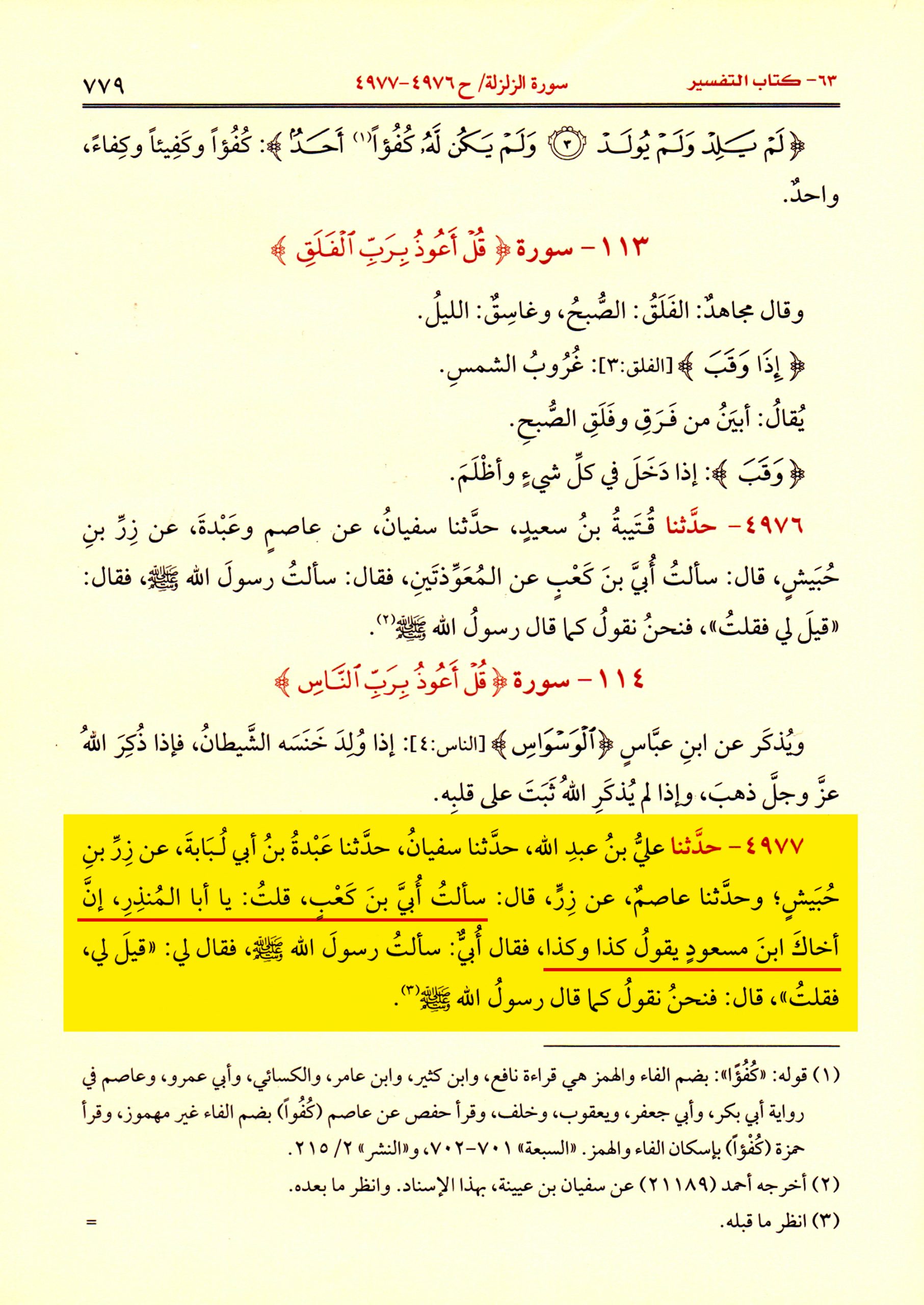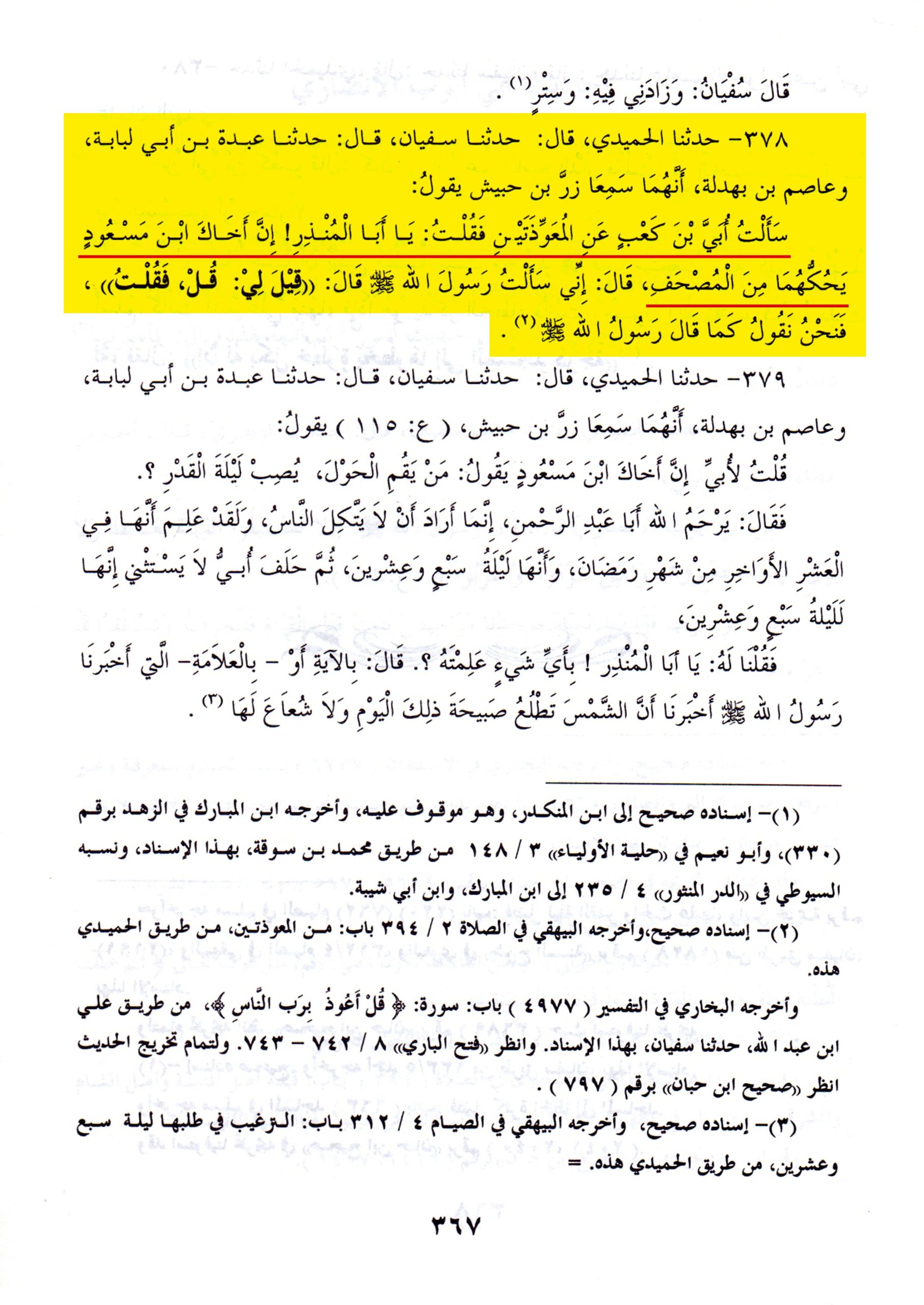 روى الحافظ الحميدي في مسنده: (حدثنا سفيان، قال: حدثنا عبدة بن أبي لبابة، وعاصم بن بهدلة أنهما سمعا زر بن حبيش يقول: سألتُ أُبيَّ بن كعب عن المعوذتين فقلت: يا أبا المنذر، إن أخاك ابن مسعود يحكُّهُمَا من المصحف. قال: إني سألت رسول الله صلّى الله عليه وسلّم قال: « قيل لي: قل، فقلتُ» فنحن نقول كما قال رسول الله صلّى الله عليه وسلّم).