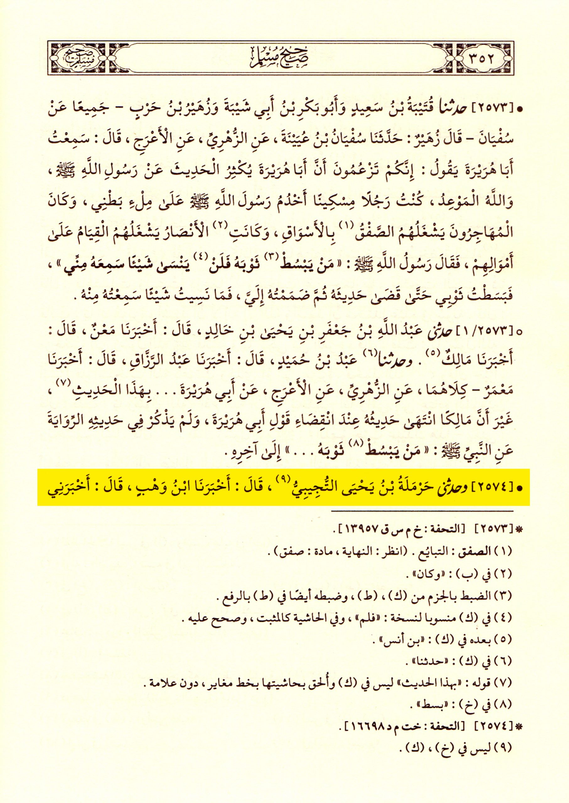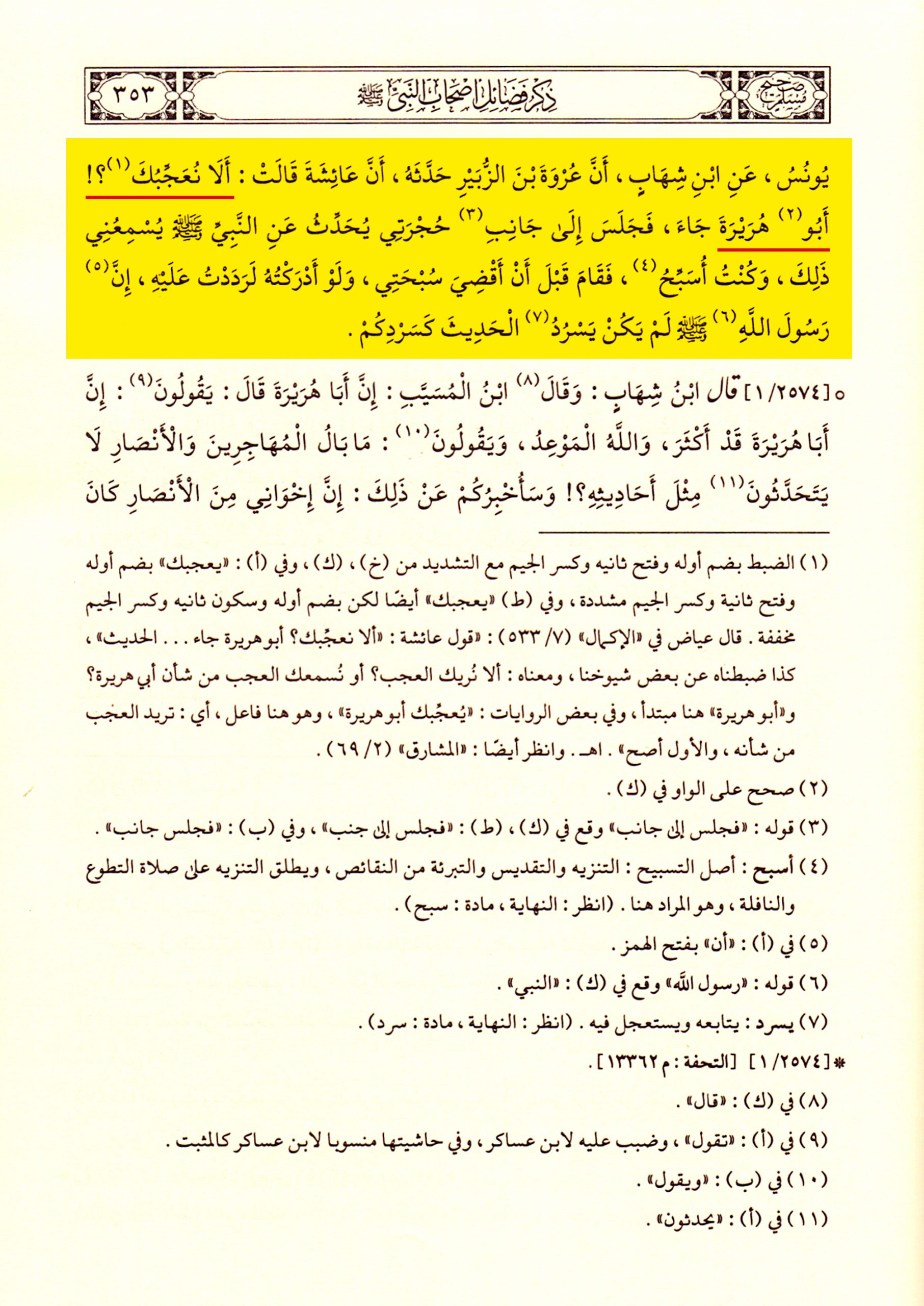 روى مسلم في صحيحه: (وحدثني حرملة بن يحيى التجيبي، قال: أخبرنا ابن وهب، قال: أخبرني يونس، عن ابن شهاب، أن عروة بن الزبير حدّثه، أن عائشة قالت: ألا نُعَجِّبُكَ أبو هريرة؟! جاء فجلس إلى جانب حجرتي يحدث عن النبي صلّى الله عليه وسلّم، يسمعني ذلك، وكنت أسبح، فقام قبل أن أقضي سبحتي، ولو أدركته لرددت عليه، إن رسول الله صلّى الله عليه وسلّم لم يكن يسرد الحديث كسردكم).