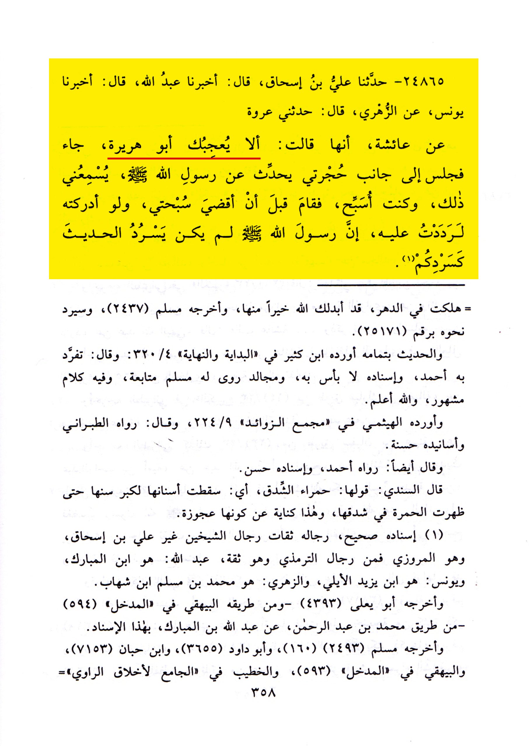 وروى أحمد بن حنبل في مسنده: (حدثنا علي بن إسحاق، قال: أخبرنا عبد الله، قال: أخبرنا يونس، عن الزهري، قال: حدثني عروة، عن عائشة، أنها قالت: ألا يعجبك أبو هريرة؟! جاء فجلس إلى جانب حجرتي يحدث عن رسول الله صلّى الله عليه وسلّم، يُسْمِعُنِي ذلك، وكنت أسبح، فقام قبل أن أقضي سبحتي، ولو أدركته لرددت عليه، إن رسول الله صلّى الله عليه وسلّم لم يكن يسرد الحديث كسردكم).