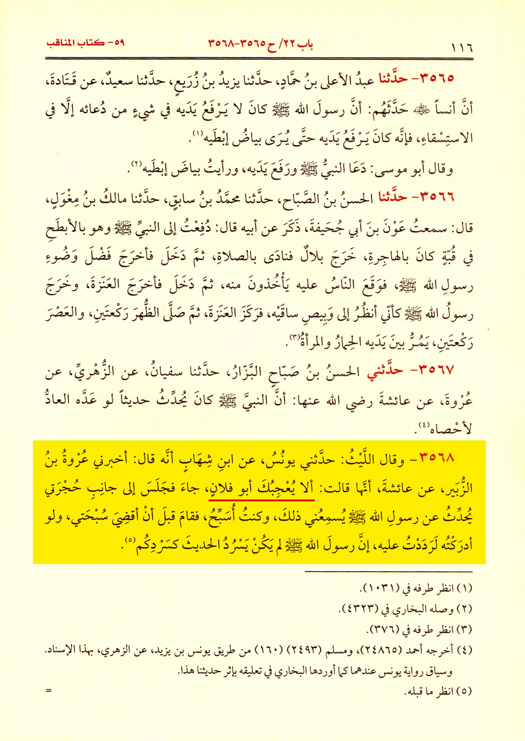 بينما روى البخاريُّ في صحيحه: (وقال الليث: حدثني يونس، عن ابن شهاب أنه قال: أخبرني عروة بن الزبير، عن عائشة أنها قالت: «ألا يعجبك أبو فلان؟! جاء فجلس إلى جانب حجرتي، يحدث عن رسول الله صلّى الله عليه وسلّم، يسمعني ذلك، وكنت أسبِّحُ فقام قبل أن أقضي سبحتي، ولو أدركته لرددت عليه، إن رسول الله صلّى الله عليه وسلّم لم يكن يسرد الحديث كسردكم»).