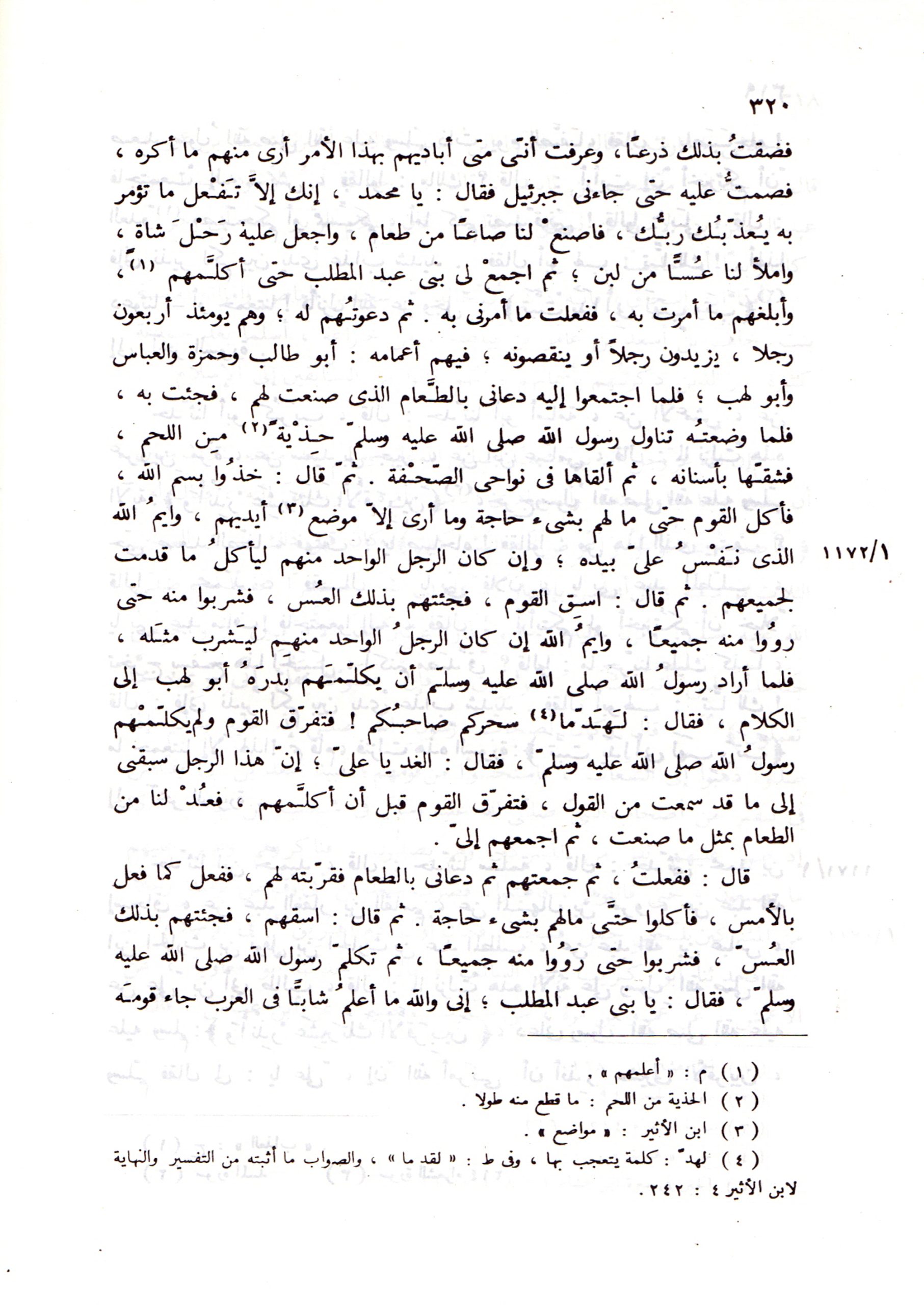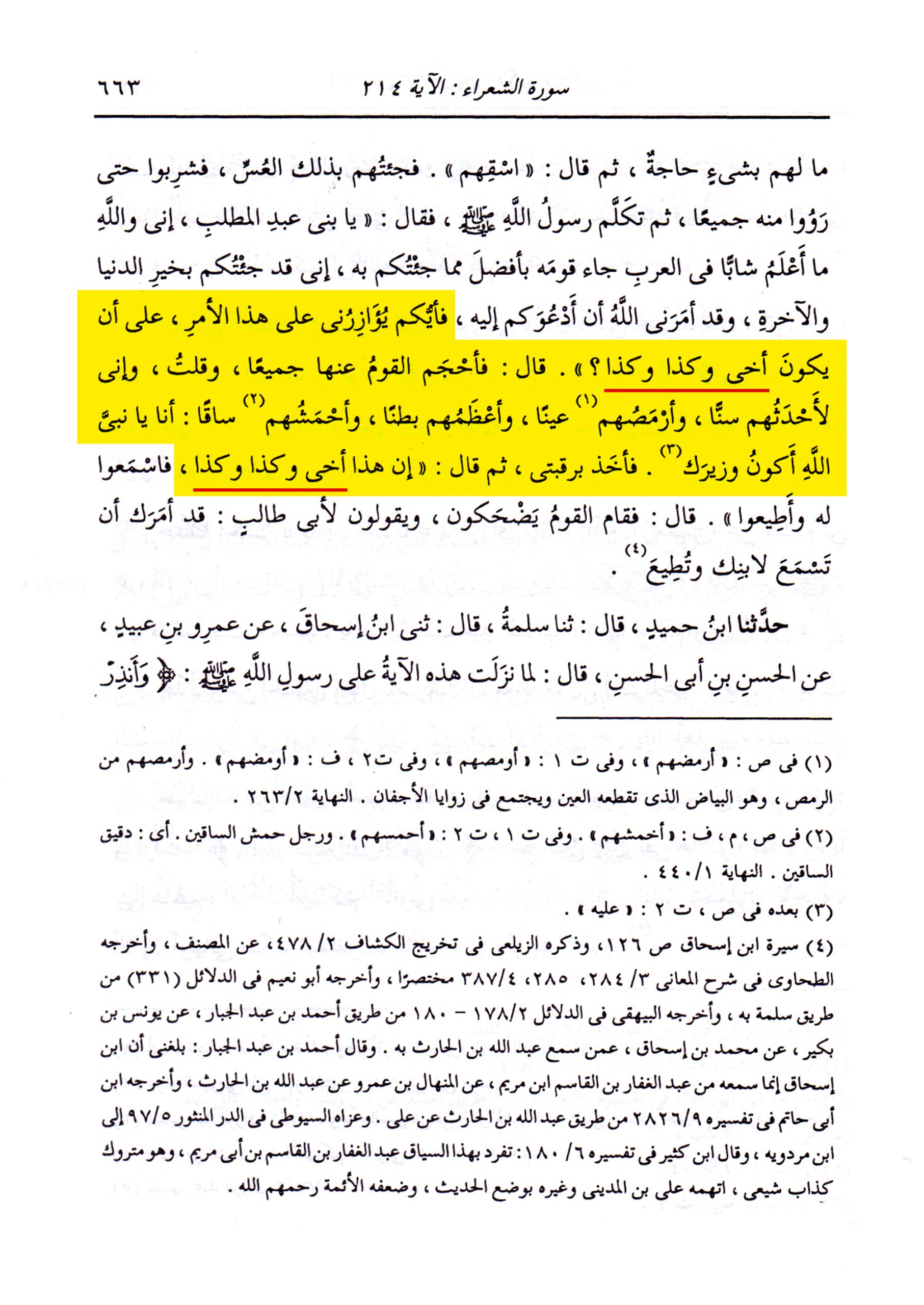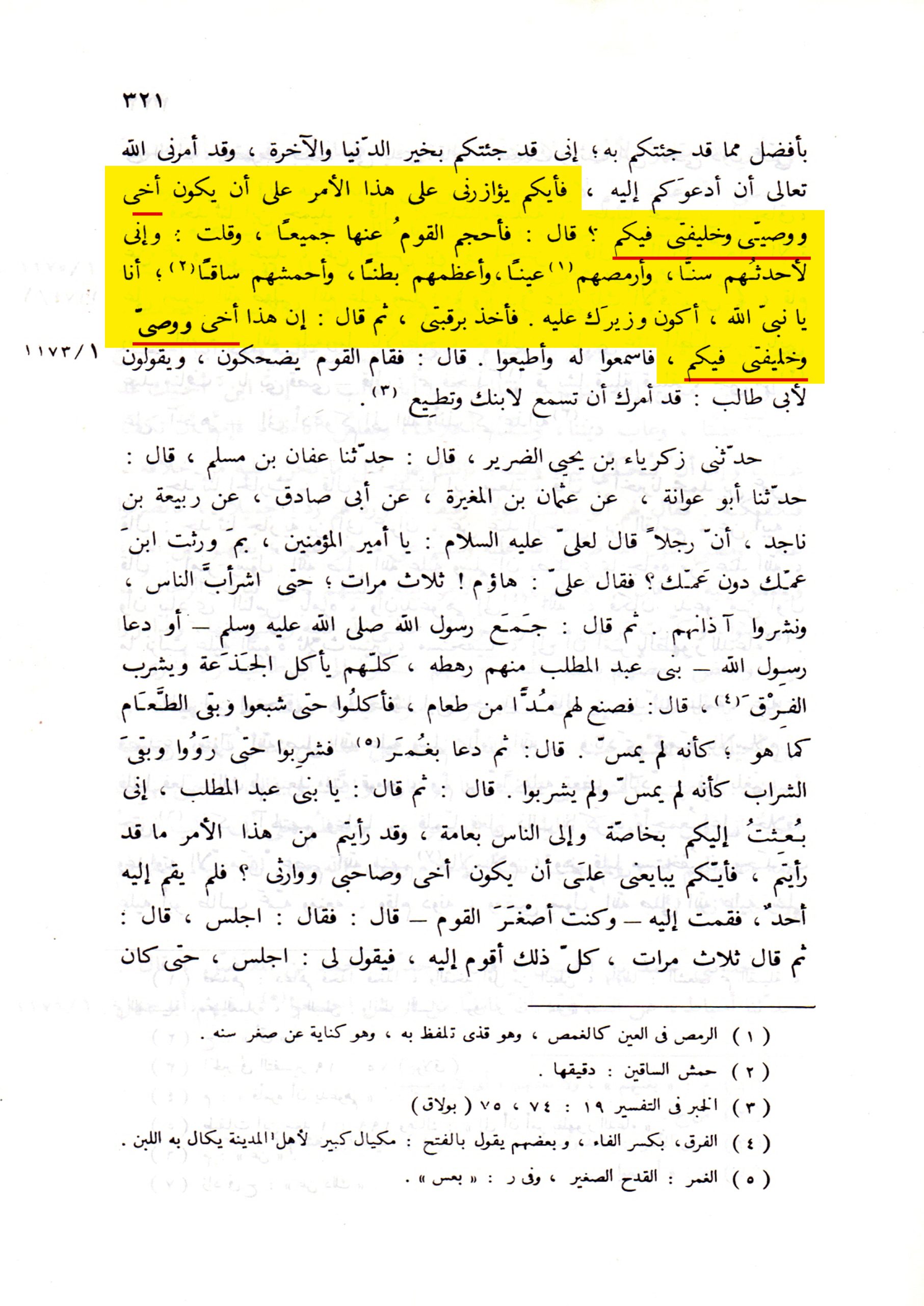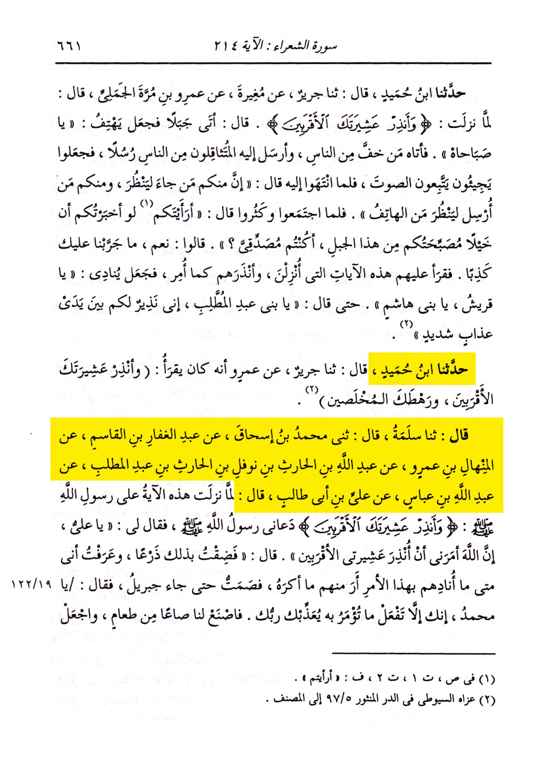 روى الطبري حديث الدَّارِ في كتابيه (التاريخ) و(التفسير)، وقَد جاء الحديث في كتاب «التاريخ» بهذا اللفظ: (فأيكم يؤازرني على هذا الأمر على أن يكون أخي ووصيي وخليفتي فيكم؟) وفيه أيضاً قول النبي صلّى الله عليه وآله عن أمير المؤمنين علي عليه السّلام: (إنَّ هذا أخي ووصيي وخليفتي فيكم) ولكنَّه في كتاب (التفسير) جاء بلفظ محرَّف مع أنَّ المؤلف نفسه والإسناد نفسه لم يتغيَّر، واللفظ المحرَّف هو: (فأيكم يؤازرني على هذا الأمر، على أن يكون أخي وكذا وكذا؟) أما كلام النبي صلى الله عليه وآله للإمام علي عليه السّلام فقد أصبح بهذا النحو: (إن هذا أخي وكذا وكذا)، فحُذِفَ ما يُشير إلى خلافة أمير المؤمنين عليه السّلام وكونه وصيّاً وخليفةً للنبي الأكرم صلّى الله عليه وآله