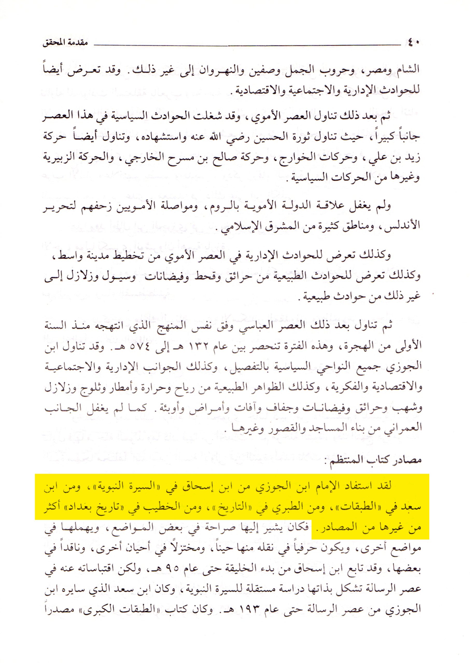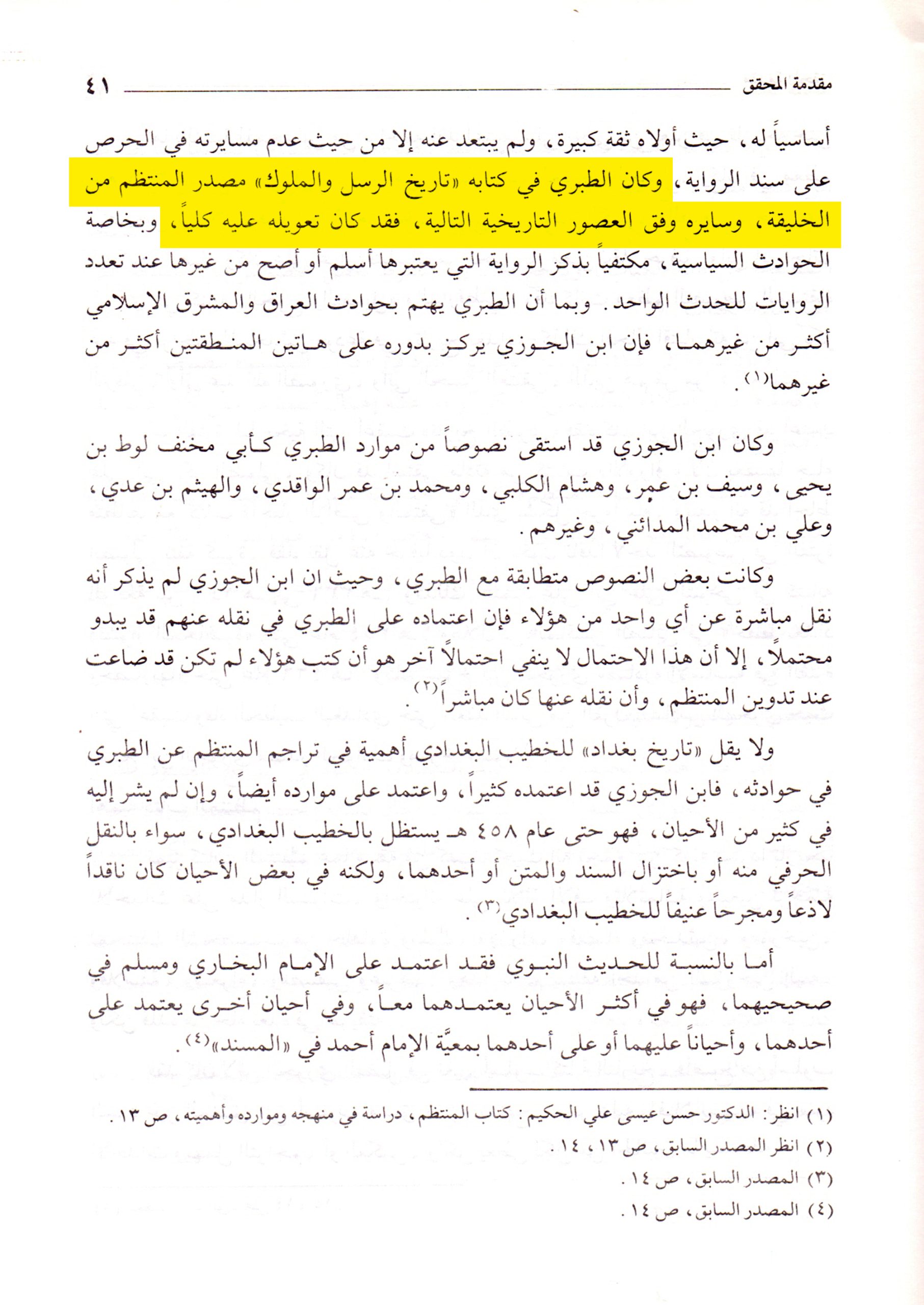 ولا يخفى أنَّ ابن الجوزيّ قد اعتمدَ بشكلٍ أساسي على كتاب (تاريخ الطبريّ)، وفي ذلك يقول محققا الكتاب: (لقد استفاد الإمام ابن الجوزي من ابن إسحاق في «السيرة النبويّة»، ومن ابن سعد في «الطبقات»، ومن الطبري في «التاريخ»، ومن الخطيب في «تاريخ بغداد» أكثر من غيرها من المصادر)، وقالا أيضاً: (وكان الطبري في كتابه «تاريخ الرسل والملوك» مصدر «المنتظم» من الخليقة، وسايره وفق العصور التاريخية التالية، فقد كان تعويله عليه كلياً).