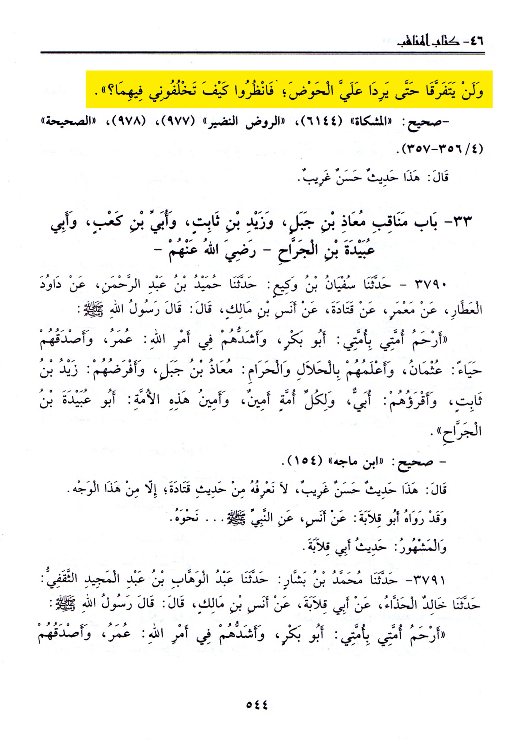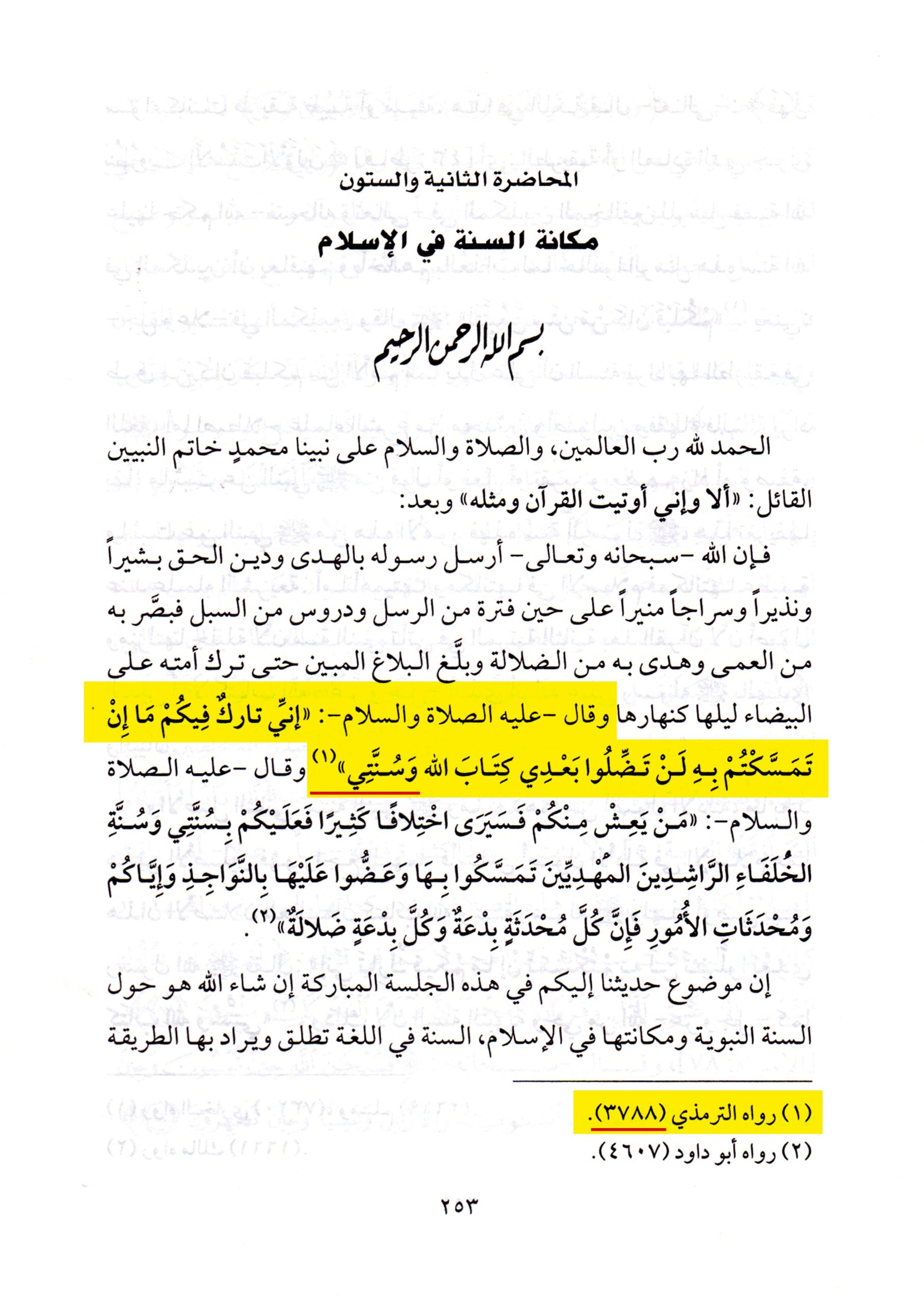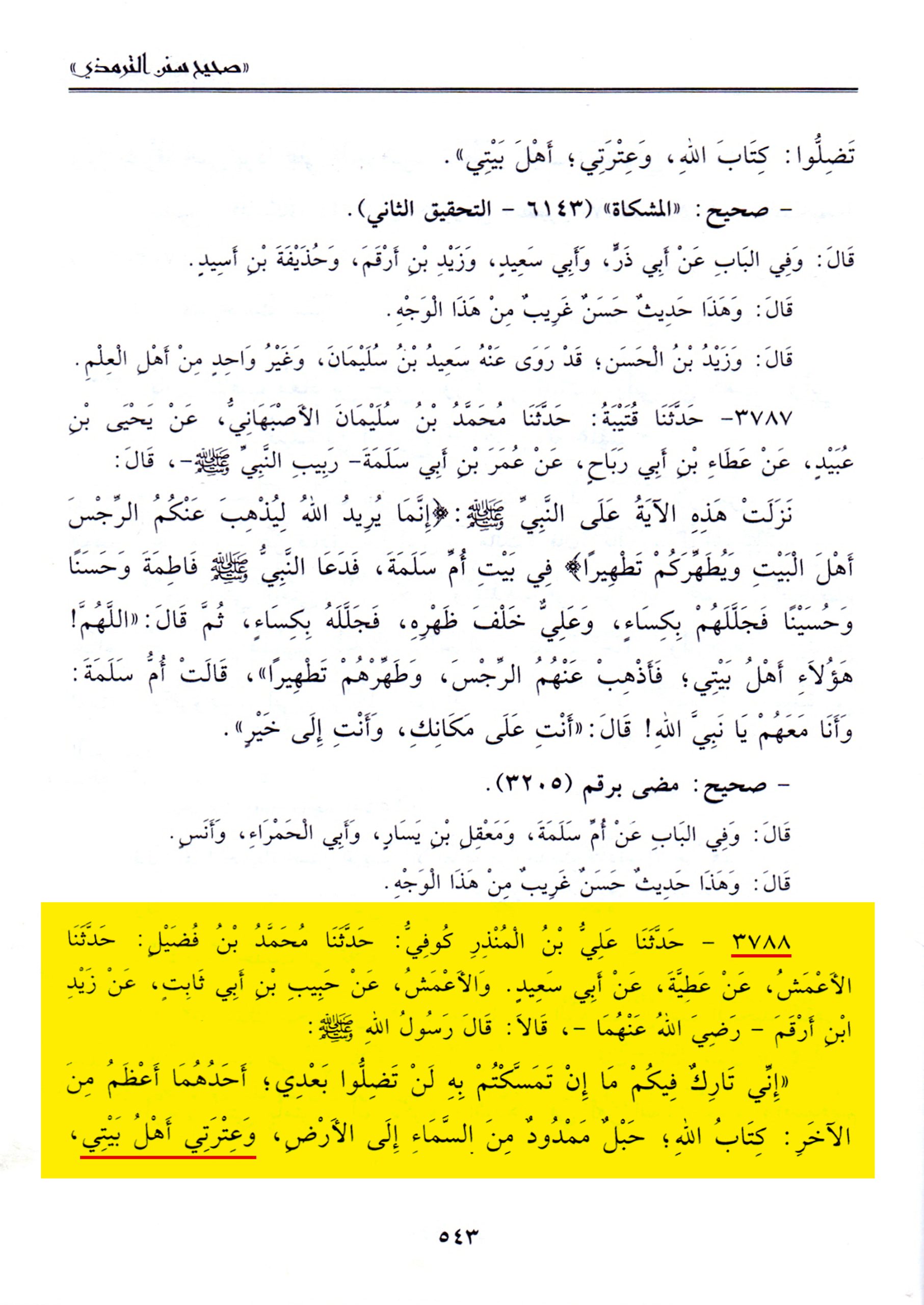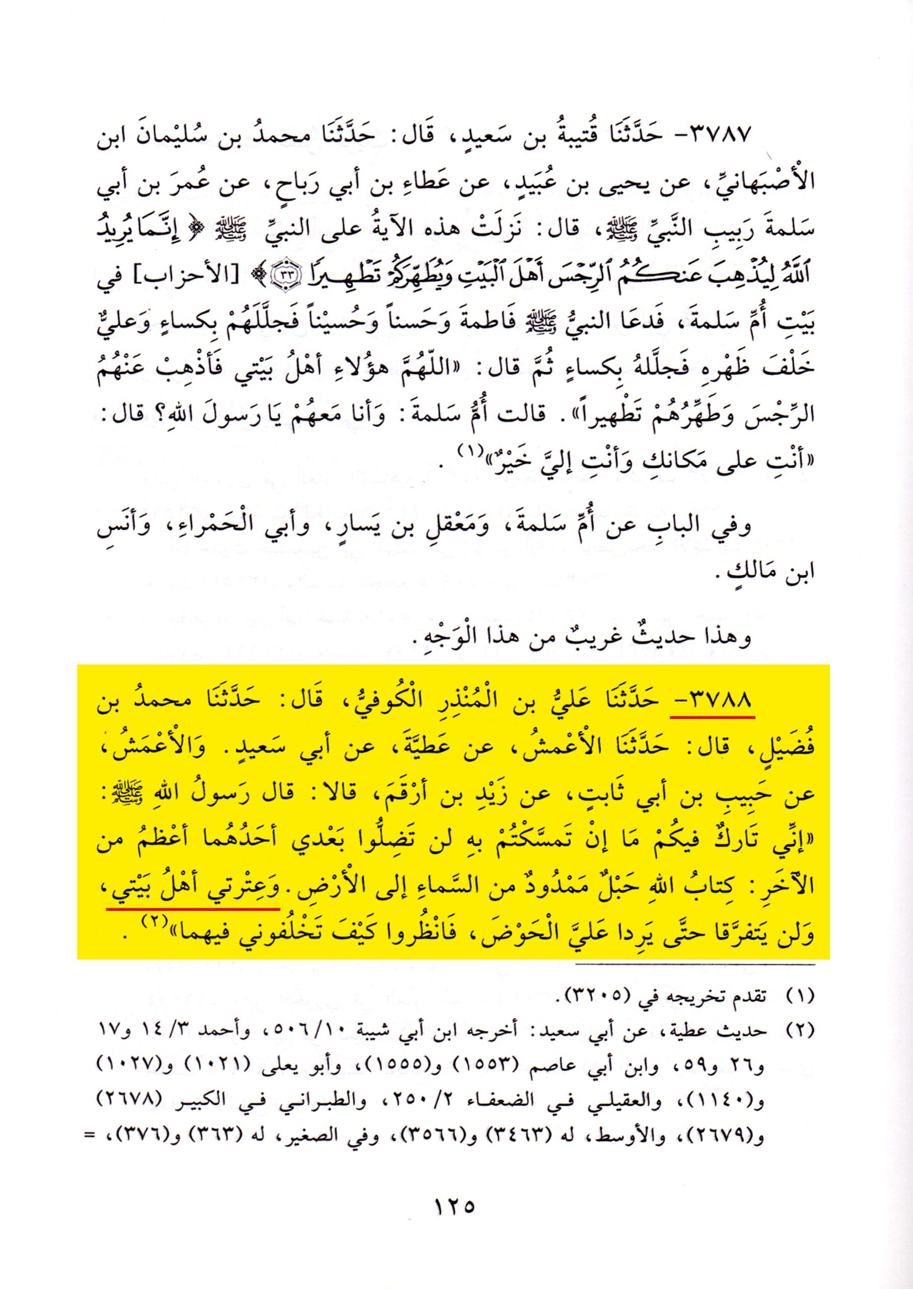 ذكر الشيخُ صالح الفوزان في كتابه (محاضرات في العقيدة والدعوة، ج٤، ص٢٥٣) حديثَ الثقلين وبيَّنَ أنّه نقلهُ عن سُنن الترمذي (رقم الحديث ٣٧٨٨) كما أشار إلى ذلك في الهامش، ولكنَّه حرَّف هذا الحديث الشريف إذ الموجود في سنن الترمذي بهذا الرقم هو حديث الثقلين بلفظ «وعترتي أهل بيتي»، فتحولت عبارة «وعترتي أهل بيتي» إلى «وسنتي»، والجديرُ بالذكر أنّه ليس في كل سنن الترمذي رواية لحديث الثقلين باللفظ الذي زعمه الشيخ الفوزان.