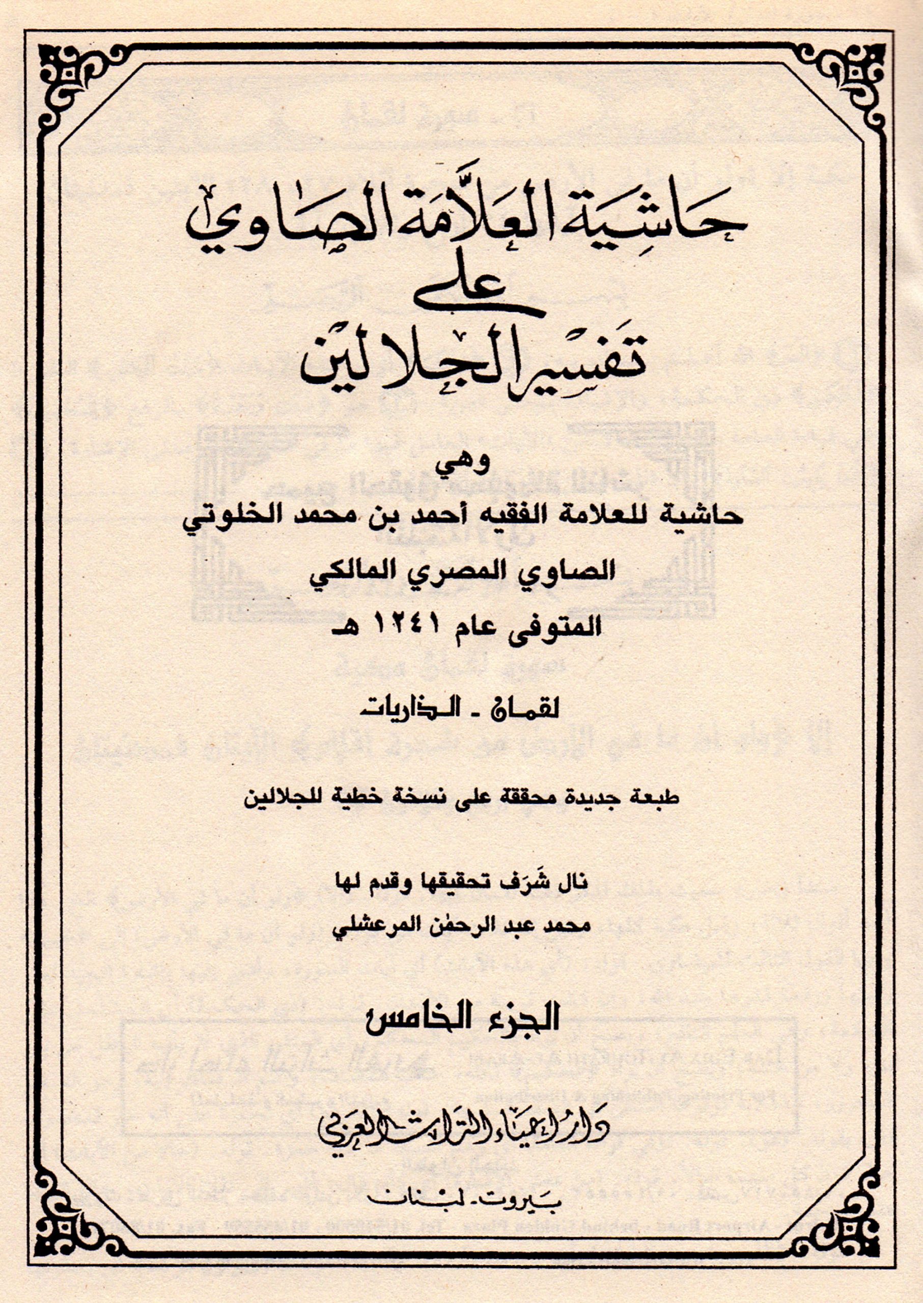 [2] حاشية الصاوي على تفسير الجلالين، ج5، ص78، تحقيق: محمد عبد الرحمن المرعشلي، الناشر: دار إحياء التراث العربي، الطبعة: الأولى، 1434 هـ/2013م.