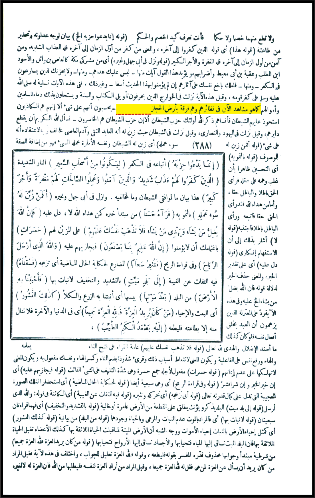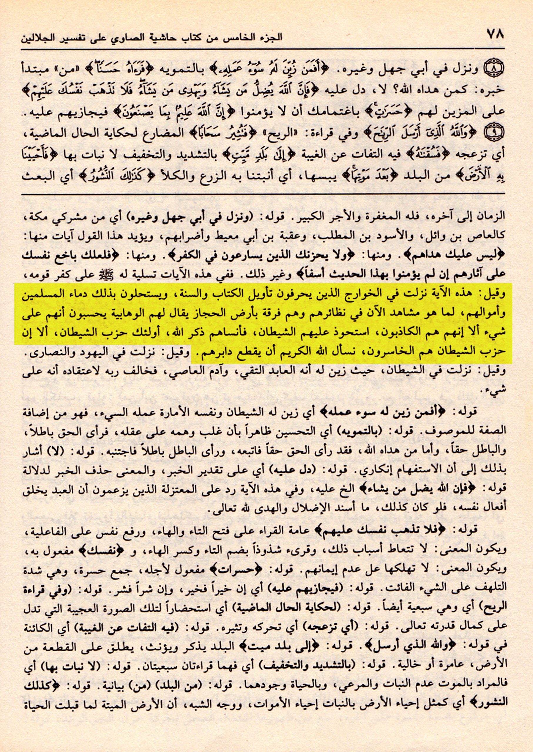 كتب الشيخ أحمدُ الصاويّ المالكي في حاشيته على تفسير الجلالين عند تفسير «سورة فاطر» ما نصُّه: (وقيلَ: هذه الآية نزلتْ في الخوارج الذين يُحرّفون تأويل الكتاب والسنَّةِ ويستحلُّون بذلك دماء المسلمين وأموالهم، كما هُوَ مُشَاهَدٌ الآن فِي نَظائرِهم وهُم فِرقةٌ بأرض الحجاز يقال لهم «الوهابية»، يحسبون أنّهم على شيءٍ ألا إنَّهُم هم الكاذبون، استحوذَ عليهم الشيطان فأنساهُم ذكر الله، أولئك حزبُ الشيطان ألا إنَّ حزبَ الشيطانِ هُم الخاسرون، نسألُ الله الكريم أن يقطعَ دابرَهُمْ).