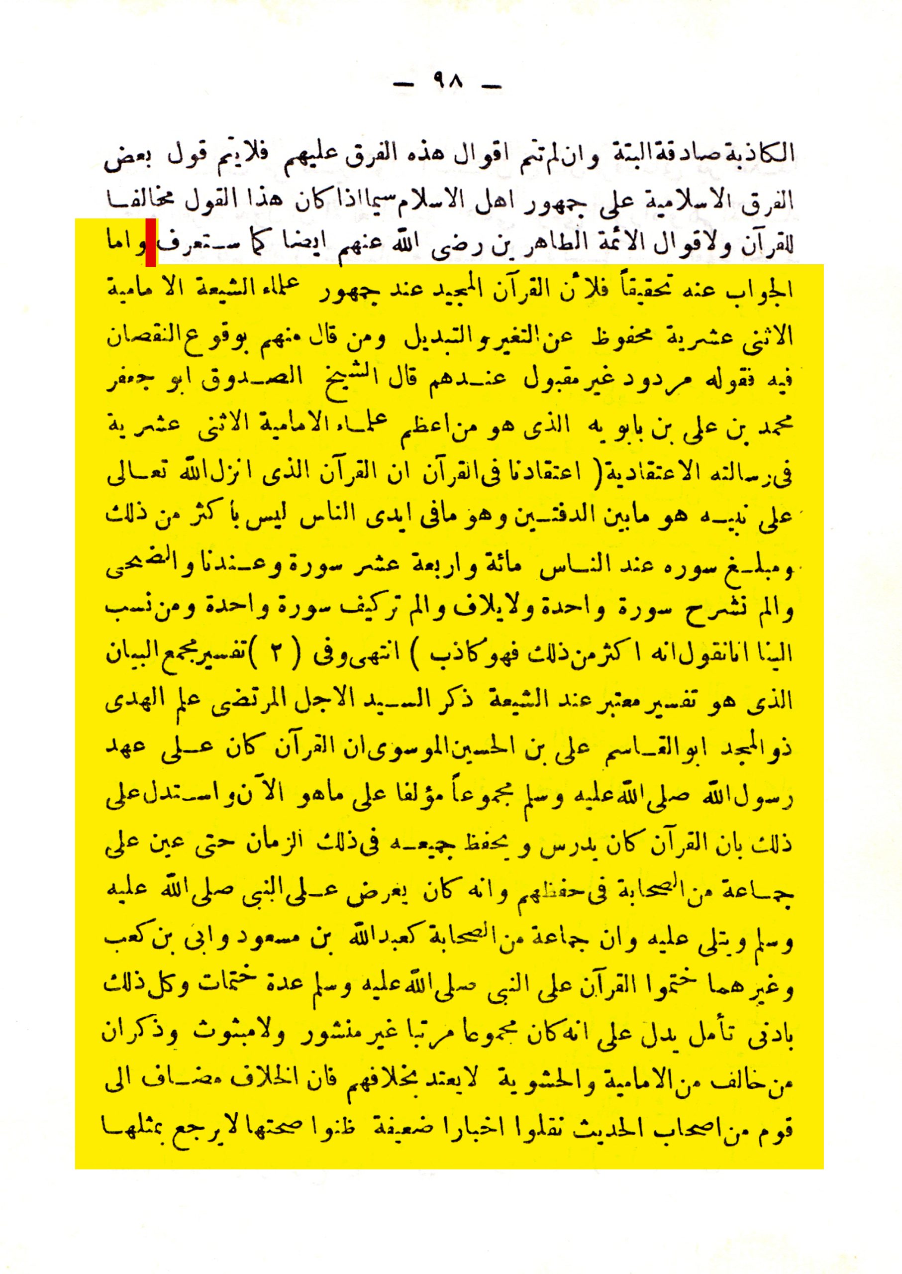 وفي المقام، سنعرضُ عدَّةَ طبعاتٍ أثبتت النص الأصلي بالإضافة إلى الطبعة المحرَّفةِ، وما هو ملونٌ باللون الأصفر في كل الطبعات تمَّ حذفه كاملاً في طبعة (الرئاسة العامة للبحوث العلمية والإفتاء في السعودية)، وليطالع القارئ الكلامَ قبل النص المحذوف وبعده في الطبعات الصحيحة ليلاحظ موضع الحذفِ في الطبعة السعودية المحرَّفة.