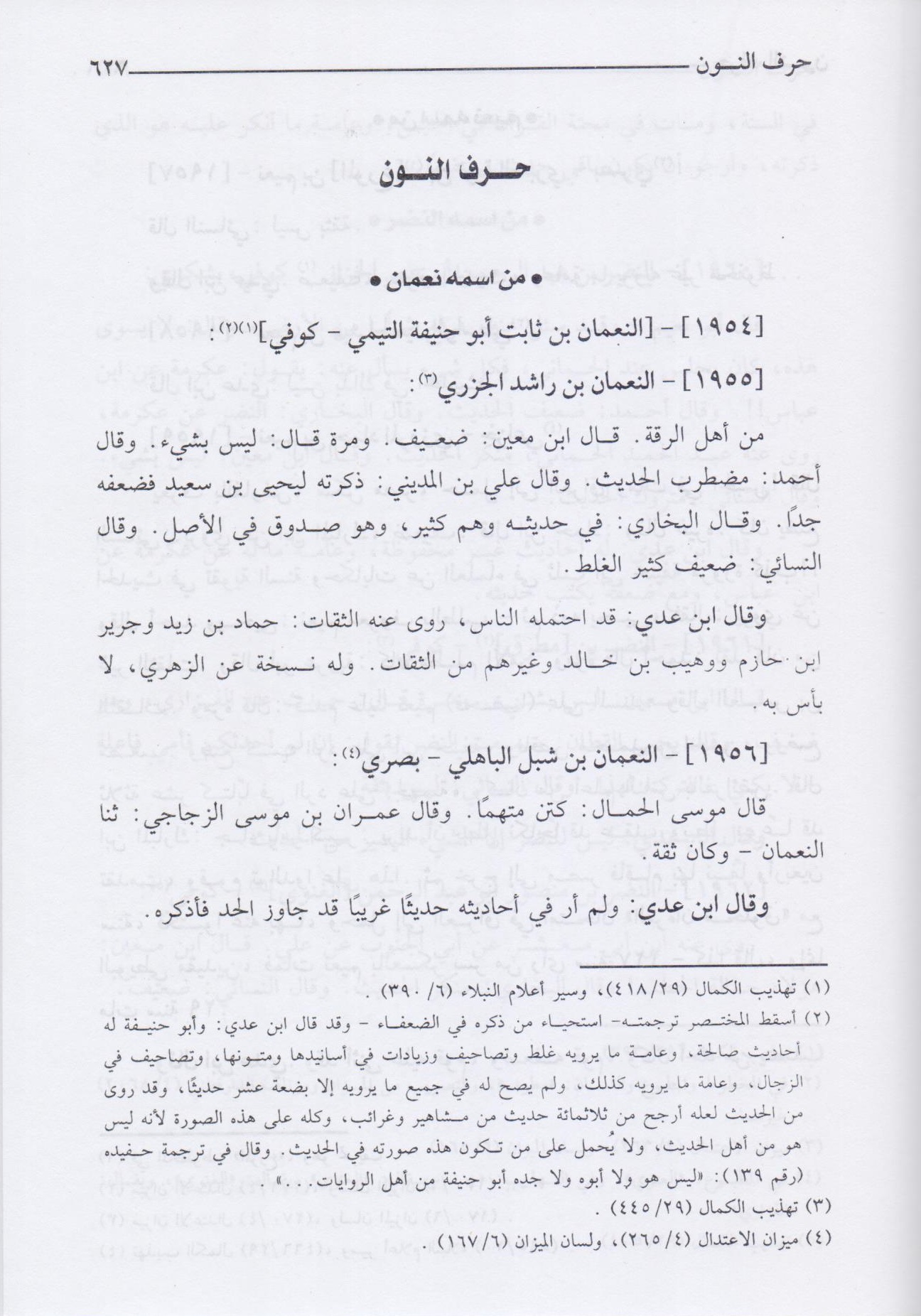 صنّف المؤرِّخ تقي الدّين أحمد بن علي المقريزيّ كتاباً اختصر فيه كتاب (الكامل في الضعفاء) للحافظ ابن عديّ الجرجانيّ، وقد التزم في مقدّمة كتابه بأن يذكر التراجم مُلخَّصةً دون إيراد الأسانيد الكثيرة، وإنما يقتصر في ذلك على ما قيل في الرواة على سبيل الإيجاز، فقال في مقدمته: (فإن الحافظ أبا أحمد عبد الله بن عدي – سقى الله جدثه صيب الغفران، وبوأه بحبوحة دار الأمان – قد أملى كتابه «الكامل في علل الحديث وأسماء المجروحين من الرواة»، وأشحنه بكثرة الأسانيد، فأحببت أن ألخص منه ما قيل في الرواة على سبيل الإيجاز، وحذفتُ علل الحديث إلا إذا احتيج إليها، وأضربت عن ذكر الأسانيد إلا أن تدعو الضرورة إليها)، ولكنّه عندما وصل إلى ترجمة أبي حنيفة النعمان قام بحذفها، ولم يقم بتلخيصها، وذلك لأنّ ابن عديّ قد أكثر من إيراد الروايات التي تقدحُ في أبي حنيفة، وقد ختمها بتضعيفه في الحديث، فلم ينقل المقريزي من ذلك شيئاً، وقد تعقّبهُ محقق كتابه أيمن بن عارف الدمشقيّ، فقال: (أسقط المُختصِرُ ترجمته استحياءً من ذكره في الضعفاء، وقد قال ابن عديّ: «وأبو حنيفة له أحاديث صالحة، وعامّةُ ما يرويه غلط وتصاحيف وزيادات في أسانيدها ومتونها وتصاحيف في الرجال، وعامة ما يرويه كذلك، ولم يصحّ له في جميع ما يرويه إلا بضعة عشر حديثاً، وقد روى من الحديث لعله أرجح من ثلاثمئة حديث من مشاهير وغرائب، وكله على هذه الصورة؛ لأنه ليس هو من أهل الحديث، ولا يحمل على من تكون هذه صورته في الحديث»، وقال في ترجمة حفيده: «ليس هو ولا أبوه ولا جدّه أبو حنيفة من أهل الروايات…»)، انتهى