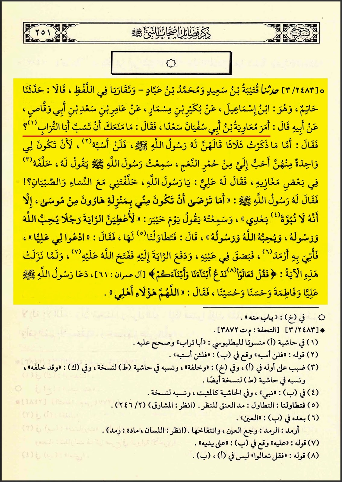 روى مسلم في صحيحه (ج٦، ص٢٥١، رقم الحديث ٢٤٨٣، الناشر: دار التأصيل): (حدثنا قتيبة بن سعيد، ومحمد بن عباد – وتقاربا في اللفظ – قالا: حدثنا حاتم وهو ابن إسماعيل، عن بكير بن مسمار، عن عامر بن سعد بن أبي وقاص، عن أبيه، قال: أمر معاوية بن أبي سفيان سعداً، فقال: ما منعك أن تسب أبا التراب؟ فقال: أما ما ذكرت ثلاثاً قالهن له رسول الله صلى الله عليه وسلم فلن أسبه، لأن تكون لي واحدة منهن أحب إلي من حمر النعم، سمعت رسول الله صلى الله عليه وسلم يقول له، خلفه في بعض مغازيه، فقال له علي: يا رسول الله خلفتني مع النساء والصبيان؟ فقال له رسول الله صلى الله عليه وسلم: «أما ترضى أن تكون مني بمنزلة هارون من موسى؟ إلا أنه لا نبوة بعدي» وسمعته يقول يوم خيبر: «لأعطين الراية رجلاً يحب الله ورسوله، ويحبه الله ورسوله» قال: فتطاولنا لها فقال: «ادعوا لي علياً» فأتي به أرمد، فبصق في عينه ودفع الراية إليه ففتح الله عليه، ولما نزلت هذه الآية: (فقل تعالوا ندع أبناءنا وأبناءكم) دعا رسول الله صلى الله عليه وسلم علياً وفاطمة وحسناً وحسيناً، فقال: «اللهم هؤلاء أهلي»).