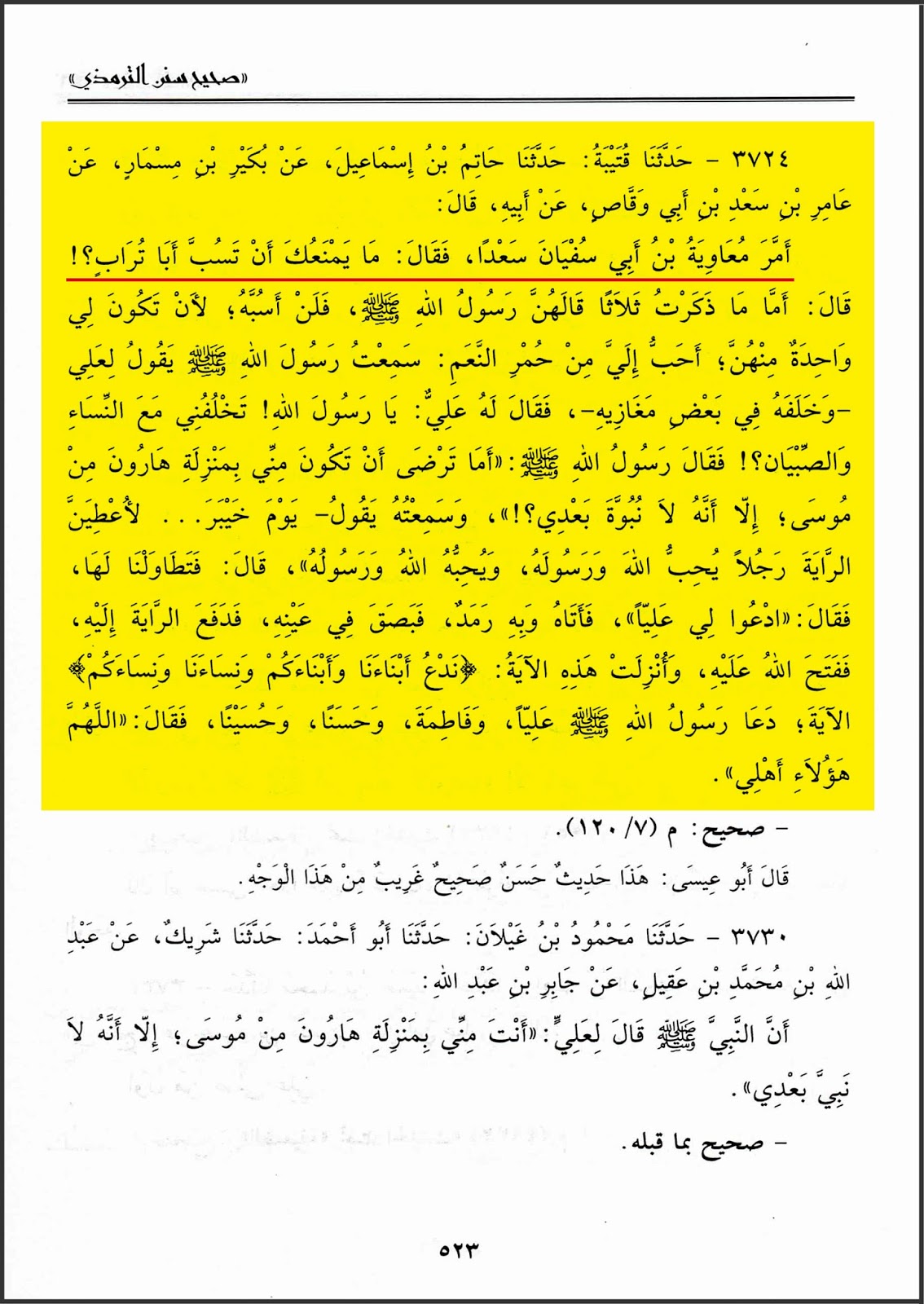 وروى الترمذي في سننه: (حدثنا قتيبة، حدثنا حاتم بن إسماعيل، عن بكير بن مسمار، عن عامر بن سعد بن أبي وقاص، عن أبيه، قال: أمر معاوية بن أبي سفيان سعداً، فقال: ما يمنعك أن تسب أبا تراب؟ قال: أما ما ذكرت ثلاثاً قالهن رسول الله صلى الله عليه وسلم فلن أسبه، لأن تكون لي واحدة منهن أحب إلي من حمر النعم، سمعت رسول الله صلى الله عليه وسلم يقول لعلي وخلفه في بعض مغازيه فقال له علي: «يا رسول الله تخلفني مع النساء والصبيان؟» فقال رسول الله صلى الله عليه وسلم: «أما ترضى أن تكون مني بمنزلة هارون من موسى إلا أنه لا نبوة بعدي» وسمعته يقول يوم خيبر: «لأعطين الراية رجلاً يحب الله ورسوله ويحبه الله ورسوله» قال: فتطاولنا لها، فقال: «ادعوا لي علياً» فأتاه وبه رمَدٌ، فبصق في عينه فدفع الراية إليه ففتح الله عليه، وأنزلت هذه الآية (ندعُ أبناءنا وأبناءكم ونساءنا ونساءكم) الآية، دعا رسول الله صلى الله عليه وسلم علياً وفاطمة وحسناً وحسيناً فقال: «اللهم هؤلاء أهلي»)، انظر: صحيح سنن الترمذي للألباني، ج٣، ص٥٢٣، رقم الحديث ٣٧٢٤.