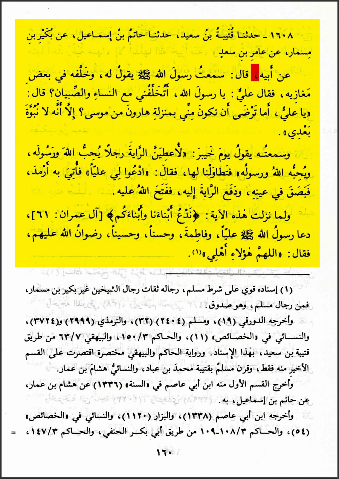 قال أحمد: (حدثنا قتيبة بن سعيد، حدثنا حاتم بن إسماعيل، عن بكير بن مسمار عن عامر بن سعد، عن أبيه، قال: سمعت رسول الله صلى الله عليه وسلم يقول له وخلفه في بعض مغازيه، فقال علي: يا رسول الله، أتخلفني مع النساء والصبيان؟ قال: «يا علي، أما ترضى أن تكون مني بمنزلة هارون من موسى إلا أنه لا نبوة بعدي» وسمعته يقول يوم خيبر: «لأعطين الراية رجلاً يحب الله ورسوله، ويحبه الله ورسوله» فتطاولنا لها، فقال: «ادعوا لي علياً» فأتي به أرمد، فبصق في عينه، ودفع الراية إليه، ففتح الله عليه. ولما نزلت هذه الآية: (ندع أبناءنا وأبناءكم) دعا رسول الله صلى الله عليه وسلم علياً وفاطمة وحسناً وحسيناً رضوان الله عليهم، فقال: «اللهم هؤلاء أهلي»)، انظر: مسند أحمد بن حنبل، ج٣، ص١٦٠، رقم الحديث ١٦٠٨.
