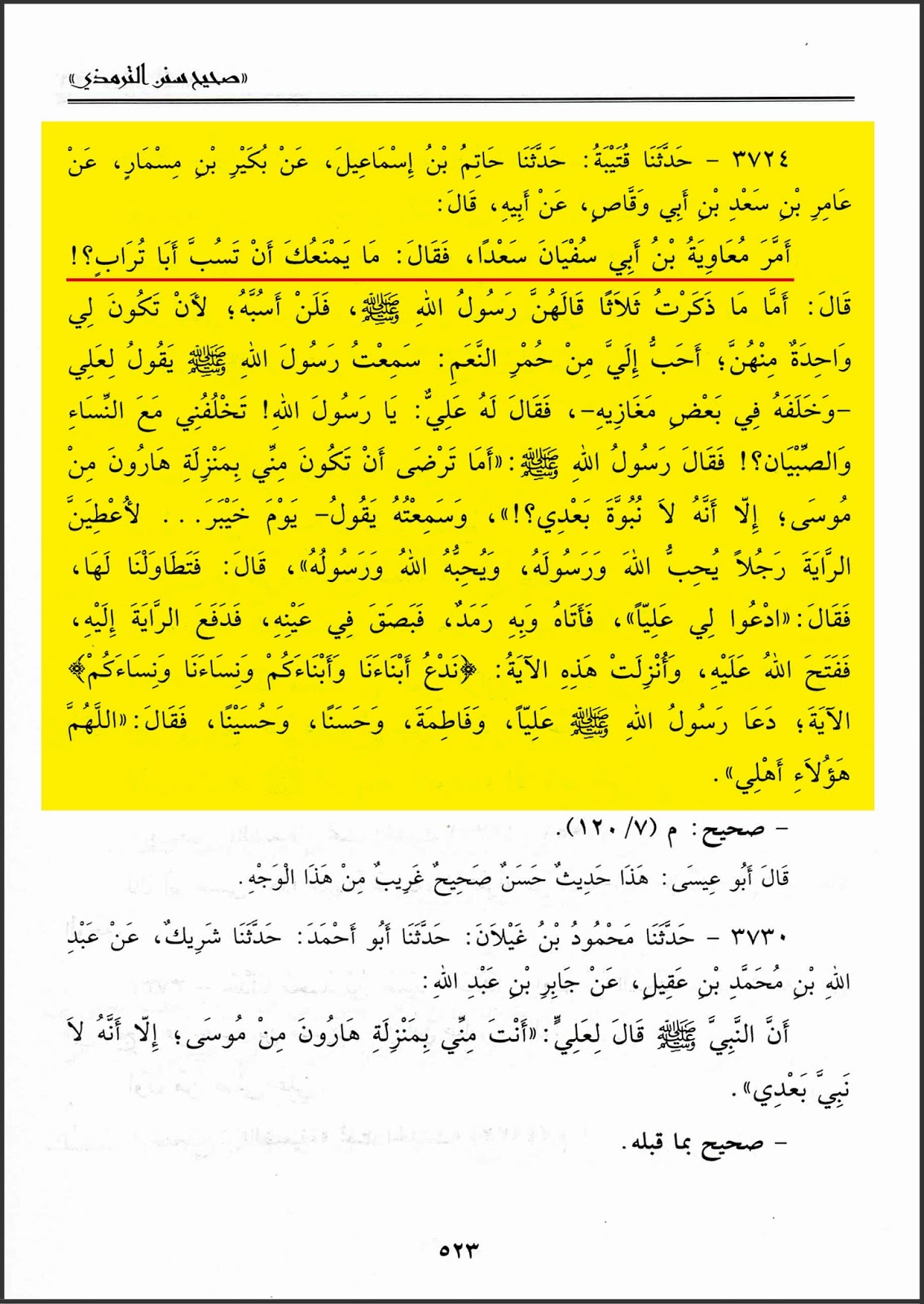 وروى الترمذي في سننه: (حدثنا قتيبة، حدثنا حاتم بن إسماعيل، عن بكير بن مسمار، عن عامر بن سعد بن أبي وقاص، عن أبيه، قال: أمر معاوية بن أبي سفيان سعداً، فقال: ما يمنعك أن تَسُبَّ أبا ترابٍ؟ قال: أما ما ذكرت ثلاثاً قالهن رسول الله صلى الله عليه وسلم فلن أسبَّه، لأن تكون لي واحدة منهن أحب إليَّ من حمر النعم ..)، انظر: صحيح سنن الترمذي للألباني، ج٣، ص٥٢٣، رقم الحديث ٣٧٢٤.