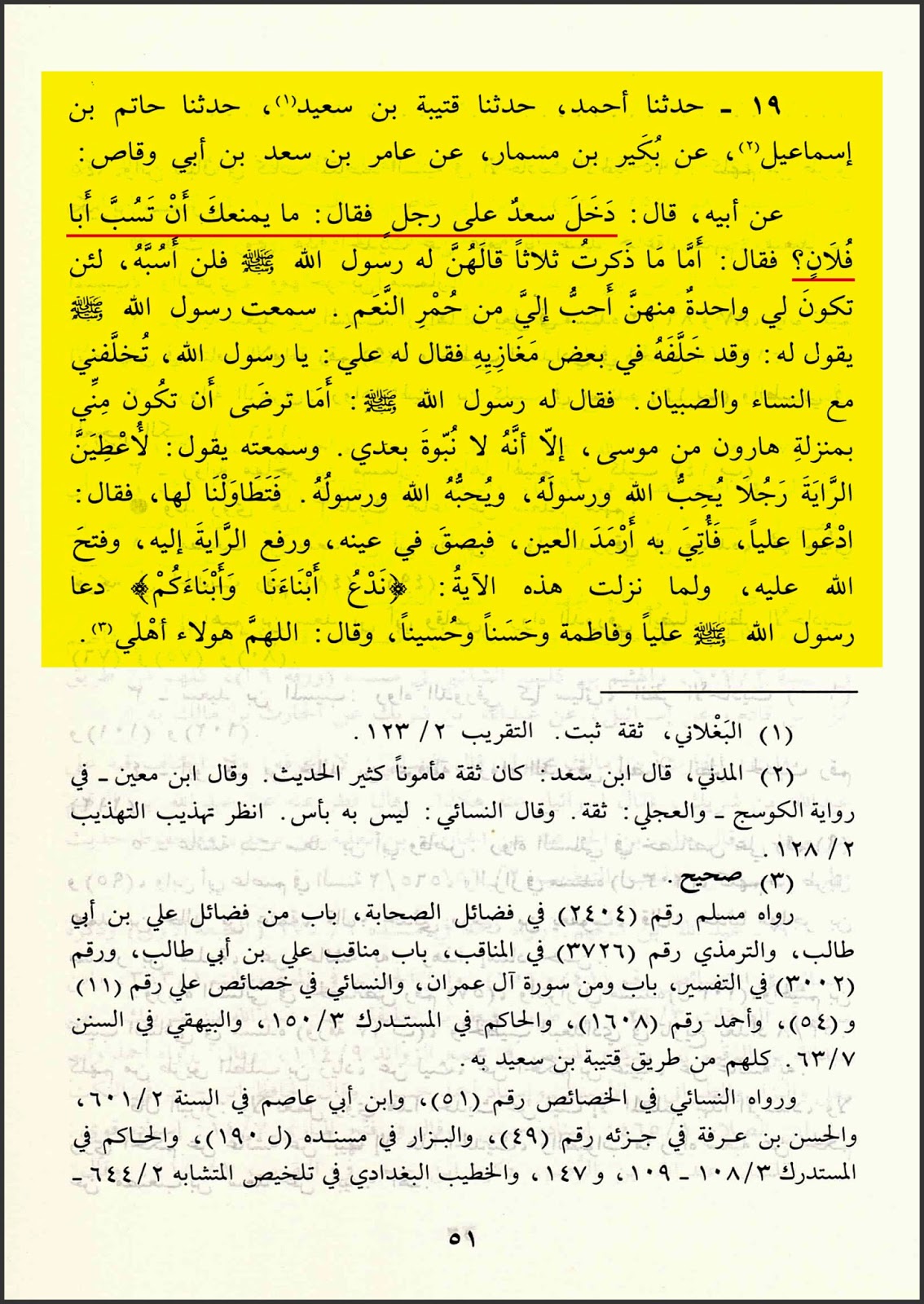 روى مسلم في صحيحه (ج٦، ص٢٥١، رقم الحديث ٢٤٨٣، الناشر: دار التأصيل): (حدثنا قتيبة بن سعيد ومحمد بن عبَّاد – وتقاربا في اللفظ – قالا: حدثنا حاتم وهو ابن إسماعيل، عن بكير بن مسمار، عن عامر بن سعد بن أبي وقاص، عن أبيه، قال: أمر معاوية بن أبي سفيان سعداً، فقال: ما منعك أن تسبَّ أبا التراب؟ فقال: أما ما ذكرت ثلاثاً قالهن له رسول الله صلى الله عليه وسلم فلن أسبَّه، لأن تكون لي واحدة منهن أحبُّ إليَّ من حُمر النعم.. إلخ).