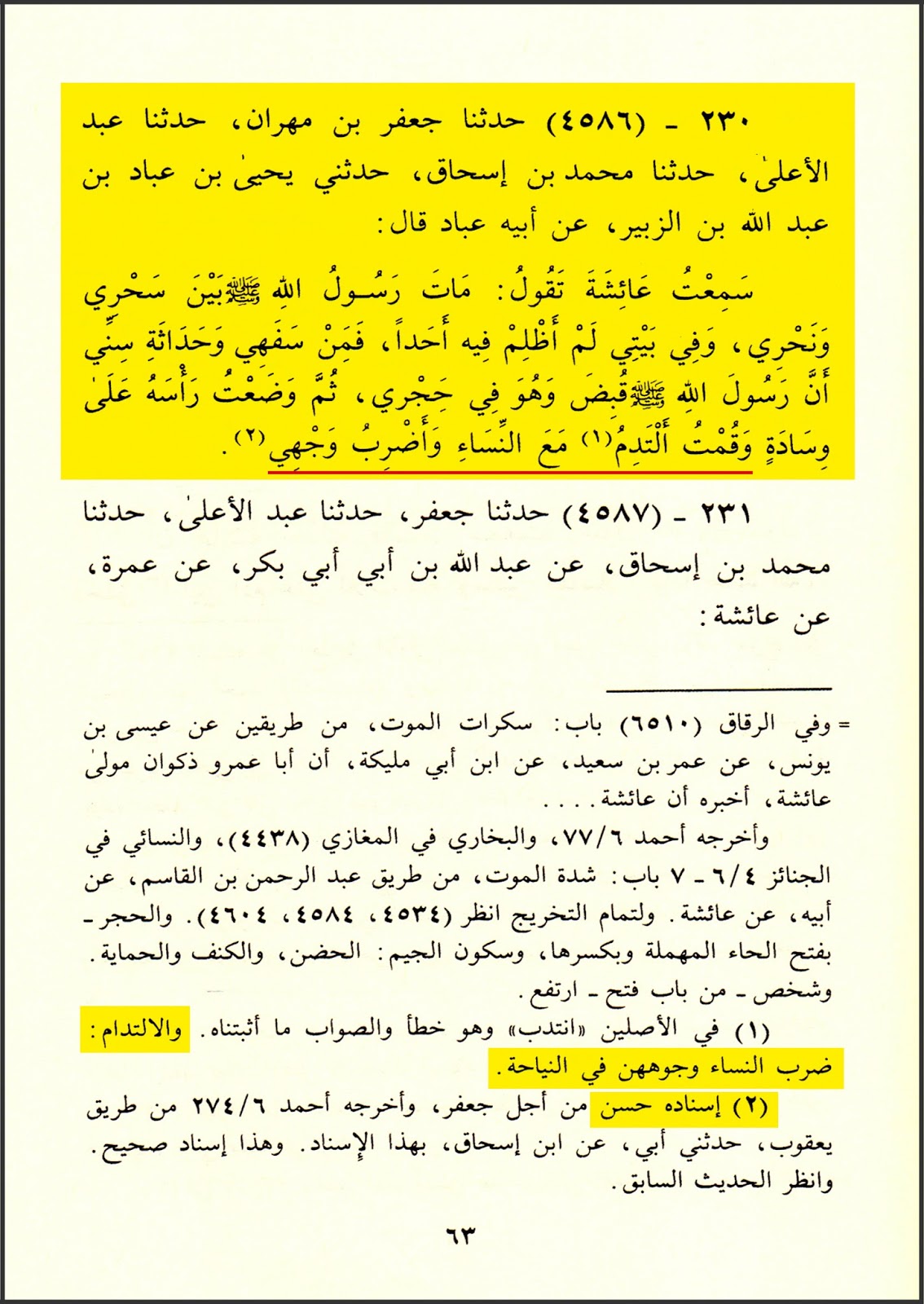 [1] روى الحافظ أبو يعلى الموصلي في مسنده (ج8، ص63، رقم الحديث 4586، تحقيق: حسين سليم أسد، الناشر: مكتبة الرشد): (حدثنا جعفر بن مهران، حدثنا عبد الأعلى، حدثنا محمد بن إسحاق، حدثني يحيى بن عباد بن عبد الله بن الزبير، عن أبيه عباد قال: سمعت عائشة تقول: مات رسول الله صلى الله عليه وسلم بين سحري ونحري، وفي بيتي لم أظلم فيه أحداً. فمن سفهي وحداثة سني أن «رسول الله صلى الله عليه وسلم قبض وهو في حجري، ثم وضعت رأسه على وسادة وقمت ألتدم مع النساء وأضرب وجهي»). [الالتدام: ضرب النساء وجوههن في النياحة].