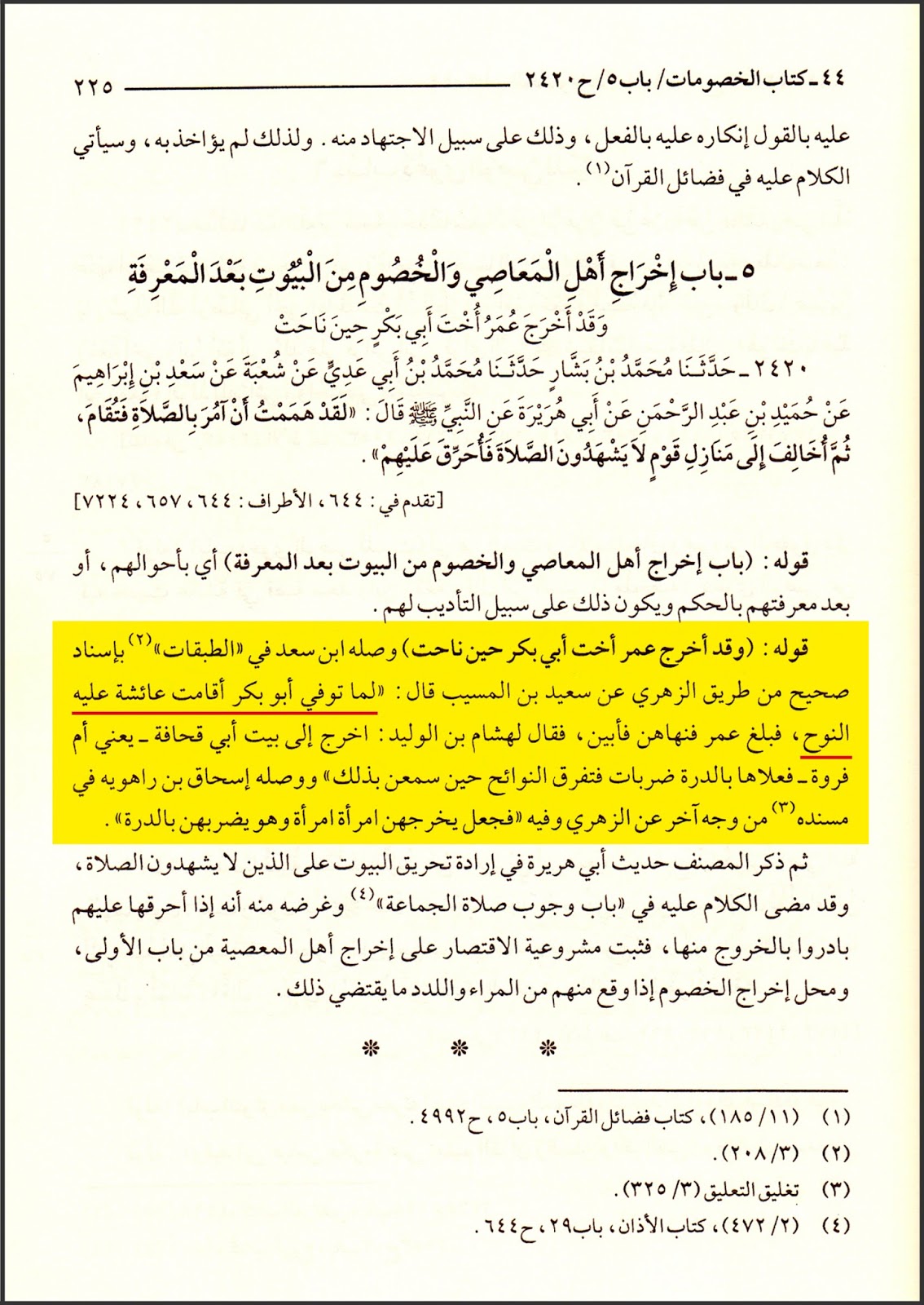 [2] قال الحافظ ابن حجر العسقلاني في كتابه (فتح الباري بشرح صحيح البخاري، ج6، ص225، الناشر: دار طيبة للنشر والتوزيع، الطبعة الثالثة 1431 هـ/2010م): (قوله: (وقد أخرج عمر أخت أبي بكر حين ناحت) وصله بن سعد في الطبقات بإسناد صحيح من طريق الزهري عن سعيد بن المسيب قال: لما توفي أبو بكر أقامت عائشة عليه النوح فبلغ عمر فنهاهن فأبين فقال لهشام بن الوليد: اخرج إلى بيت أبي قحافة يعني أم فروة فعلاها بالدرة ضربات فتفرق النوائح حين سمعن بذلك. ووصله إسحاق بن راهويه في مسنده من وجه آخر عن الزهري وفيه: فجعل يخرجهن امرأة امرأة وهو يضربهن بالدرة)