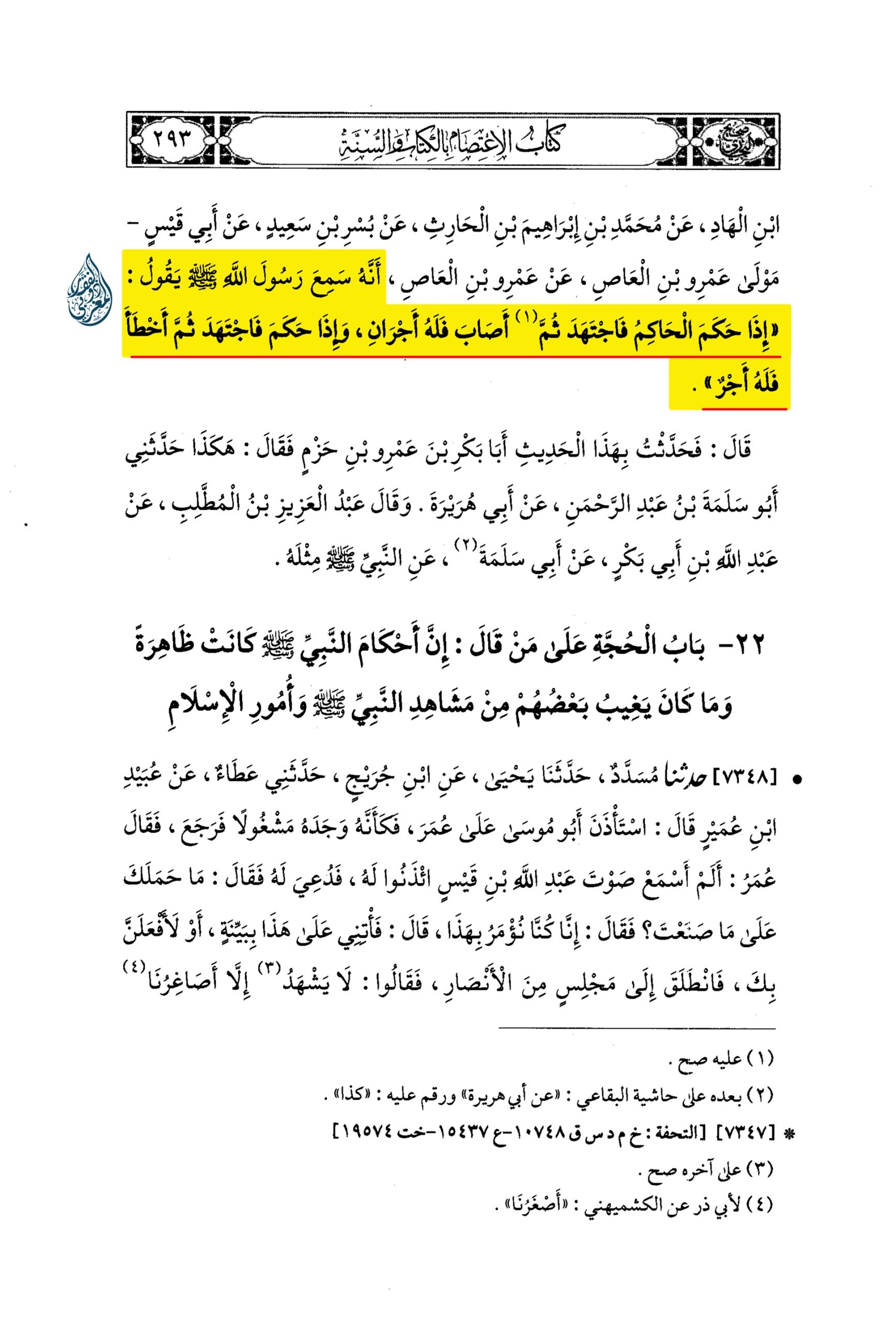«‌‌21 – بَابُ أَجْرِ الْحَاكِمِ إِذَا اجْتَهَدَ فَأَصَابَ أَوْ أَخْطَأَ