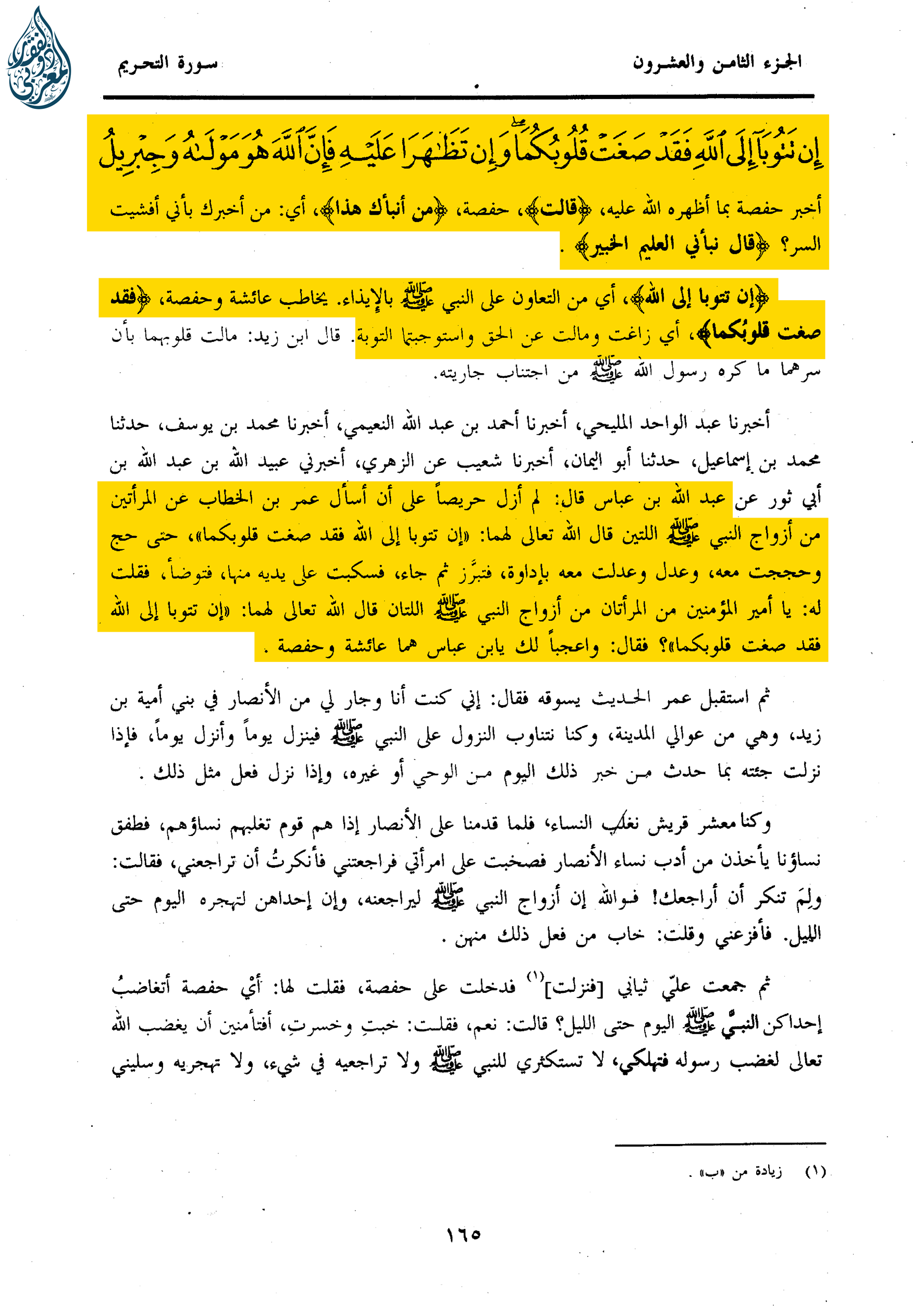 {‌إِنْ ‌تَتُوبَا ‌إِلَى ‌اللَّهِ} ‌أَيْ ‌مِنَ ‌التَّعَاوُنِ عَلَى النَّبِيِّ صلى الله عليه وسلم بِالْإِيذَاءِ. يُخَاطِبُ عَائِشَةَ وَحَفْصَةَ {فَقَدْ صَغَتْ قُلُوبُكُمَا} أَيْ زَاغَتْ وَمَالَتْ عَنِ الْحَقِّ وَاسْتَوْجَبْتُمَا التَّوْبَةَ. قَالَ ابْنُ زَيْدٍ: مَالَتْ قُلُوبُهُمَا بِأَنْ سَرَّهُمَا مَا كَرِهَ رَسُولُ اللَّهِ صلى الله عليه وسلم مِنَ اجْتِنَابِ جَارِيَتِهِ.