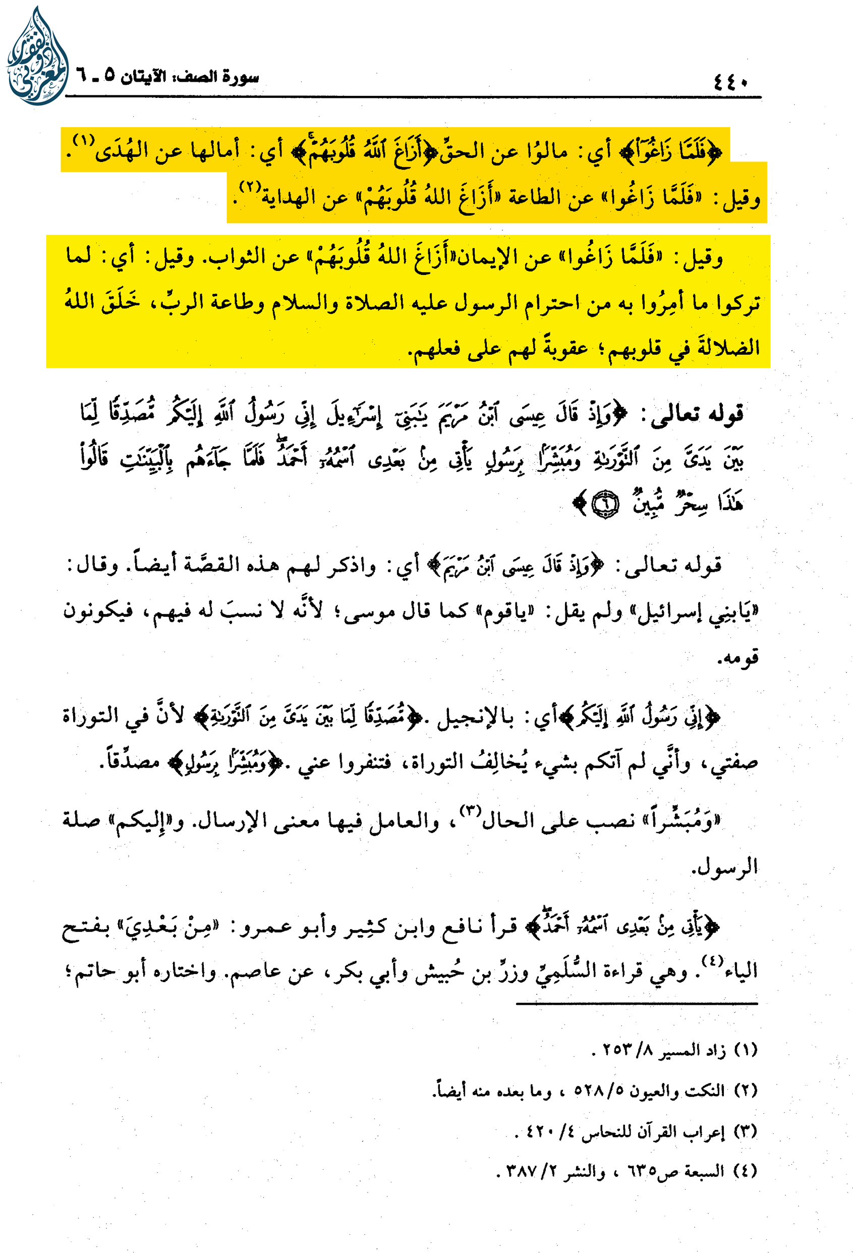 «(‌فَلَمَّا ‌زاغُوا) ‌أَيْ ‌مَالُوا ‌عَنِ ‌الْحَقِّ (أَزاغَ اللَّهُ قُلُوبَهُمْ) أَيْ أَمَالَهَا عَنِ الْهُدَى. وَقِيلَ: فَلَمَّا زاغُوا عَنِ الطَّاعَةِ أَزاغَ اللَّهُ قُلُوبَهُمْ عن الهداية وَقِيلَ: فَلَمَّا زاغُوا عَنِ الْإِيمَانِ أَزاغَ اللَّهُ قُلُوبَهُمْ عَنِ الثَّوَابِ. وَقِيلَ: أَيْ لَمَّا تَرَكُوا مَا أُمِرُوا بِهِ مِنَ احْتِرَامِ الرَّسُولِ عليه السلام وَطَاعَةِ الرَّبِّ، خَلَقَ اللَّهُ الضَّلَالَةَ فِي قلوبهم عقوبة لهم على فعلهم